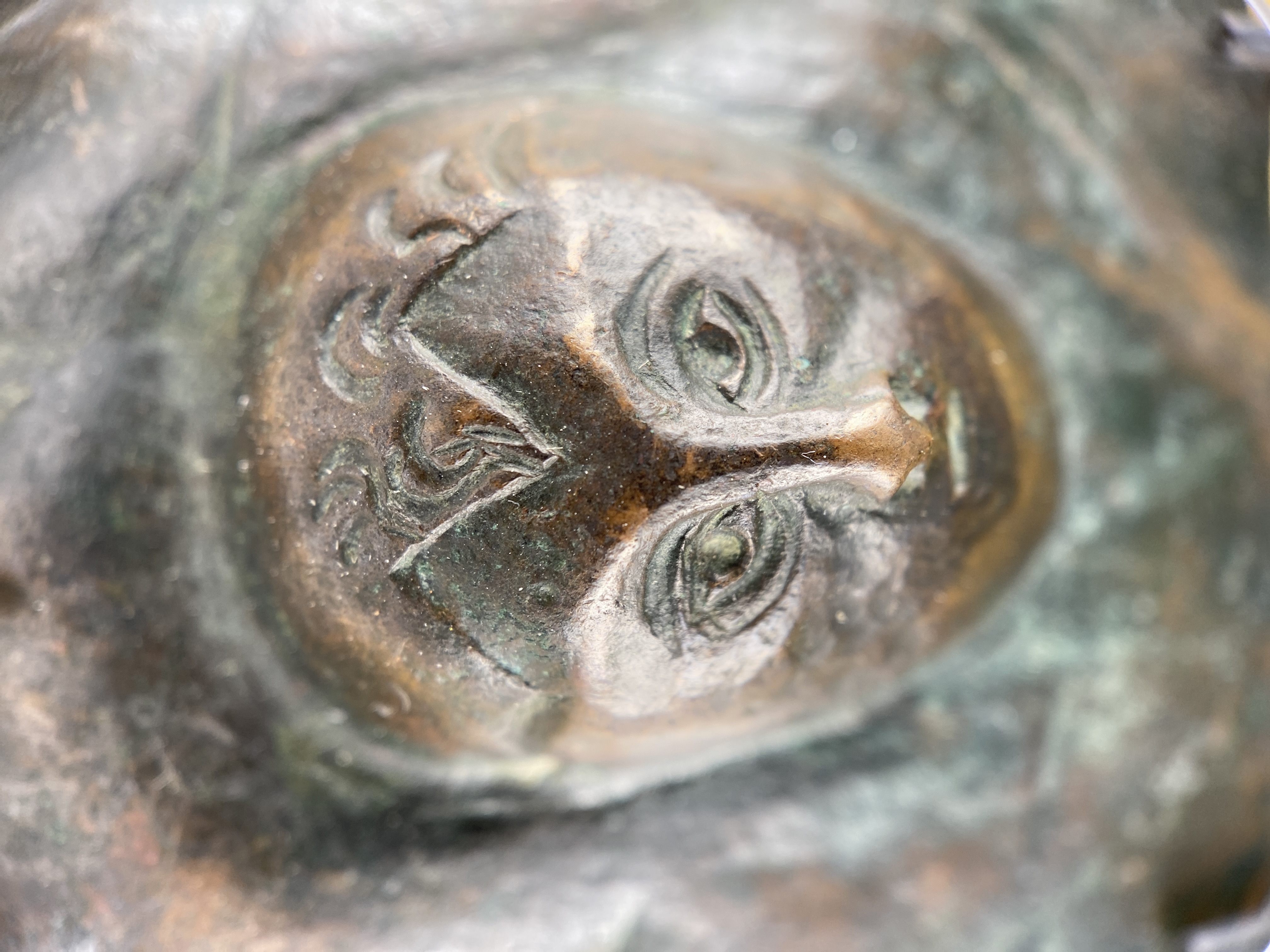 Ansiktsmask av brons, fyrkantig form med ett ansikte i mitten.