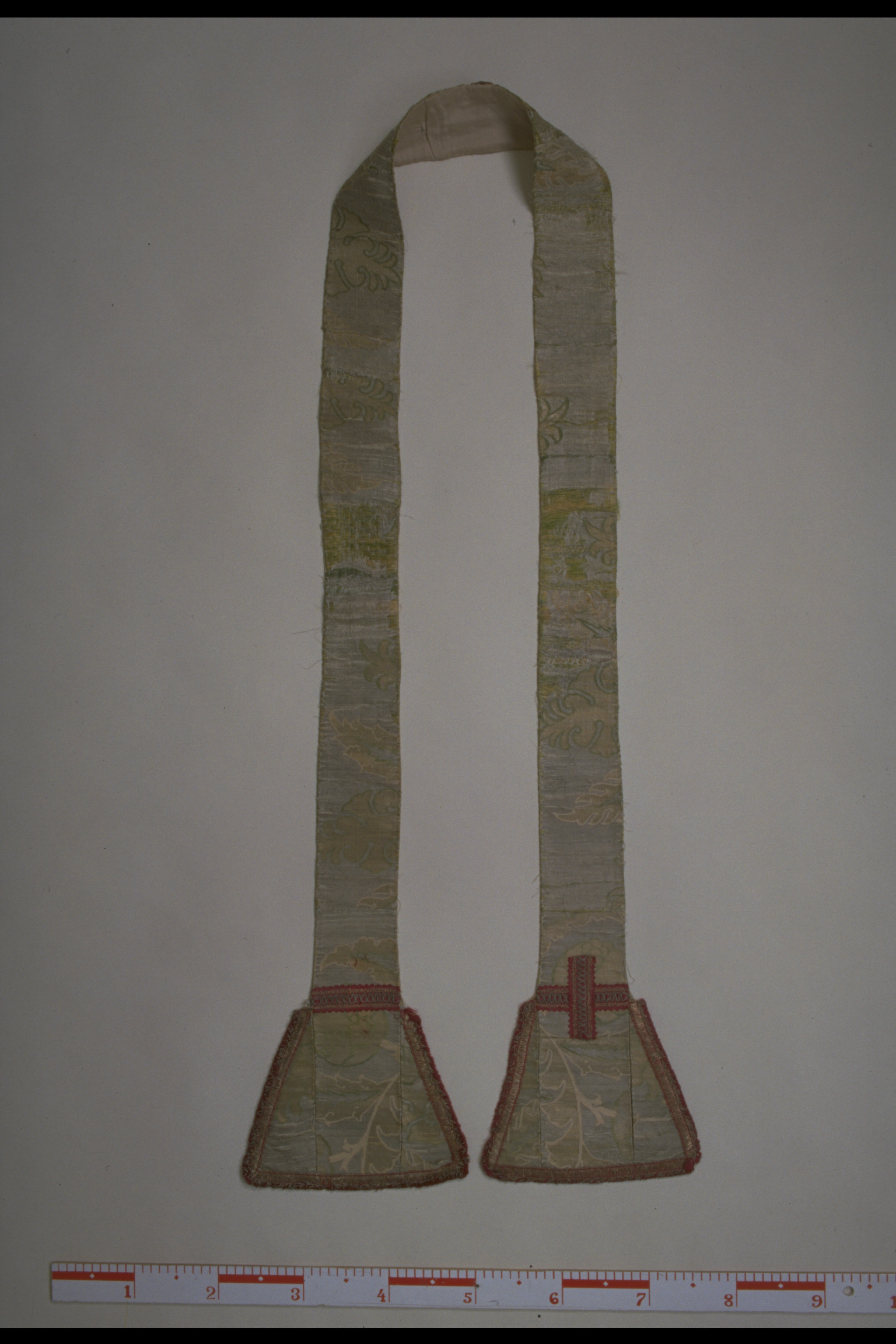 Turkisk silverbrokad i guld, gulvitt och grön växtornamentik. Likarmade kors av röda band med guldmönster. Stolans ändar kantas av frans i rött silke och guld. Mellanfoder av grov lärft. Foder av benvit sidenatlas och sidenrips. Deponerad i SHM 1986.