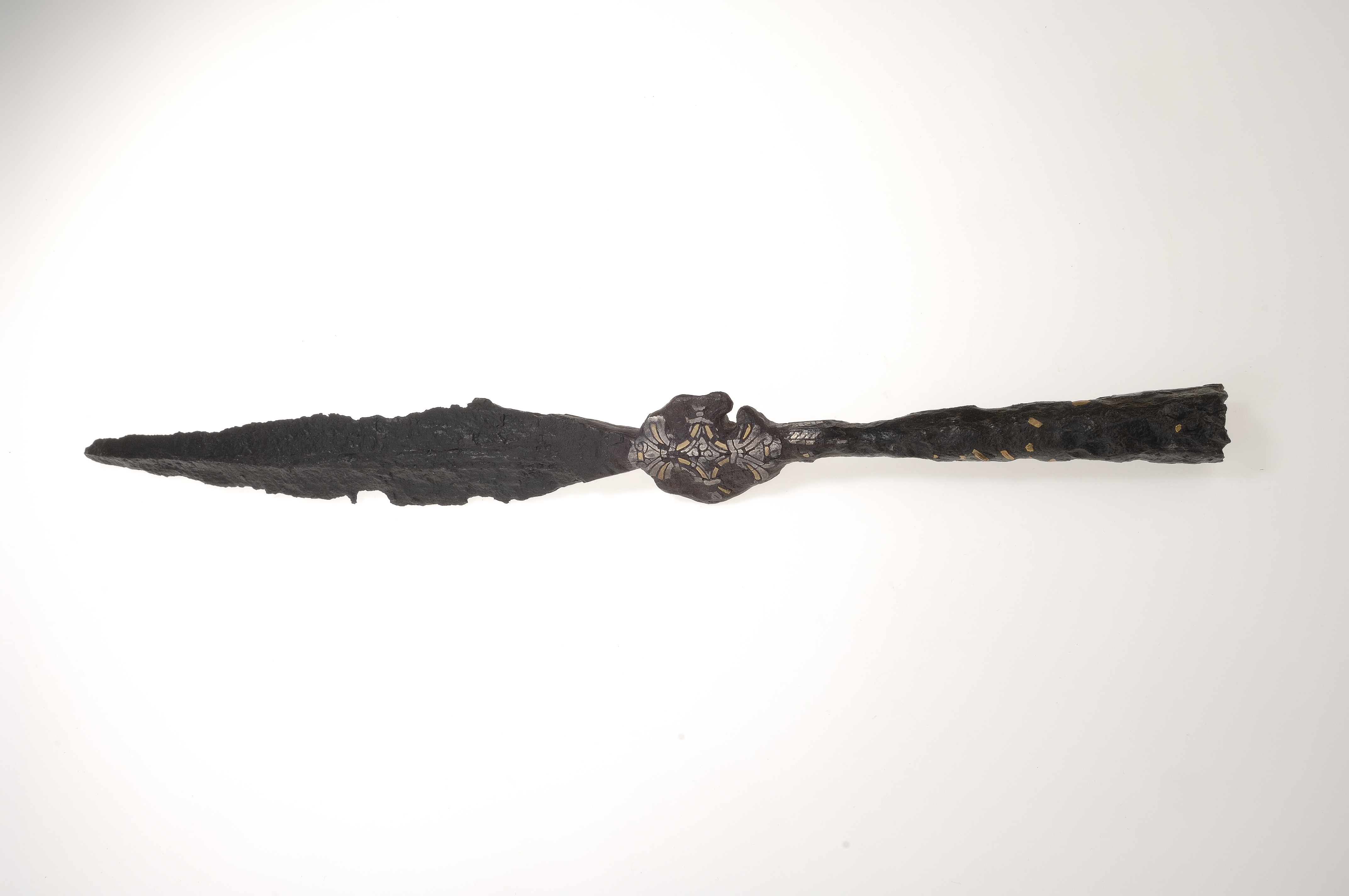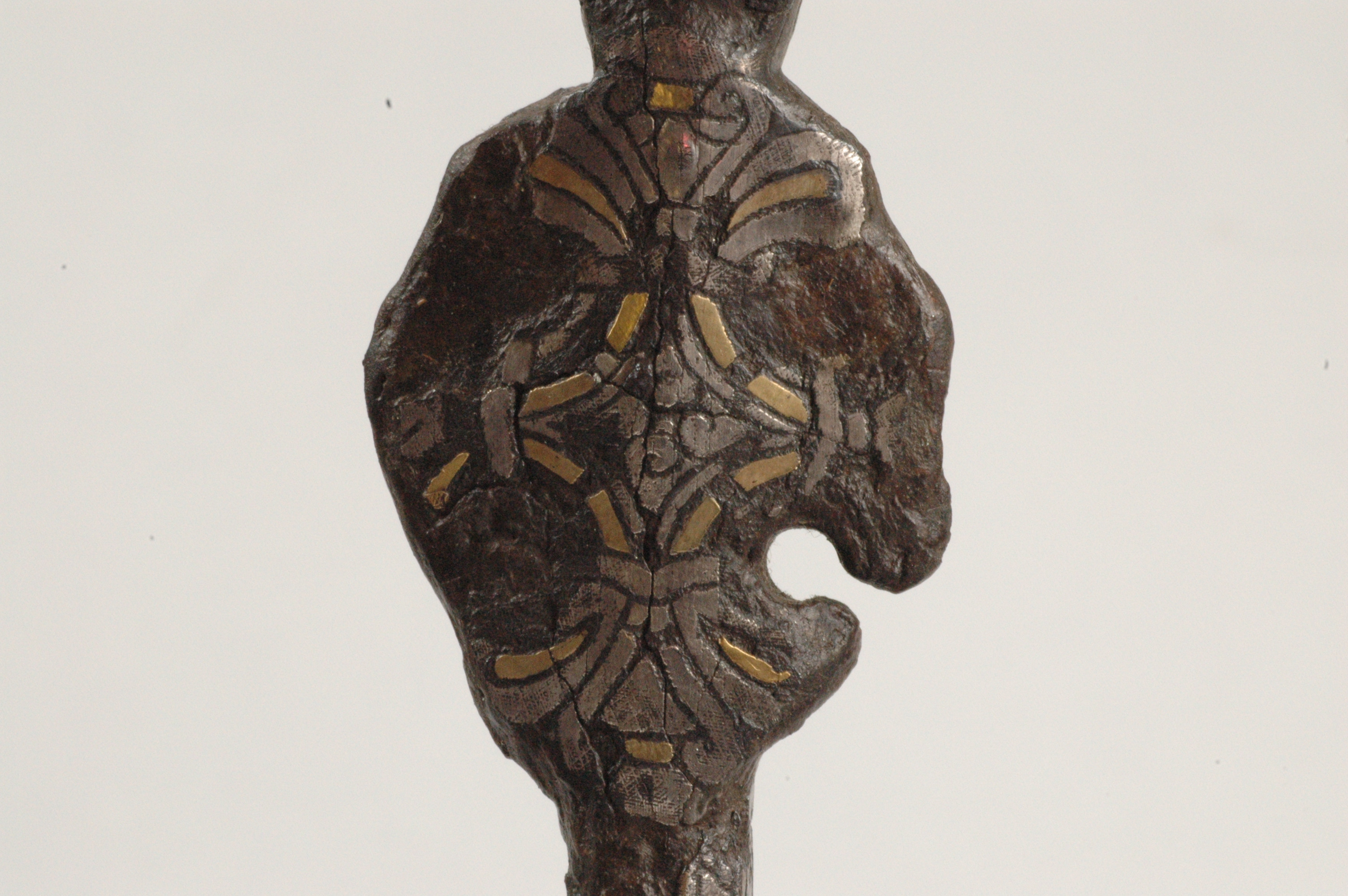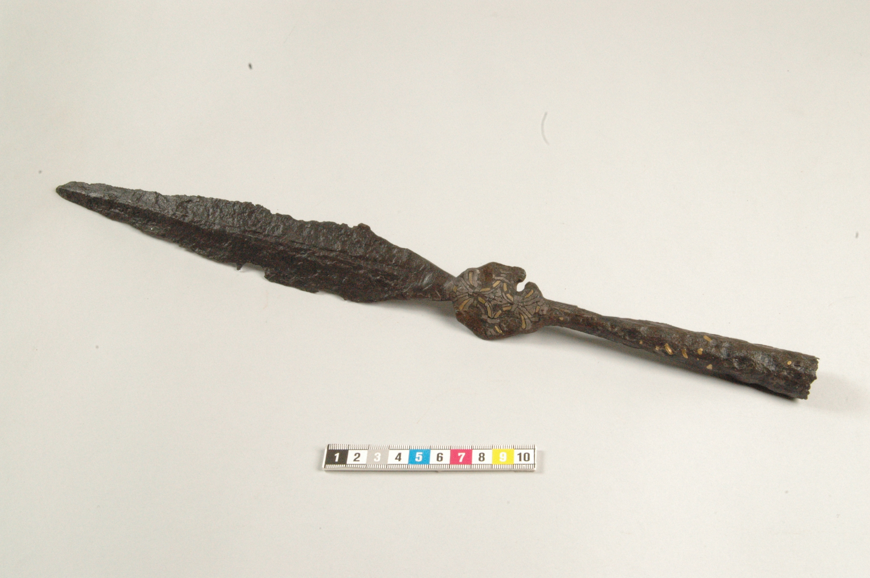 Stor korsprydd spjut- eller lansspets. Korset placerat vid övergången till holken.