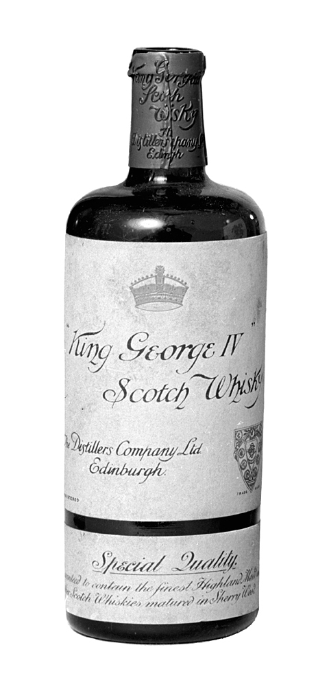 "KING GEORGE IV", The Distillers Company, Ltd., Edinburgh, två halvbuteljer. Av gulbrunt glas. Cylindriska, med kupig, tvärt indragen skuldra samt låg smal, svagt konisk hals med stärkring; bottnen insänkt. Etiketter tre, vita, en större med text i svart, dessutom en kunglig krona i rött jämte varumärke i guld, därnedanför en lång smal etikett med text i svart, på motsatta sidan en stående avlång etikett, varpå text i svart, delvis med röda begynnelsebokstäver, upptill varumärke i svart och vitt. Kapsylfragment av förtent bly, rödfärgat, på detsamma text i svart relief. Höjd: 20,1 cm.; diameter: 7 cm.