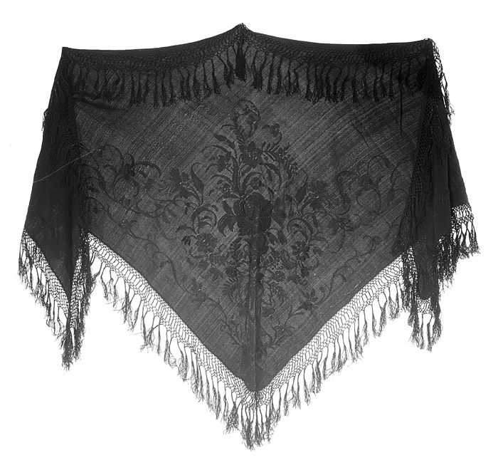 SCHAL Av svart siden (crêpe de Chine). Tresidig. Handbroderad. På mellersta snibben broderat i plattsöm av svart tvinnat silke en stor blom- och bladornering med stor rosliknande mittblomma, upptill en kvist med stora och små stjärnformiga blommor samt blad, nedtill ett nedåtvänt stort mångflikigt blad; sidokvistar i S- form med liknande blommor samt klängen. Utanför orneringen en smal vågranka. Alla sidor med dubbelvikt fåll, sydd med fållsöm av svart silke. Frans av svart silke som i broderiet, med nätliknande knytning upptill och nedtill omkring en stolprad samt avslutad med lindade smala tofsar. Mått: Längd: omkring 170 cm.; bredd: 75 cm. Frans, längd: omkring 10 cm. Emottagen av Johanna Kempe som arv efter hennes mor.