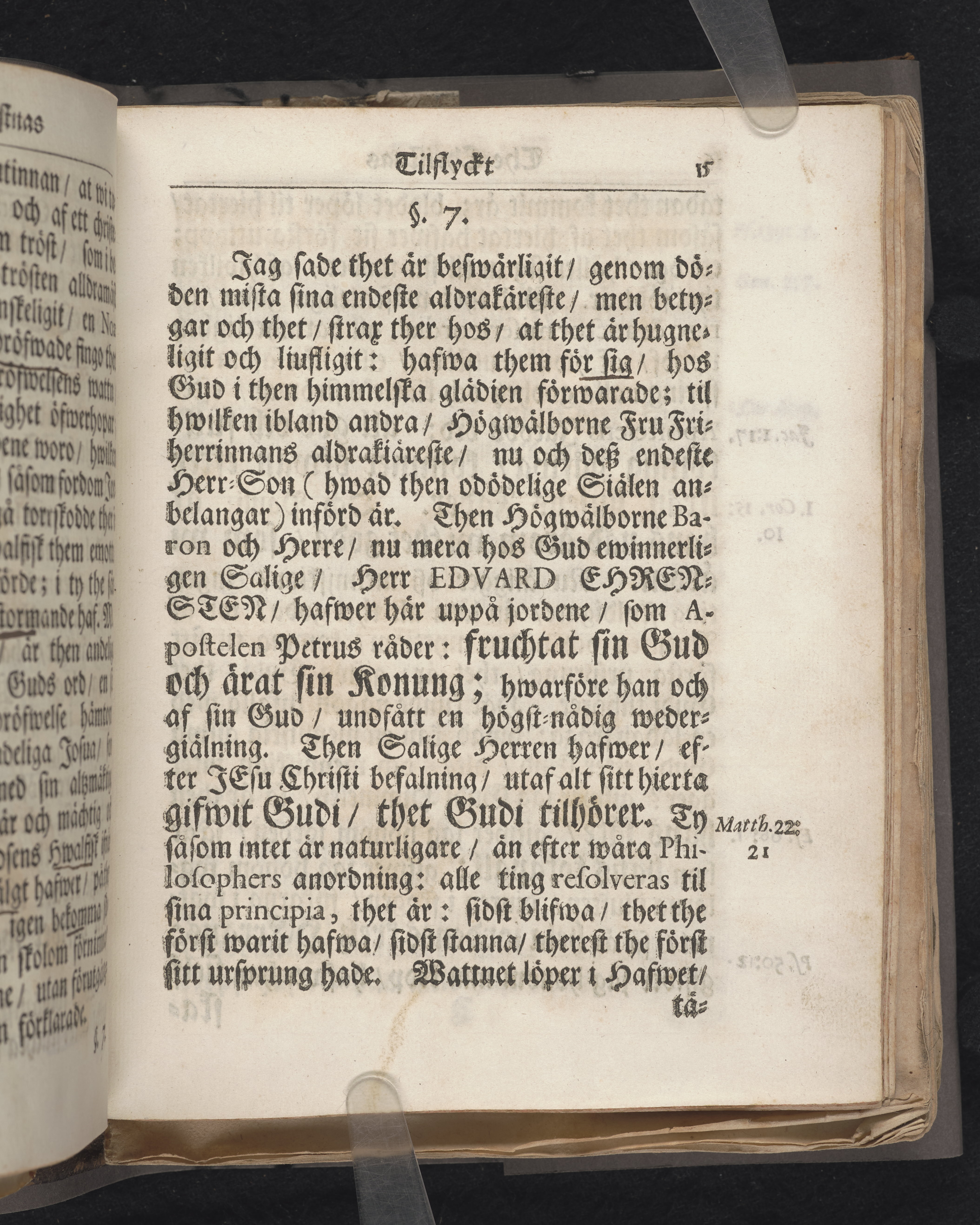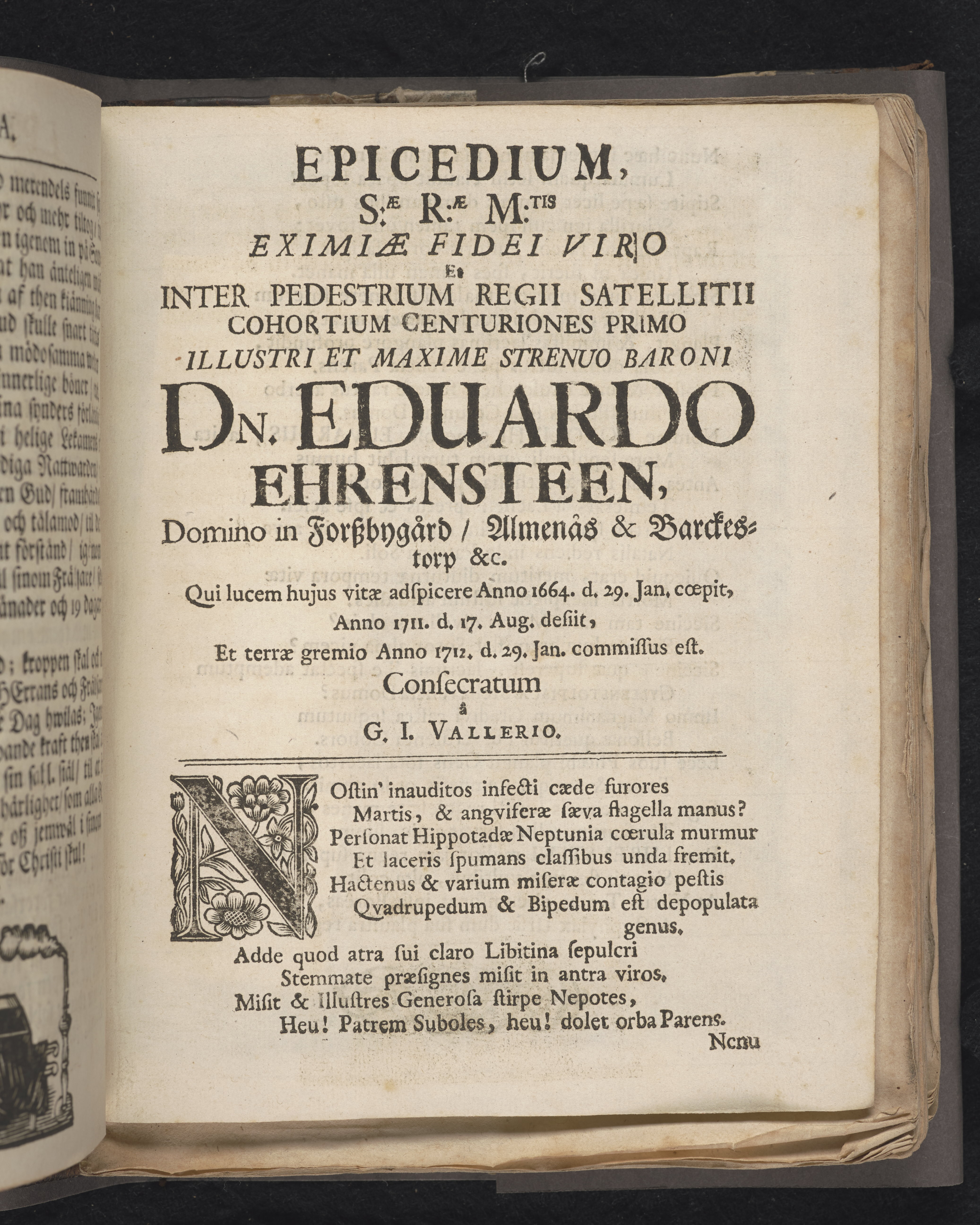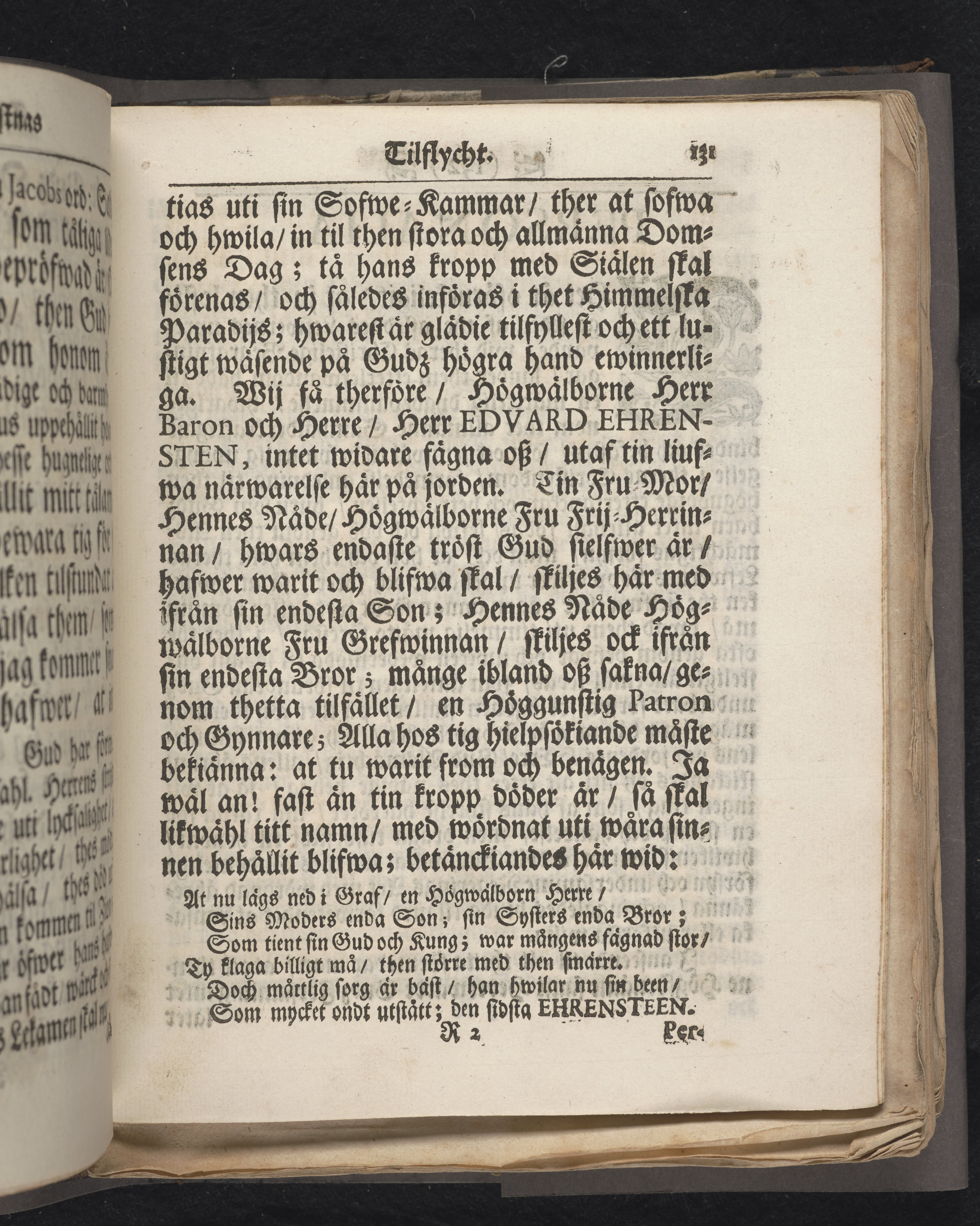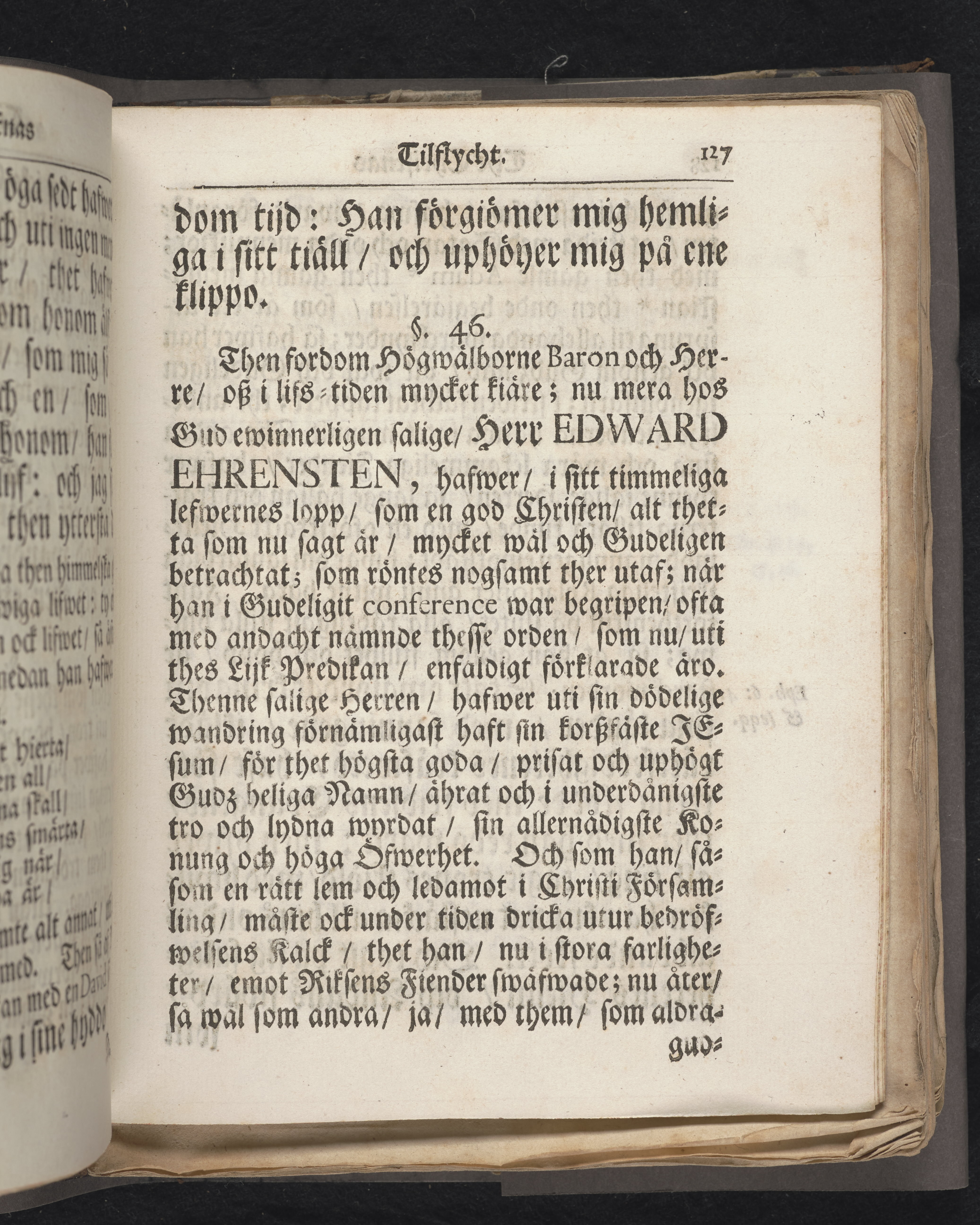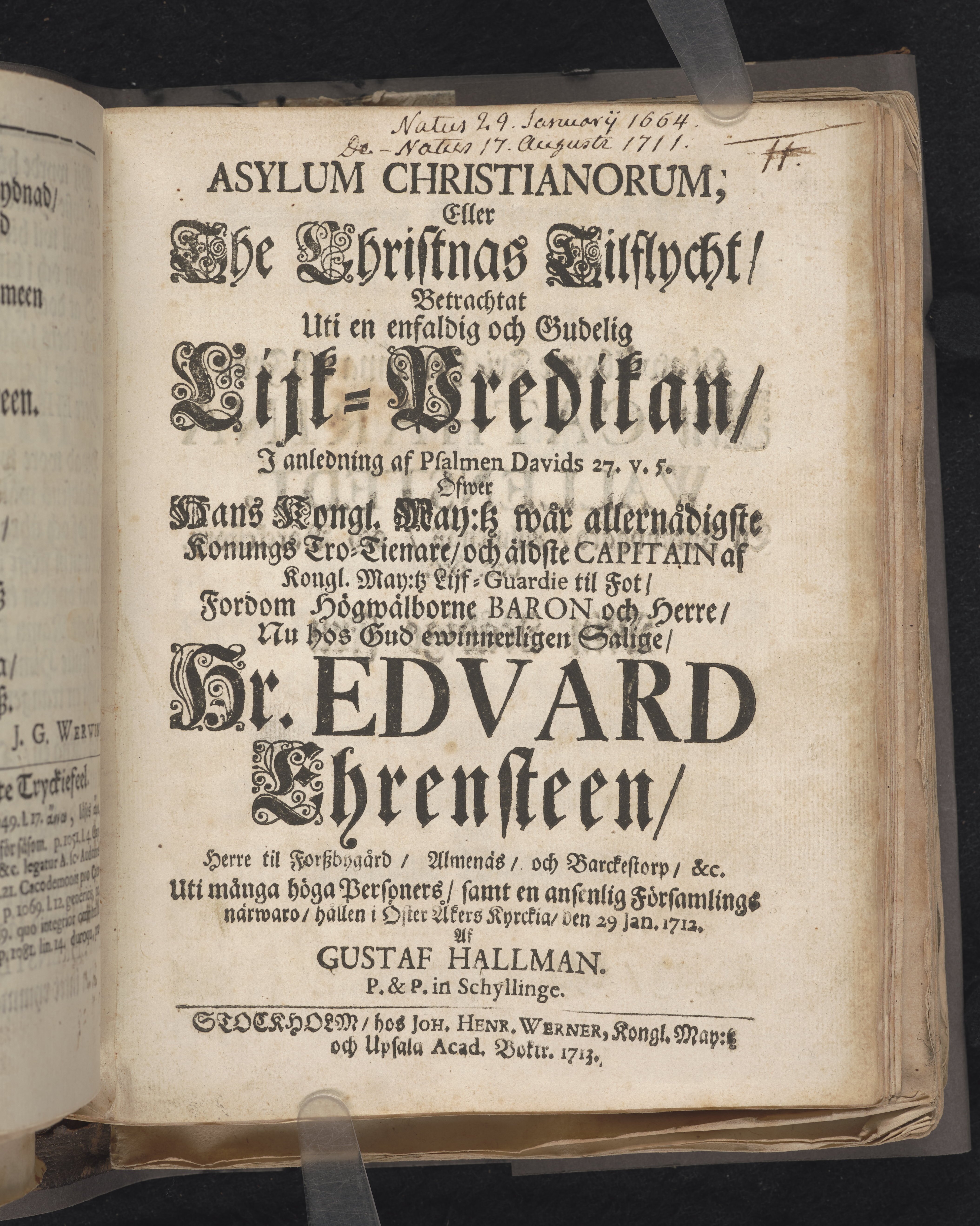 Asylum christianorum, eller The christnas tilflycht, betrachtat uti en enfaldig och gudelig lijk-predikan, i anledning af psalmen Davids 27. v. 5. öfwer hans kongl. may:tz wår allernådigste konungs tro-tienare ... nu hos Gud ewinnerligen salige, hr. Edvard Ehrensteen ... uti många höga personers, samt en ansenlig församlings närwaro, hållen i Öster Åkers kyrckia, den 29 jan. 1712. Af Gustaf Hallman ... Stockholm, hos Joh. Henr. Werner, kongl. may:tz och Upsala acad. boktr. 1713.
