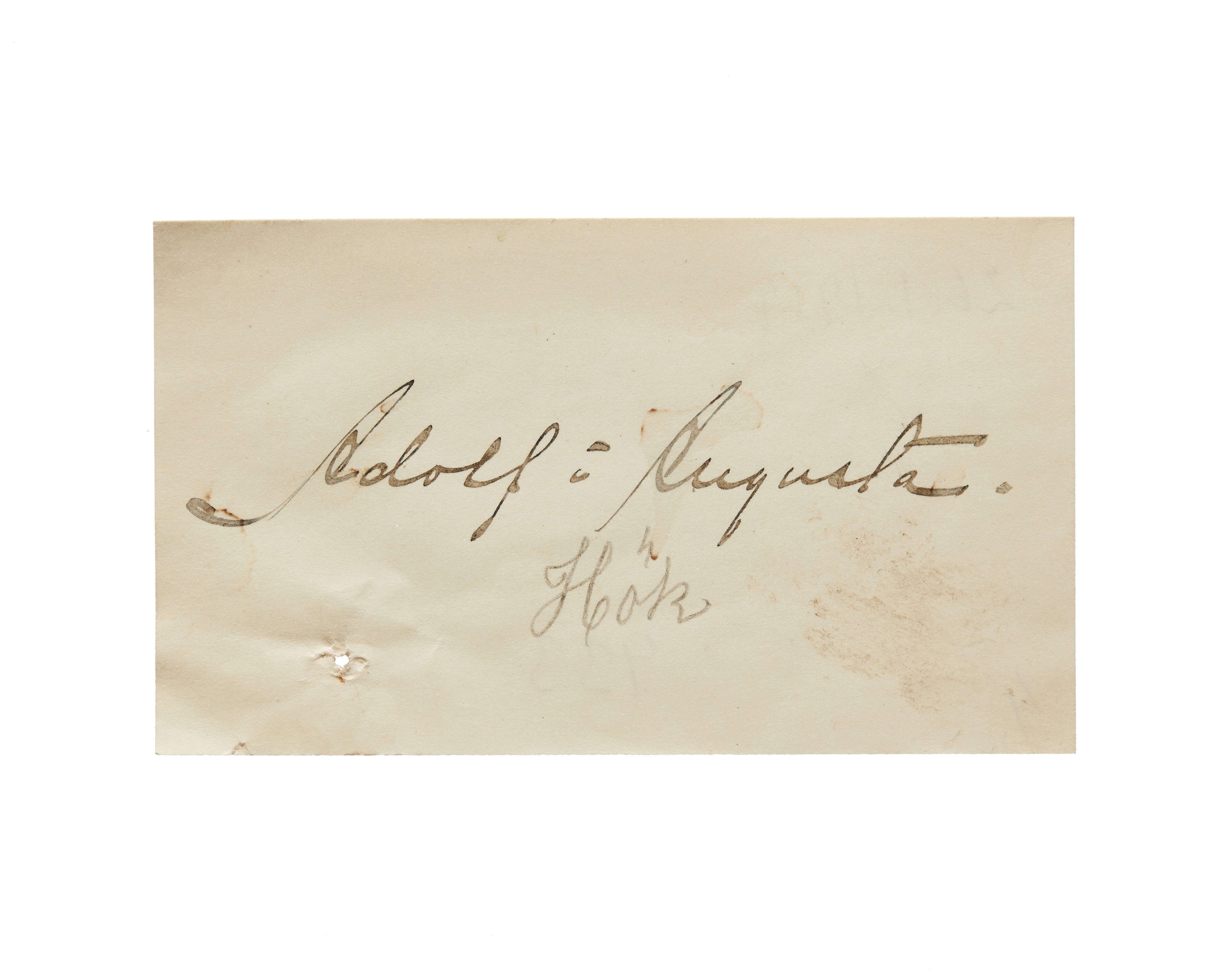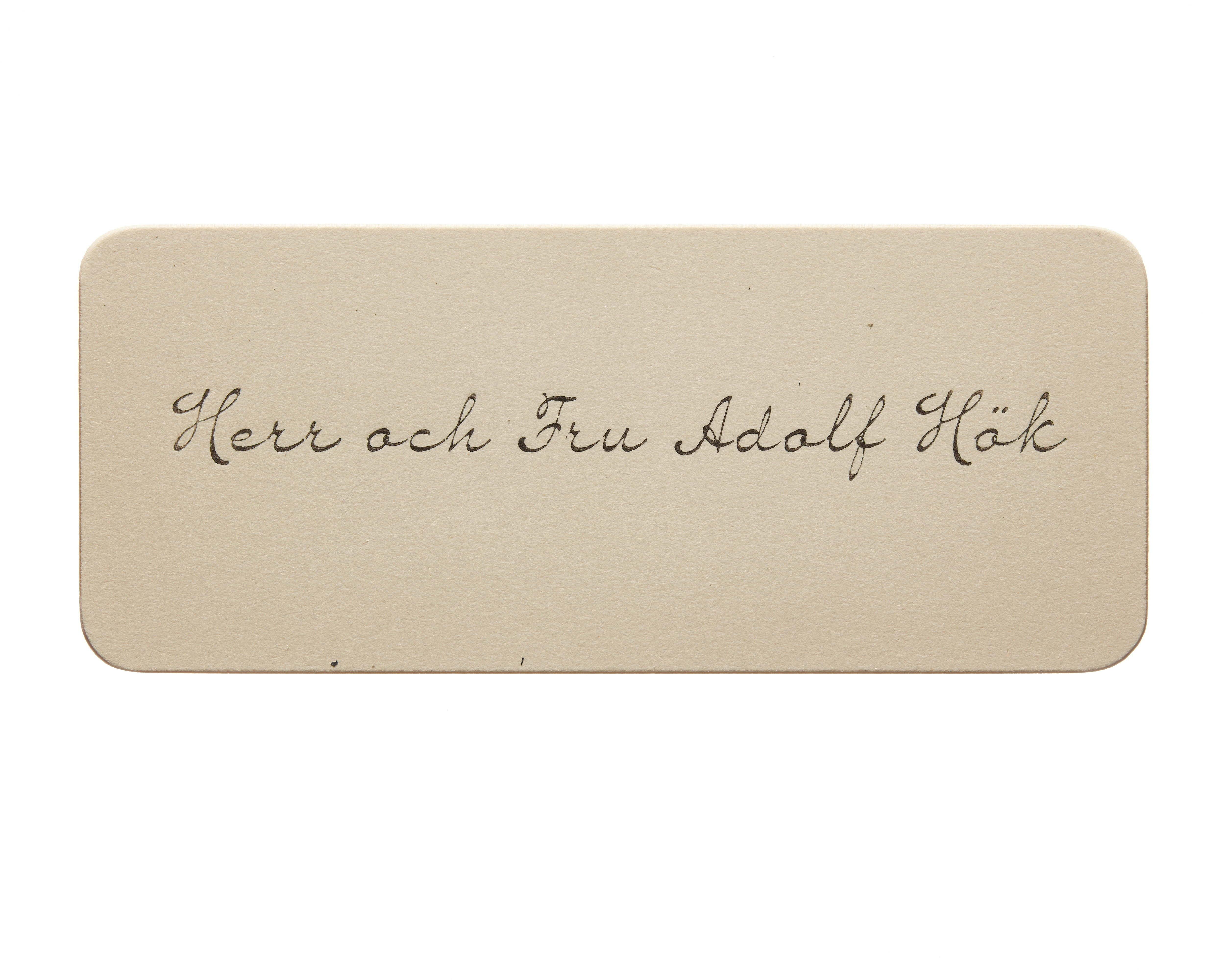 Fyra visitkort från Herr Adolf Hök och fru Hök. Första kortet är utan datum. Andra kortet daterat 10.06.1915 samt med rosa band. Överlämnat i samband med guldbröllop, 1915. Tredje kortet daterat 1916. Fjärde kortet daterat 26.01.1919.