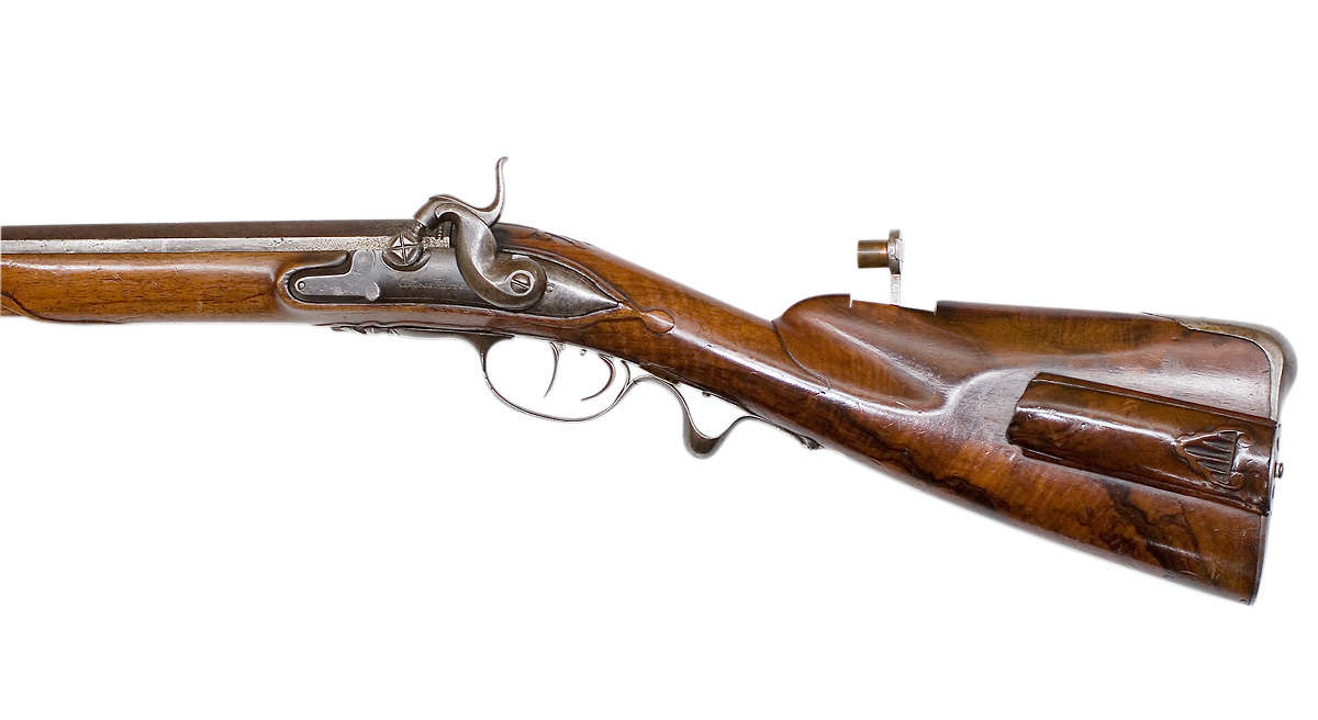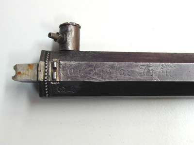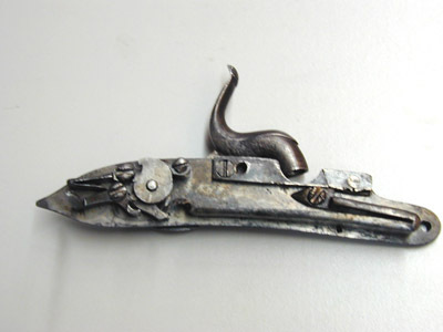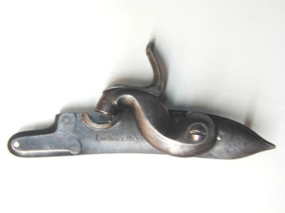 Slagexflintlåsstudsare med lås på vänster sida, pipa P. Siöblad, lås Georg Metzger, Stockholm c 1700.