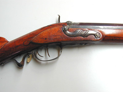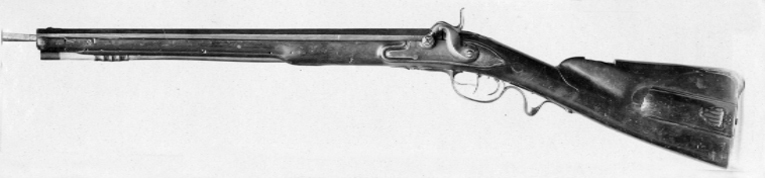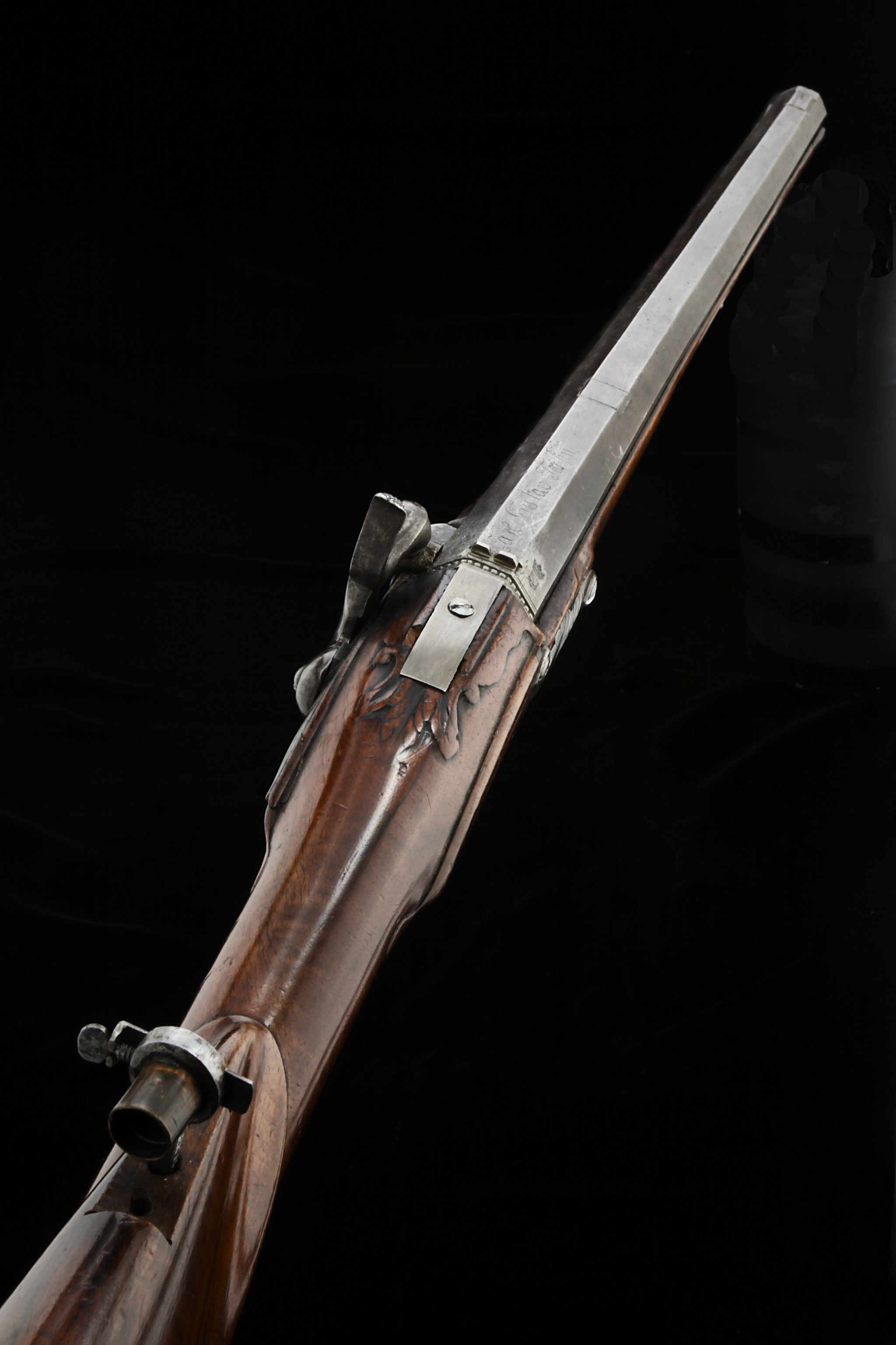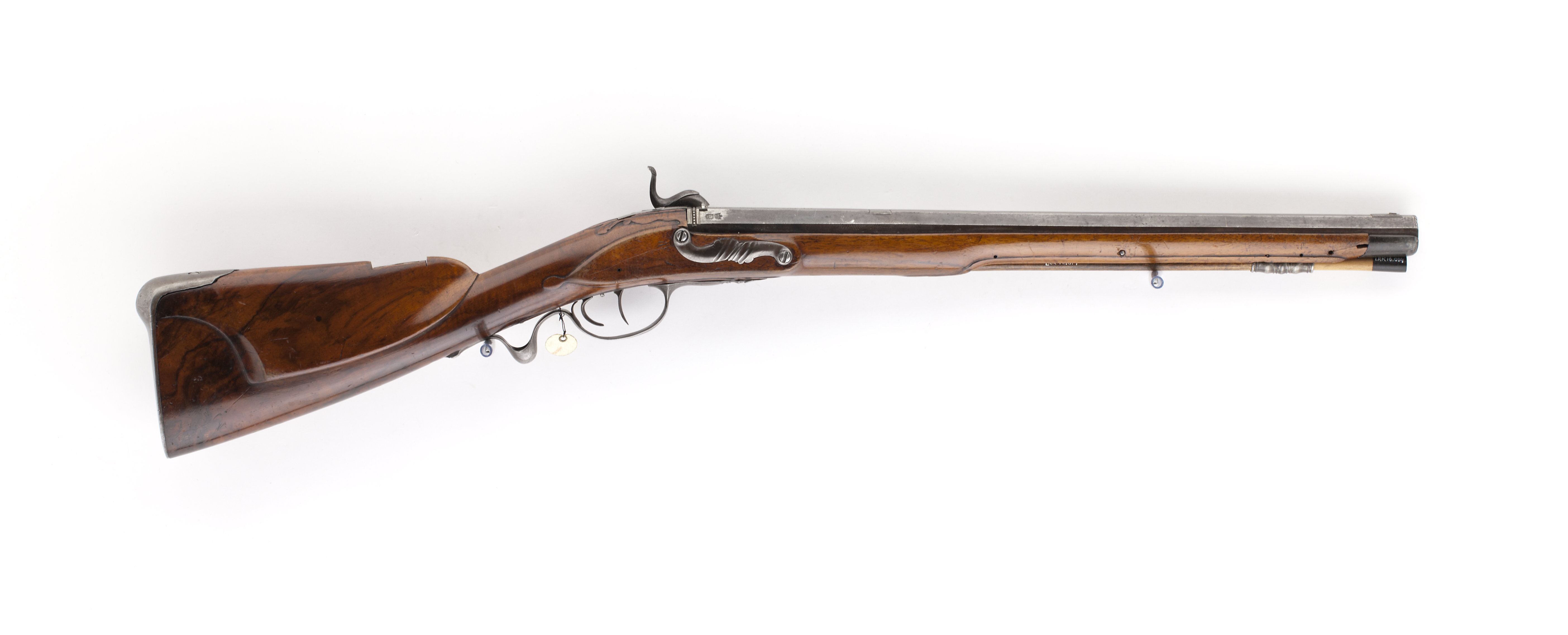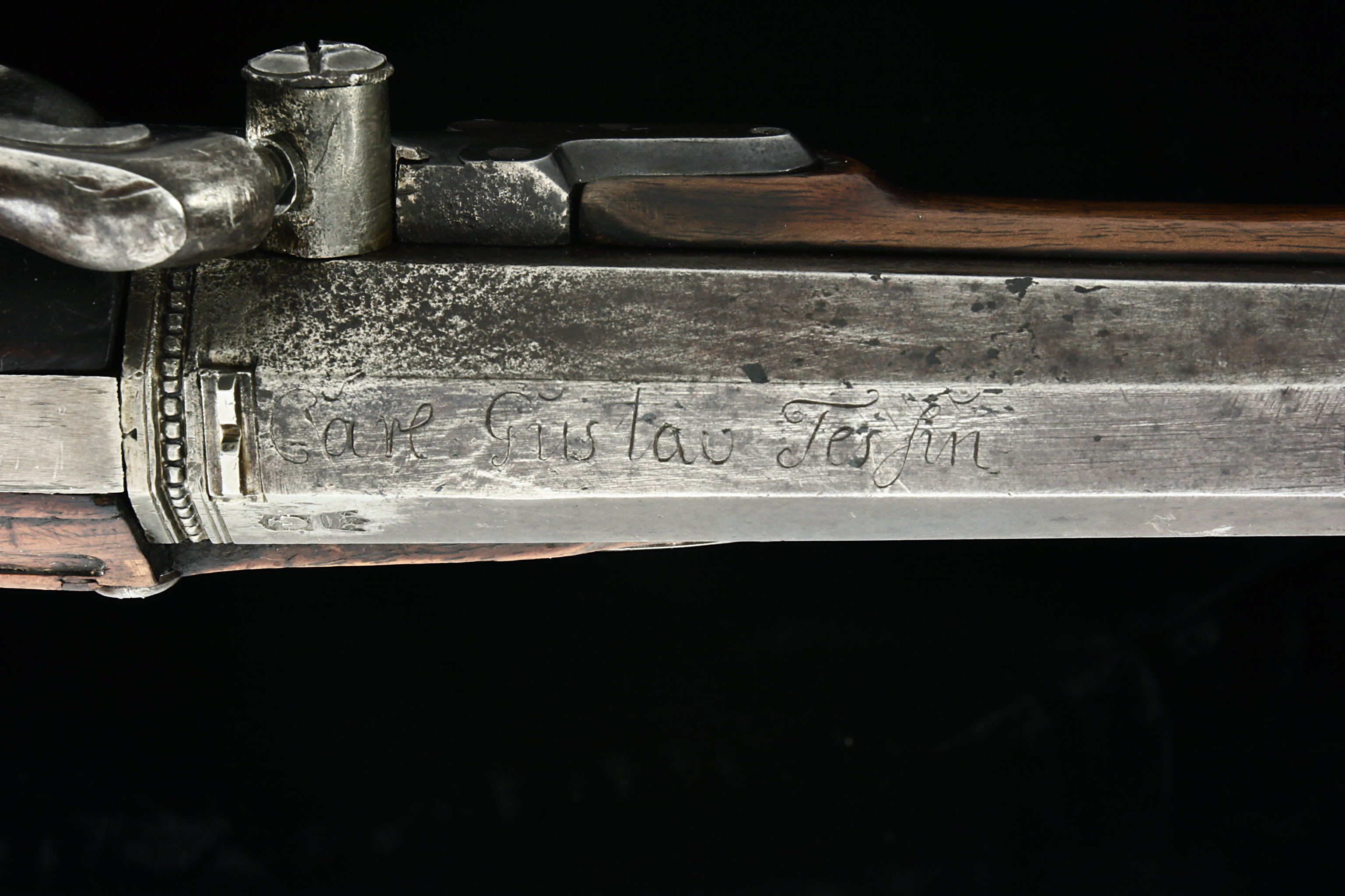Åttsidig, 12-räfflad, brunerad pipa av stål med försänkt svansskruvklack med litet hak i överkanten för krysskruven. På de tre övre faserna vid pipbasen en pärlstav. Vid mynningen på de tre övre faserna en sicksackbård, på överfasen därbakom samt bakom kornet två tvärgående tunna linjer. På h sidofas vid pipbasen stämpel: krönt sjöblad (LRK vägl. 1921:209-210), på mittfasen graverad ägarmärkning: "Carl Gustav Tessin" (andra s långt). På pipans v sida inskruvat en cylindrisk slaglåskagge, l: 20 mm, d: 14,7 mm, med inskruvad tändhattsnippel, gaveln i form av plant skruvhuvud med X-skåra och skålade kanter så att en närmast kvadratisk, plan mittplatta formas. Riktmedel: Vid pipbasen mellan pärlstav och ägarmärkning ett lågt, från sidan inlaxat ståndsikte av stål. 11 mm från mynningen en 20 mm lång, från sidan inlaxad platta med mycket lågt och smalt korn. Fästning: Två häften. Pipan fäst med krysskruv genom löst svansskruvblad som täcker svansskruvklacken Ett pipstift av stål. Flintlås ändrat till slaglås, välvt låsbleck med graverad kantlinje och signatur: "GEORGE METZGER". S-formigt svängd rundad och åsad hane med försänkt slagyta, tunna väggar, nätskuret tumgrepp. Nöt med yttre springkil, stor, droppformig nötstudel. Fästning: Två låsskruvar. Dubbla avtryckare, rektangulärt avtryckarbleck av stål. Helstock av valnöt, vänsterkolv med kindstöd på h sida och kolvlåda på v sida. Kolvlådelock med inskuret grepp med fyra blad, bakänden stålskodd, två fästskruvar. Näsband av horn, övriga beslag av brunerat (?) stål. Bakplåt med bred, rundad flik på kolvryggen. S-formigt svängt, välvt sidbleck med sned mittås flankerad av två skålade band på vardera sidan. Balusterformig topprörka, spetsrörkan saknas. Varbygel med kluven bakre stolpe, främre armen 8-formig och avslutad med urna och treflikigt blad, bakre armen pungformigt nedsvängd och likaså avslutad med treflikigt blad. På kolvryggen urtag för fästbeslag till dioptersiktet. Tillbehör: Laddstock av bok (? ej ursprunglig), l: 498 mm, framtill skodd med horn, l: 24 mm.