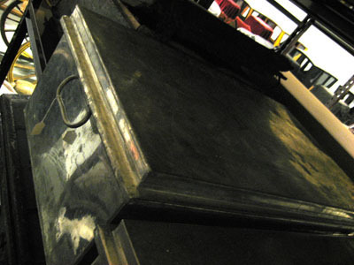 Rektangulär koffert av svetsad plåt med lock och 140 mm breda handtag på kortsidorna. Locket är fästat med gångjärn i ena långsidan. På framsidan ca 195 mm från kanten, två nyckelhål på oval platta för låsning. Locket märkt "V.O" i tryckt svart text (något rispat).