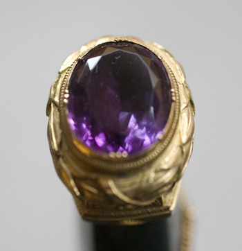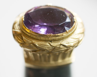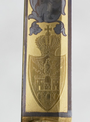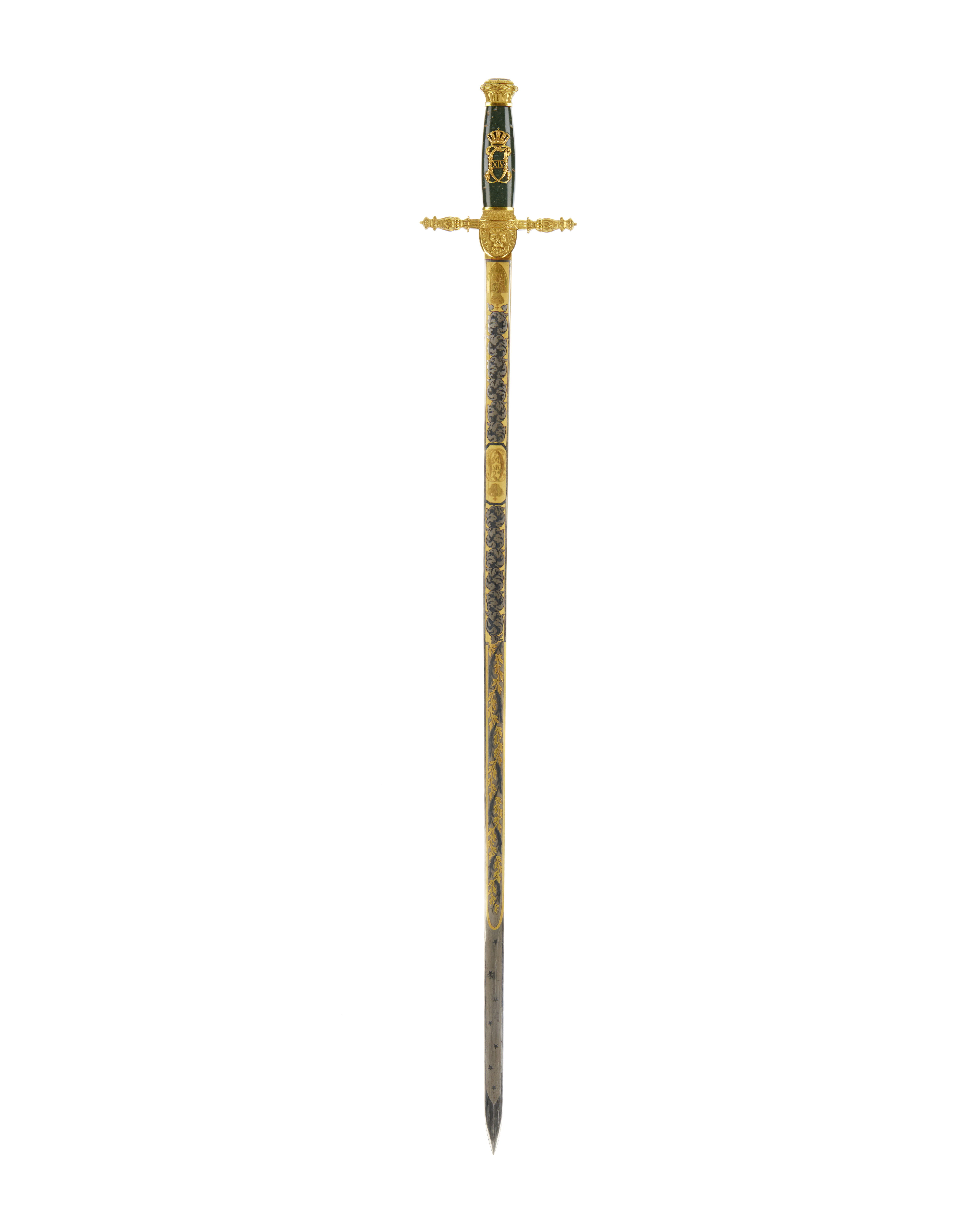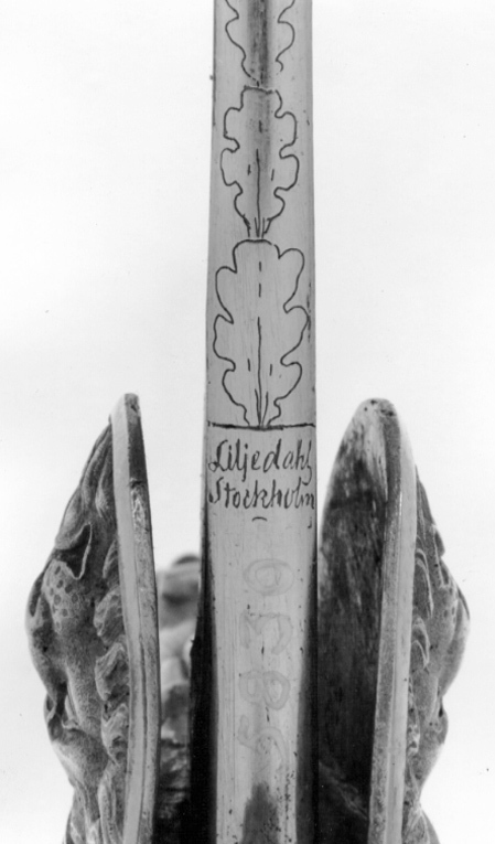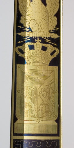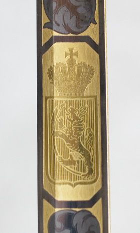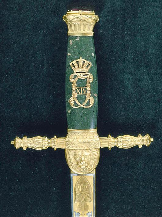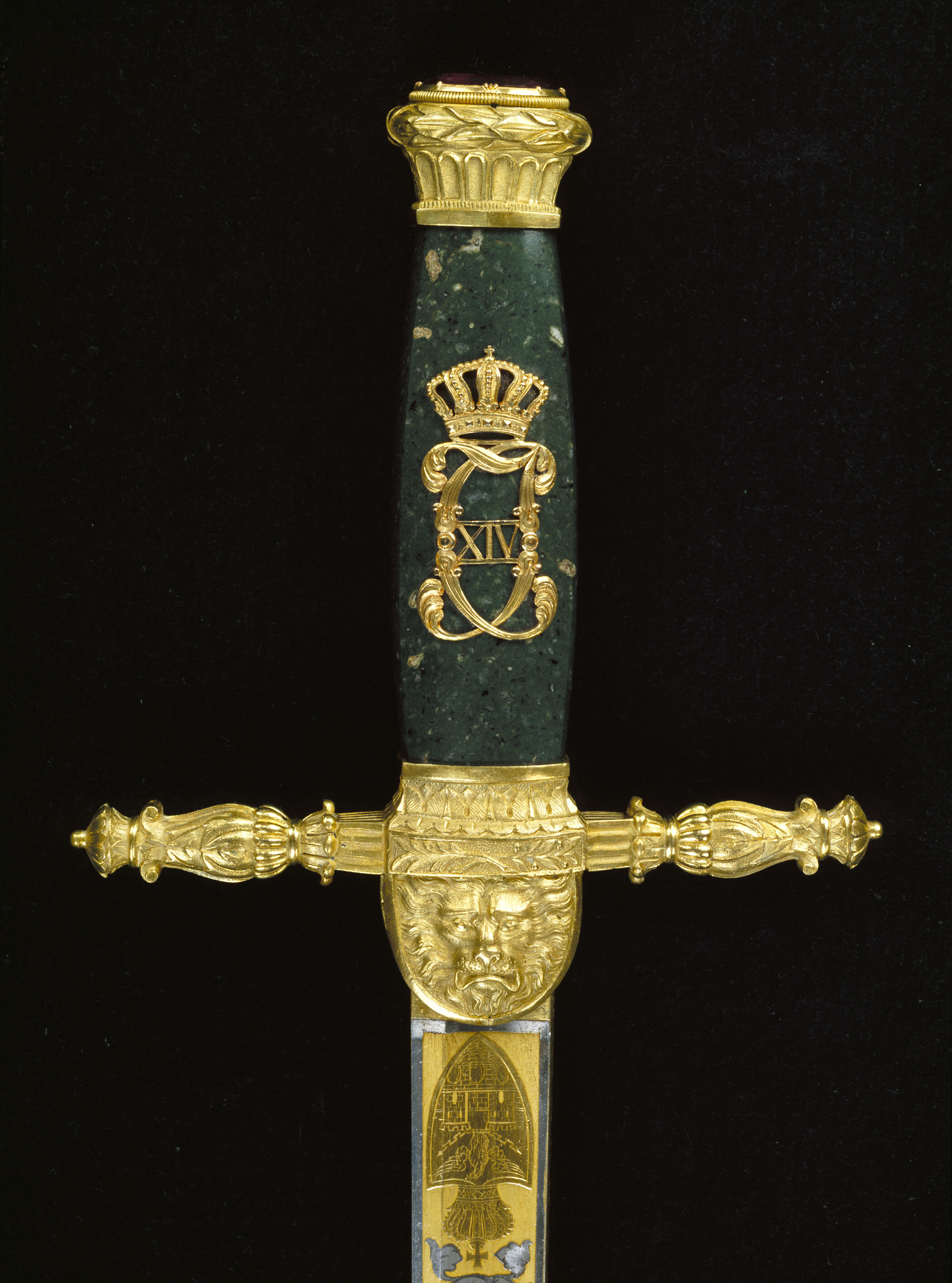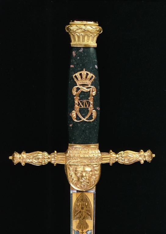 Korsformigt fäste med knapp, kryss och parerstänger av reliefornerad, förgylld mässing. Knapp nertill fyrsidig, därovanför utvidgad med kannelyrer, runt överdelen en tuktad lagerkrans, överdelen platt med en oval ametist med fasettslipade kanter, avdeckt fattning av guld (?). Parerstänger raka, ornerade med korslagda lager-och palmkvistar, över krysset en bladbård. Styrskenor breda vid krysset, horisontellt avgränsad överdel och rundad nederdel, på den senare en lejonmaskaron. Kaveln fyrsidig av polerad, melerad, s.k. grönklittporfyr, på utsidan monogram av förgyllt silver, CXIVJ under kunglig krona. Monogrammet fäst med nitar i kaveln. Klinga rak, eneggad, framtill tvåeggad med bred, grund hålkäl från fästet till 200 mm från spetsen. Ryggen förgylld till 180 mm från spetsen, graverad signatur vid fästet: "Liljedahl // Stockholm". Därframför en graverad eklövsbård. Etsad, förgylld och delvis polerad dekor. Under styrskenorna fält med nätmönster av guld, därframför 335 mm långa fält med delvis polerade bladrankor mot guldbotten. Förgyllda fält med polerad dekor. På ut-och insidan vid fästet sköld med Ponte Corvo-vapnet krönt av kunglig krona (stjärnorna saknas). Mitt på bladrankan på utsidan fält med Karl XIV Johans krönta namnchiffer, på insidan sköld med det norska lejonet, skölden krönt med kunglig krona. Framför bladrankorna ett guldkantat, 255 mm långt fält med två om varandra slingrande, polerade bladrankor, en lagerranka av stål och en palmbladsranka av guld. Därframför ett 150 mm långt, matt fält med på vardera sidan sju polerade, femuddiga stjärnor.
