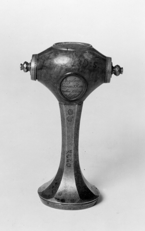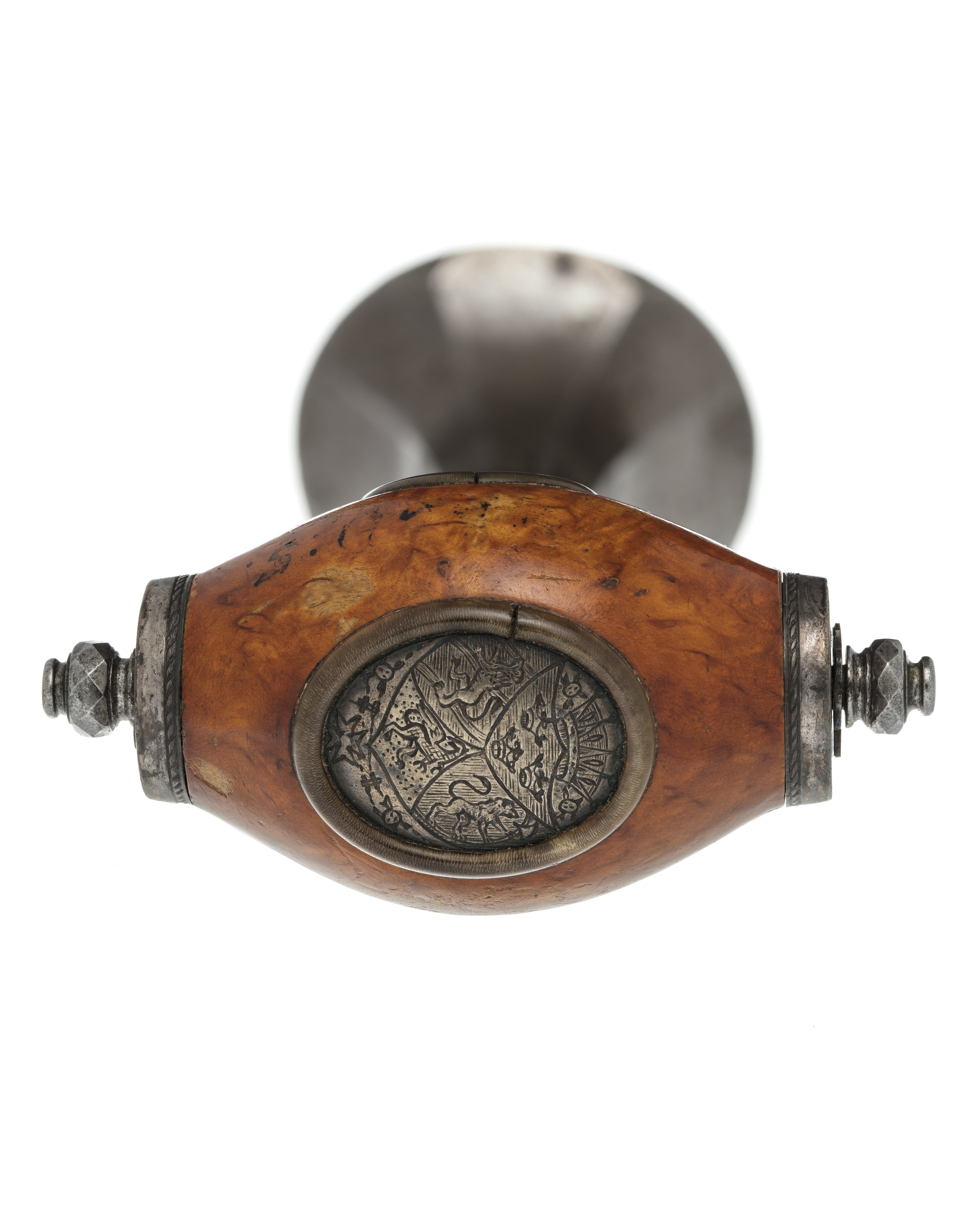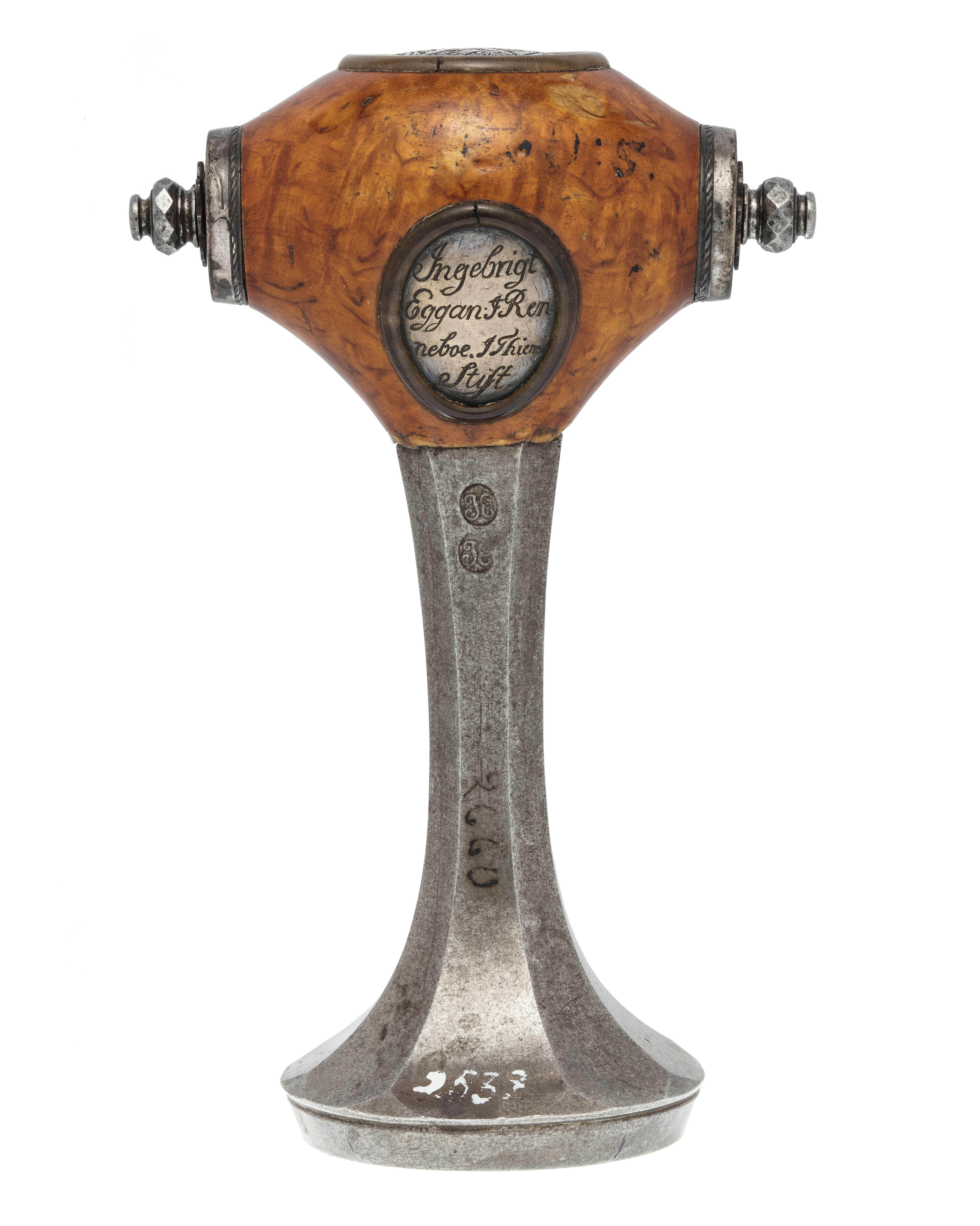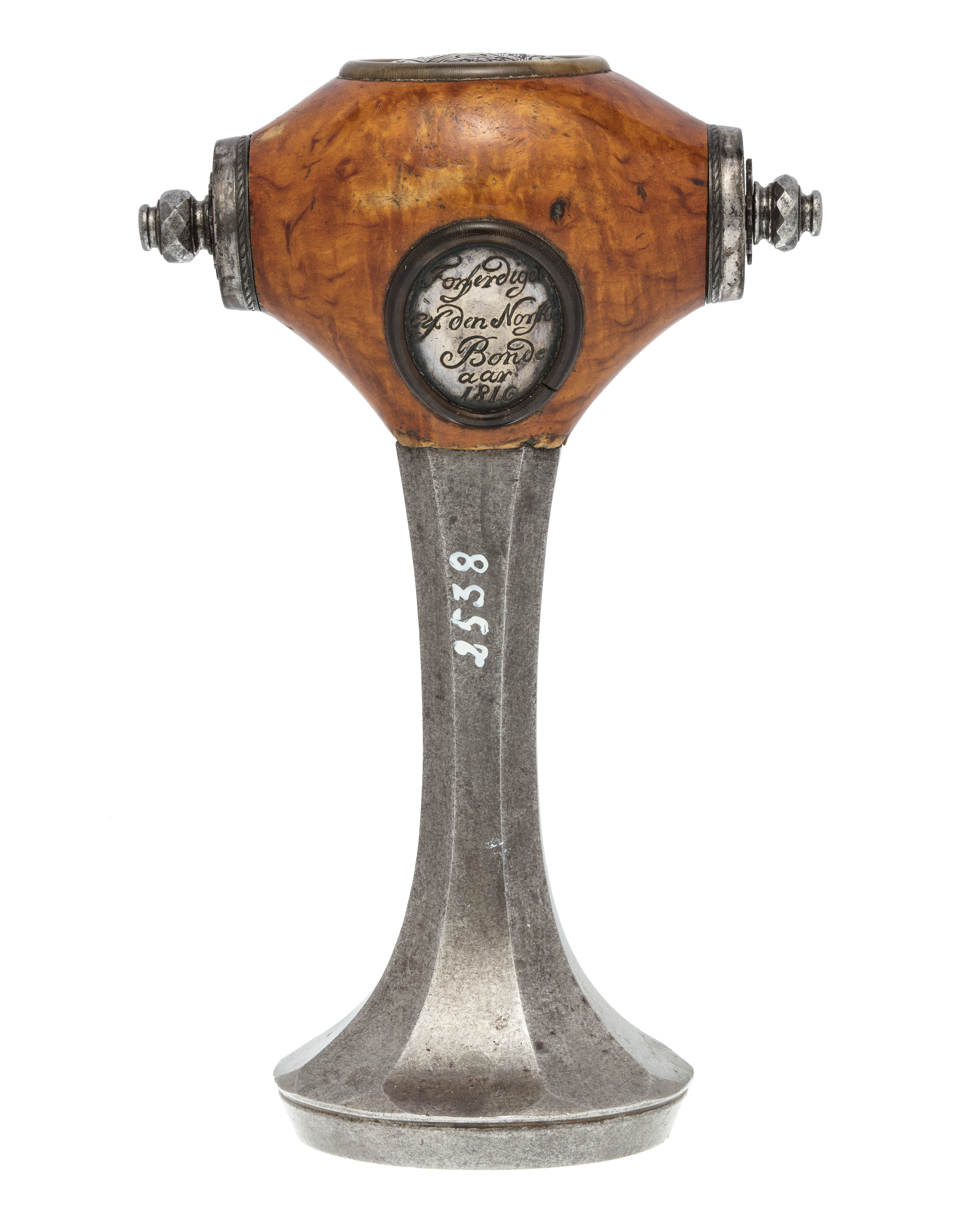 Oval platta av stål med fasad kant. Graverat vapen, skrafferade färgangivelser, fyrstyckad sköld, tre kronor, folkungalejonet, norska lejonet, Södermanlands grip. Kantbård med kulor, grupperade två och två. Skölden krönt av svensk hertigkrona. Runt skölden Serafimerordens kedja, patriarkkorsen dock ersatta av raka stavar. Kantbård av slät ring och därutanför repstavsring. Baksidan övergående i åttsidigt, uppåt avsmalnande och sedan åter bredare skaft av stål, kanterna längst ner avtagna i triangulära fält. Upptill på en sida två ovala stämplar I E. Upptill på skaftet liggande oval, kula av masurbjörk (?), nerdraget i spets mot skaftet. I båda ändar runda silverplattor, d: 15 mm, fästade med svarvade och fasetterade kulor av stål, blomformiga, blånerade brickor av stål, l. mellan kulornas ändar 60 mm. På kulan fäst tre ovala, något välvda silverplattor, kantringar av horn. På plattan upptill graverat samma vapen som på stampplattan. På de två övriga plattorna graverad text, på den ena: "Forferdiget // af den Norske // Bonde // aar // 1816", påden andre: "Ingebrigt // Eggan I Ren- // neboe I Thiems // stift".