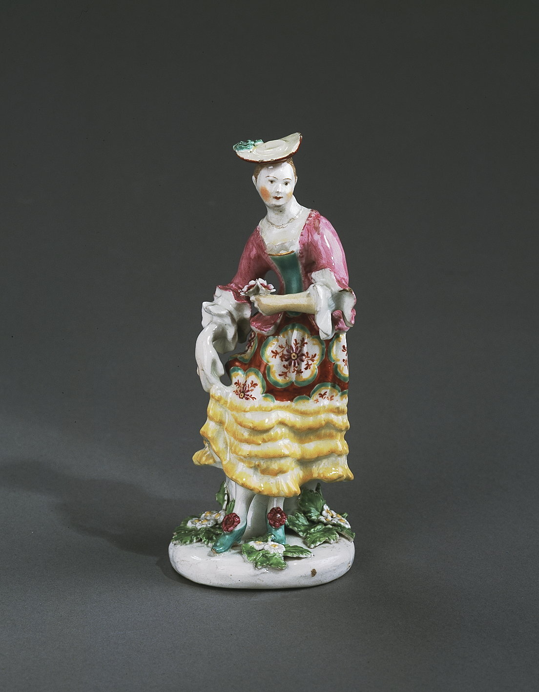 Stående på fotplatta med lyft kjol och med tre blommor i ena handen. Dekor i färger och guld på glasyren. Till omkring 1784 var Derbyföremålen, inklusive figuriner, oftast utan märkning, förutom ett fåtal exemplar som har olika slags inristade bokstäver på undersidan. Denna herdinna saknar här sin partner Herden emedan den ursprungligen var ett par (Herde och Herdinna) i skotska dräkter.