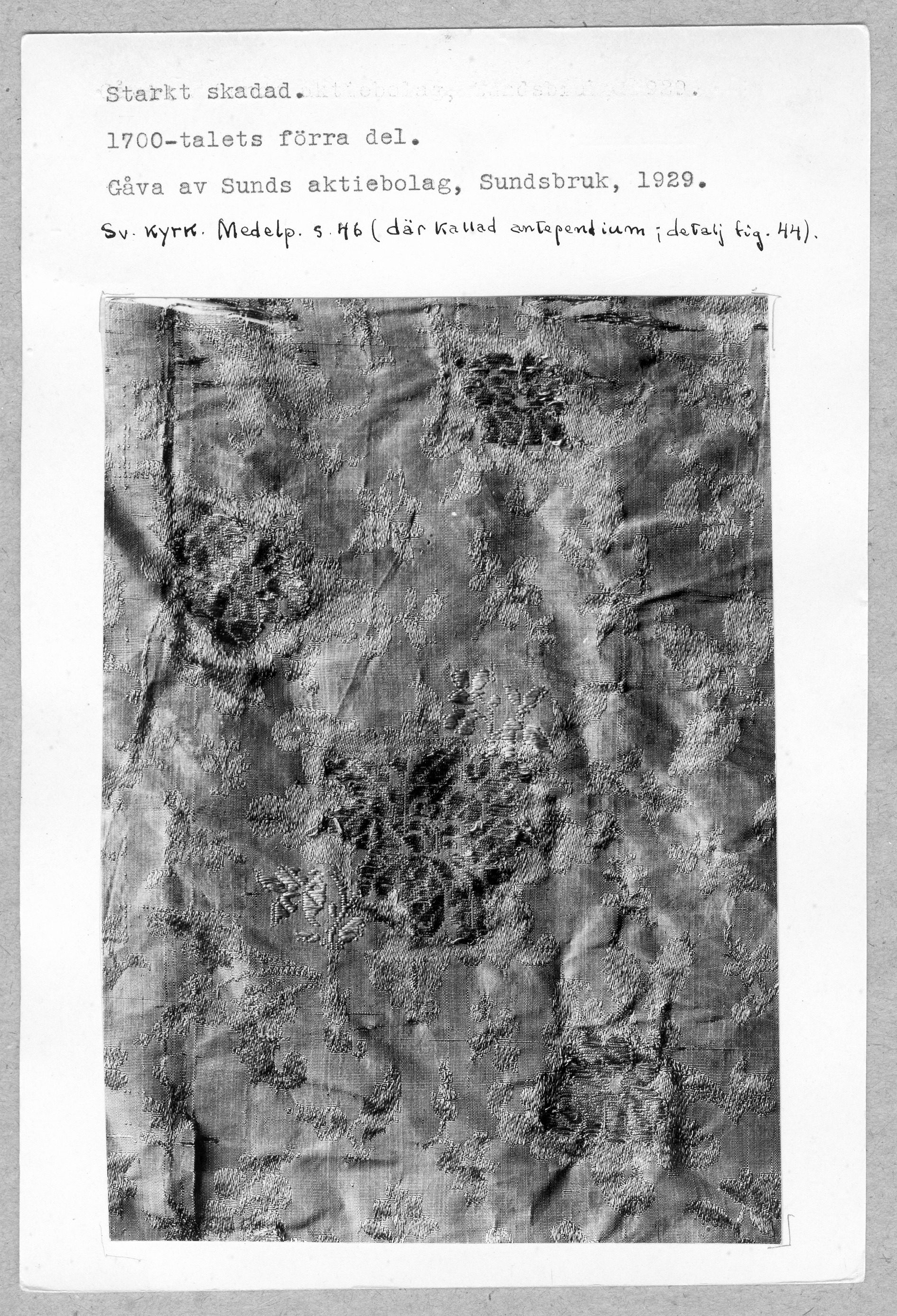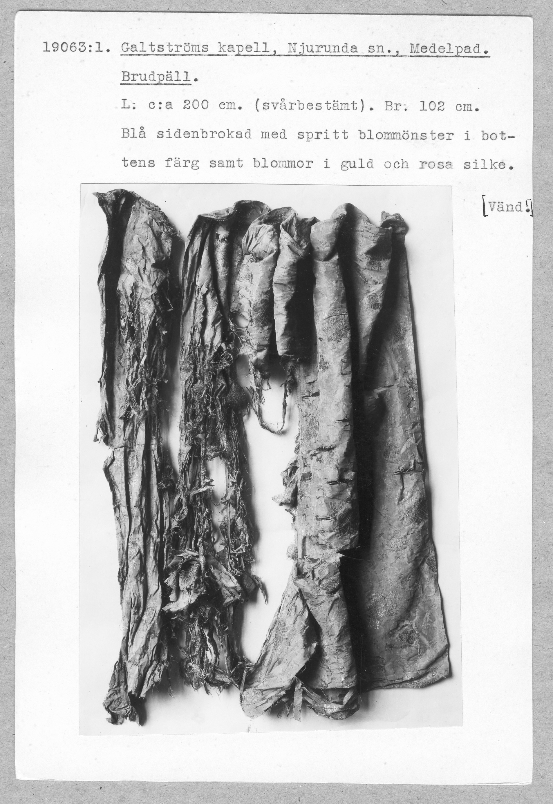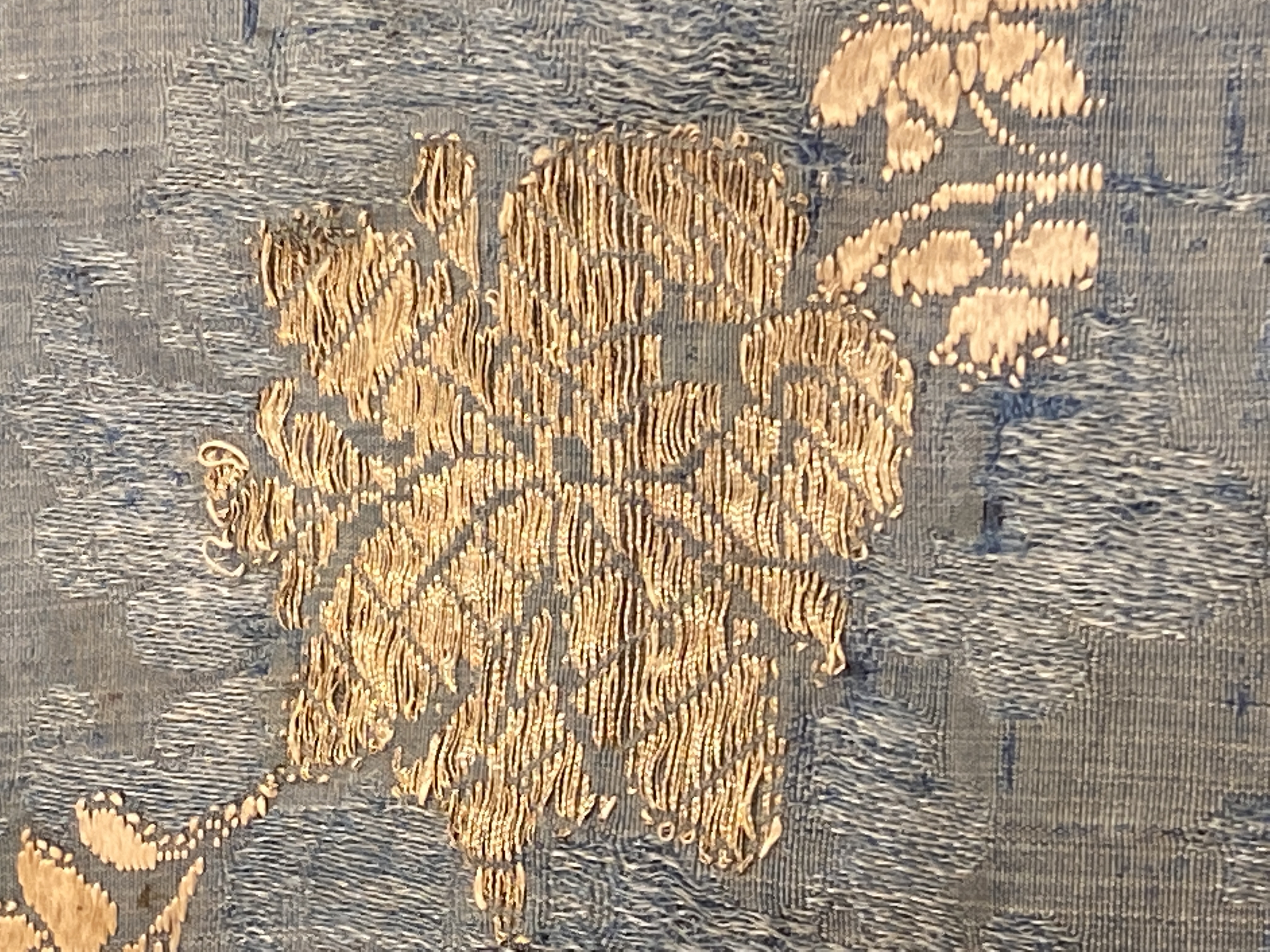 Blå sidenbrokad, blommönstrad i guld, blått och rosa. Gåva till SHM 1929.