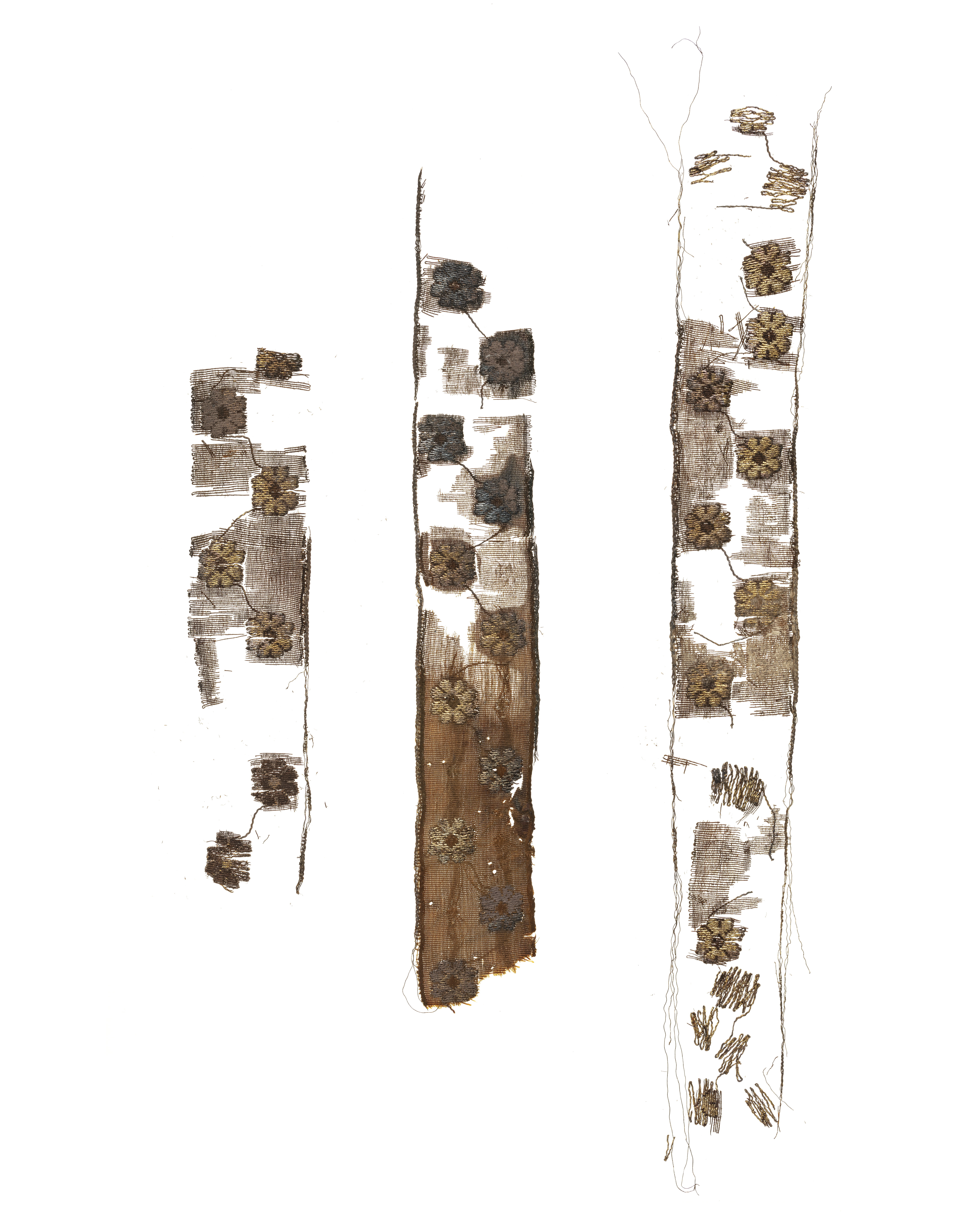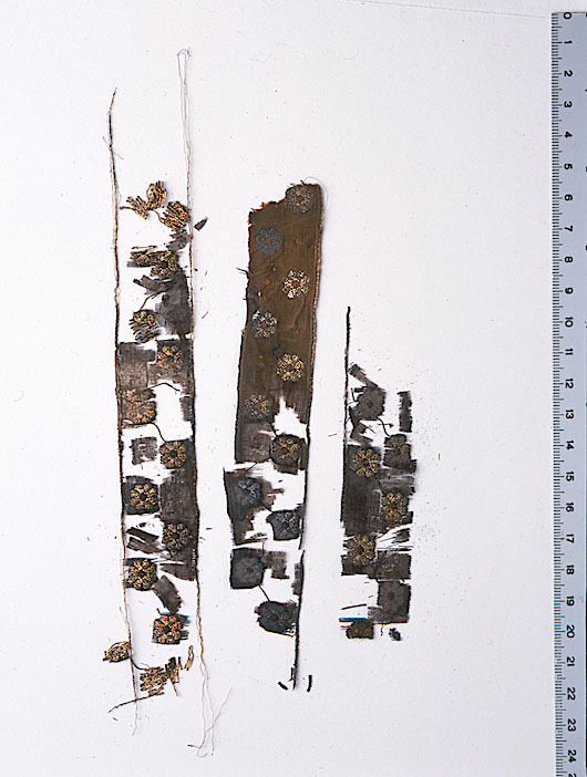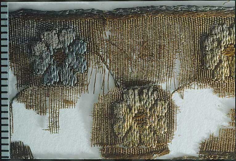 Fragment i tre delar av sidenband i varprips, satin, flotterande mönstervarp och broscheringar. De ursprungliga färgerna delvis förändrade, fragmentet numera i brunt och guld. Fragmentet ingår i en samling fragment tagna som prov ur drottning Kristinas kista vid gravöppningen den 13-14 december 1965. Varp: Silke med svag s-snodd. I stadkanten 6 stycken metalltrådar av virat förgyllt lan kring en silkekärna. Trådtäthet: 78 trådar/cm. Inslag: Silke i parallellt liggande fibrer. Trådtäthet: 28 trådar/cm. Material: Silke. Teknik: Varprips, satin, flotterande mönstervarp och broscheringar. Bottenväven är varprips. Stadkanten har varp av silke och metalltrådar ca 1 mm bred. Därefter följer en ca 1,5 mm bred rand i varpsatin och ett lika brett parti av varprips. Därefter följer broscherade blommor i sicksack (broscheringen löper fritt), i mitten av varje blomma finns en mouche av flotterande varp som återkommer mellan varje blomma (den flotterande varpen ligger lös på avigsidan). Mouchen utgörs av varp som flotterar över 3 inslag 2 ggr, över 5 inslag 2 ggr, över 7 inslag 2 ggr tillbaka till över 5 osv. Kommentar: På det bäst bevarade bandpartiet syns små hål som efter stygn eller nålar. Nuvarande färg är brun.