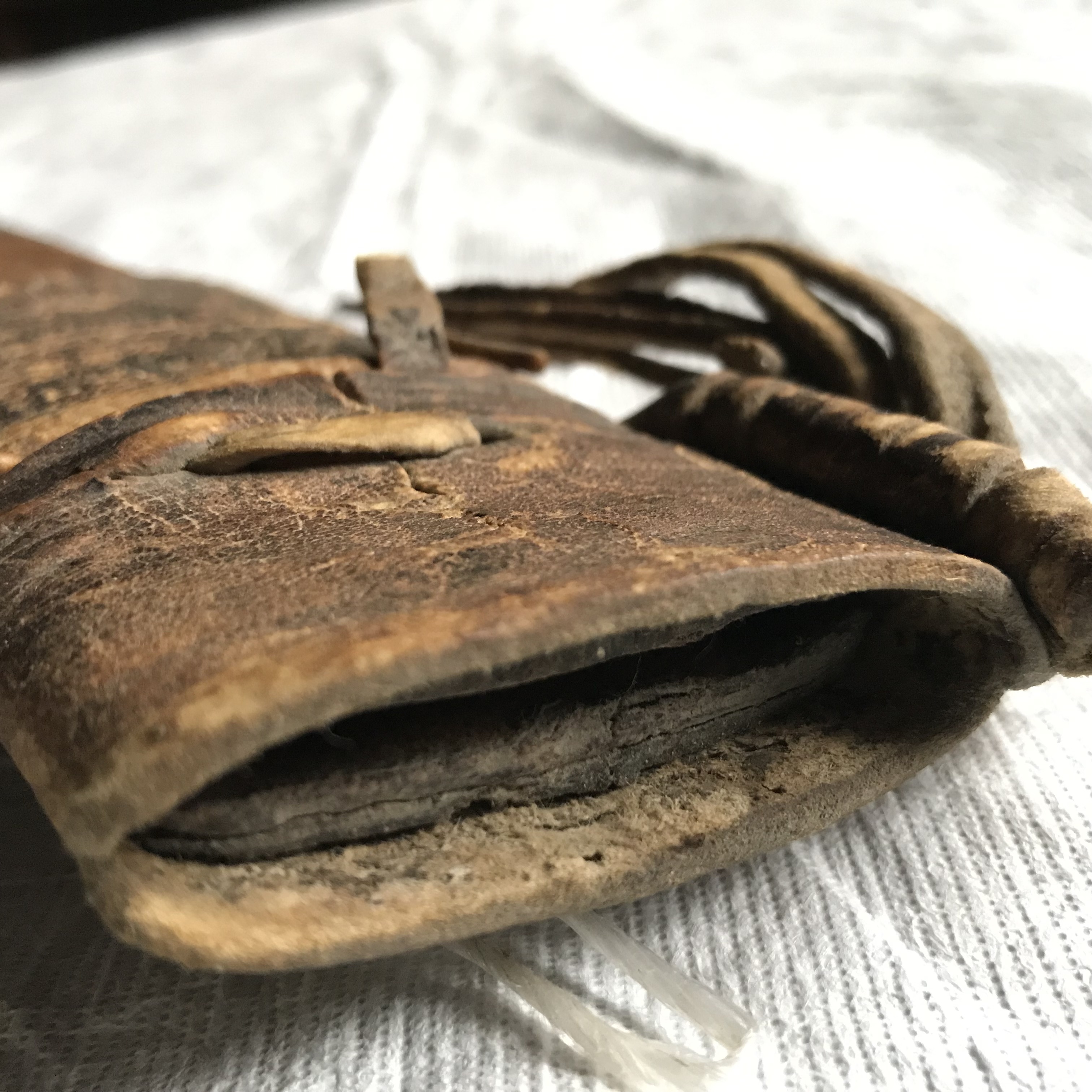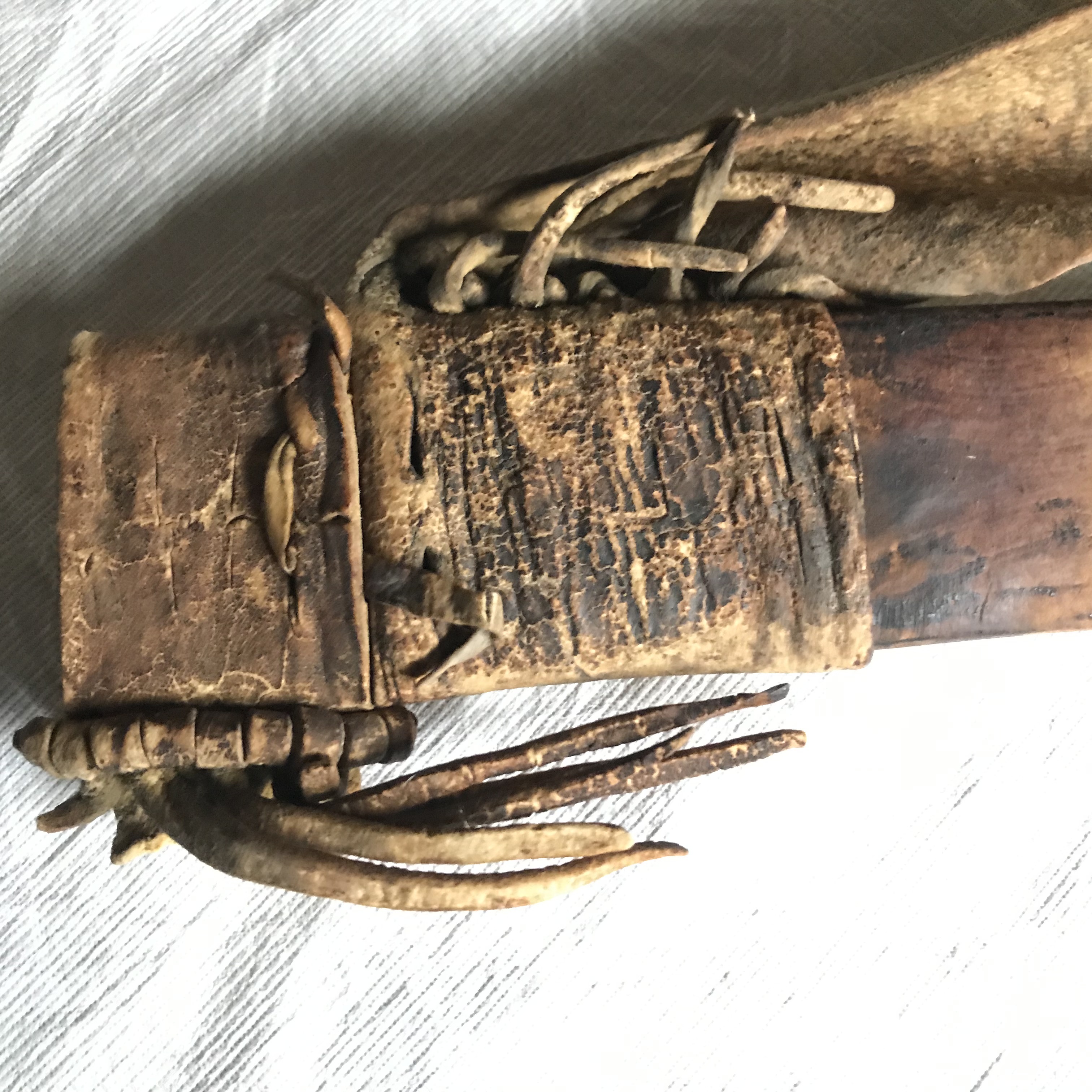 Klädd med svärtat läder,hopsydd längs insidans mitt. Blindpressade linjeornament. Doppsko i form av en stålskoning utmed baljans kant. Kring överdelen bäranordning: Remmar av sämskad hjorthud. Bäranordningen ej fullständig.