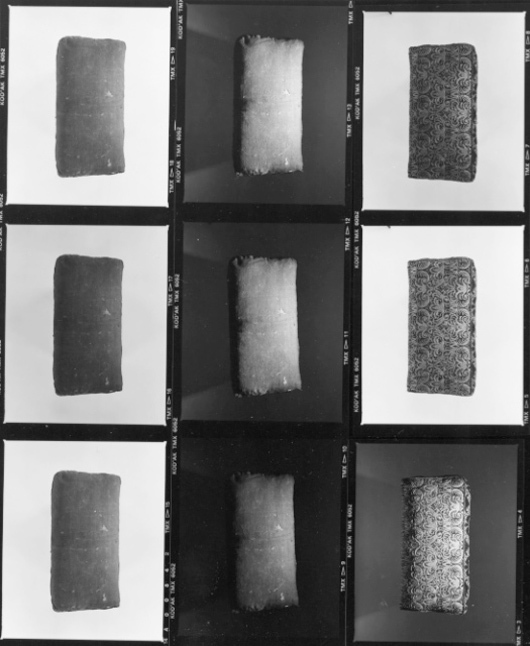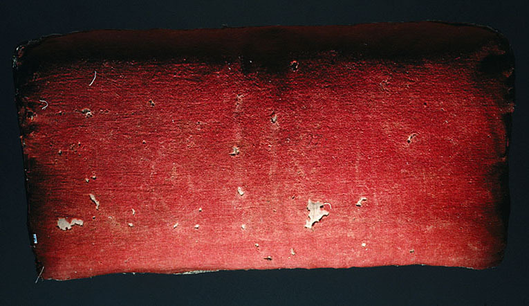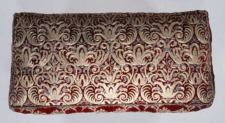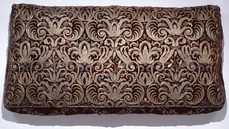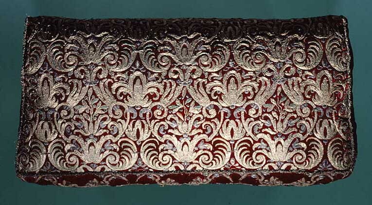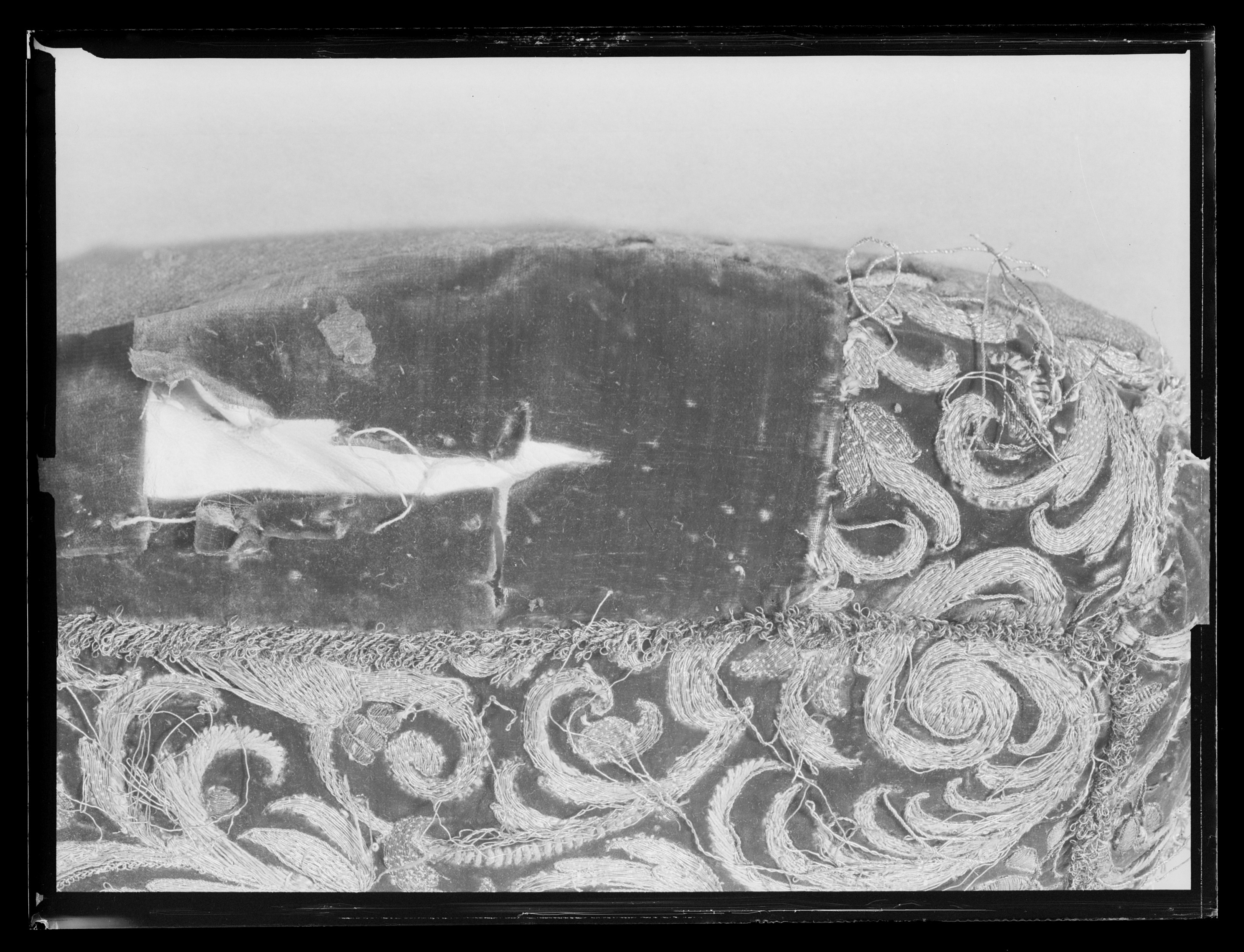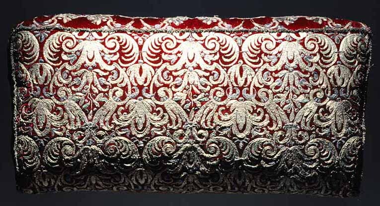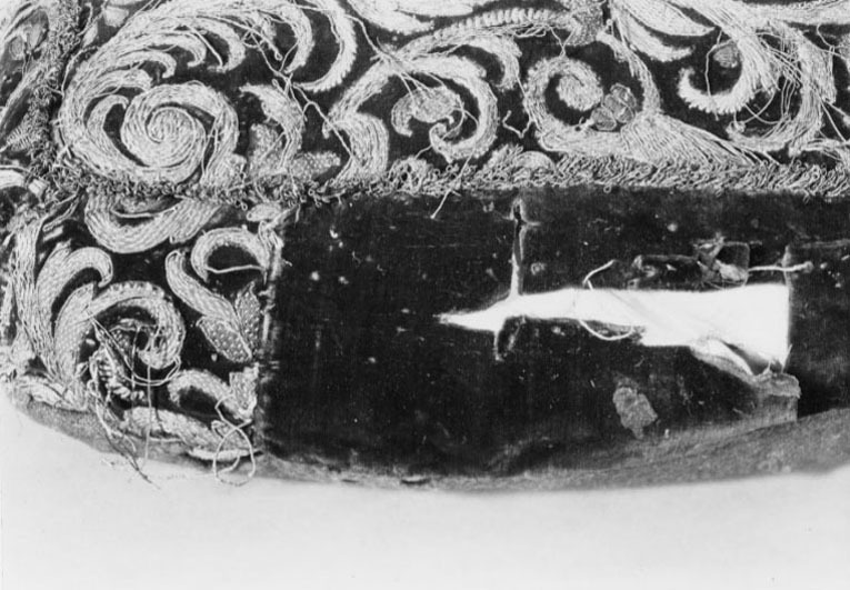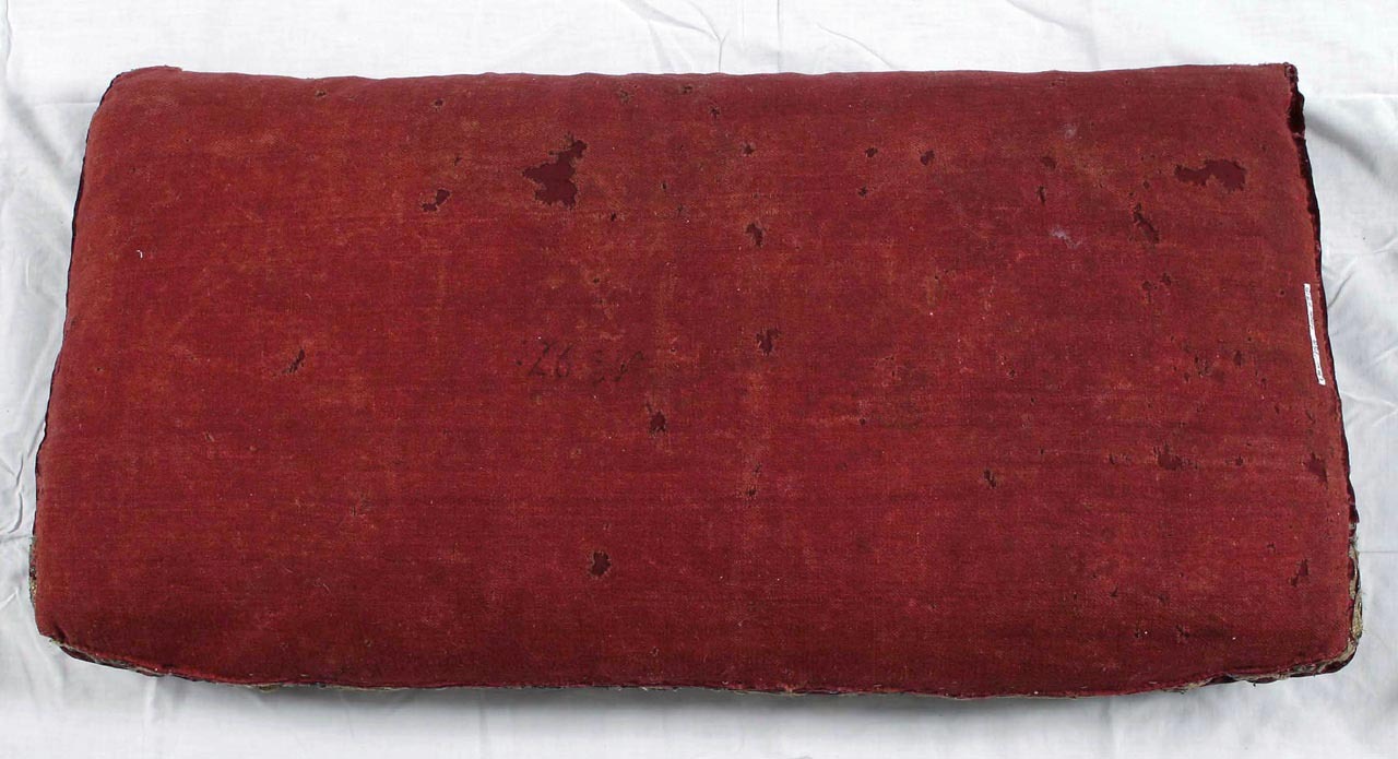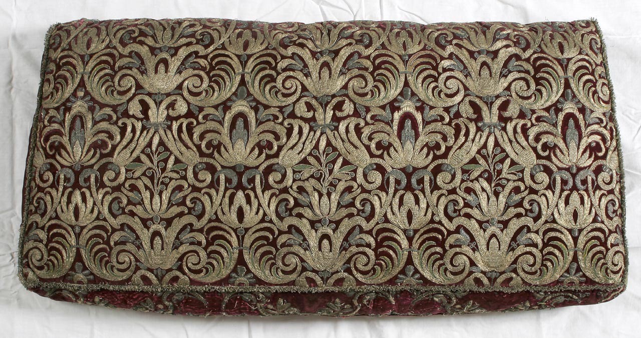 - Dyna af rödt sammet, enkel, broderad i guld och silfver, perlstickarearbete, samt kantad med silfver och guldfransar; fodret af sars (skadadt).