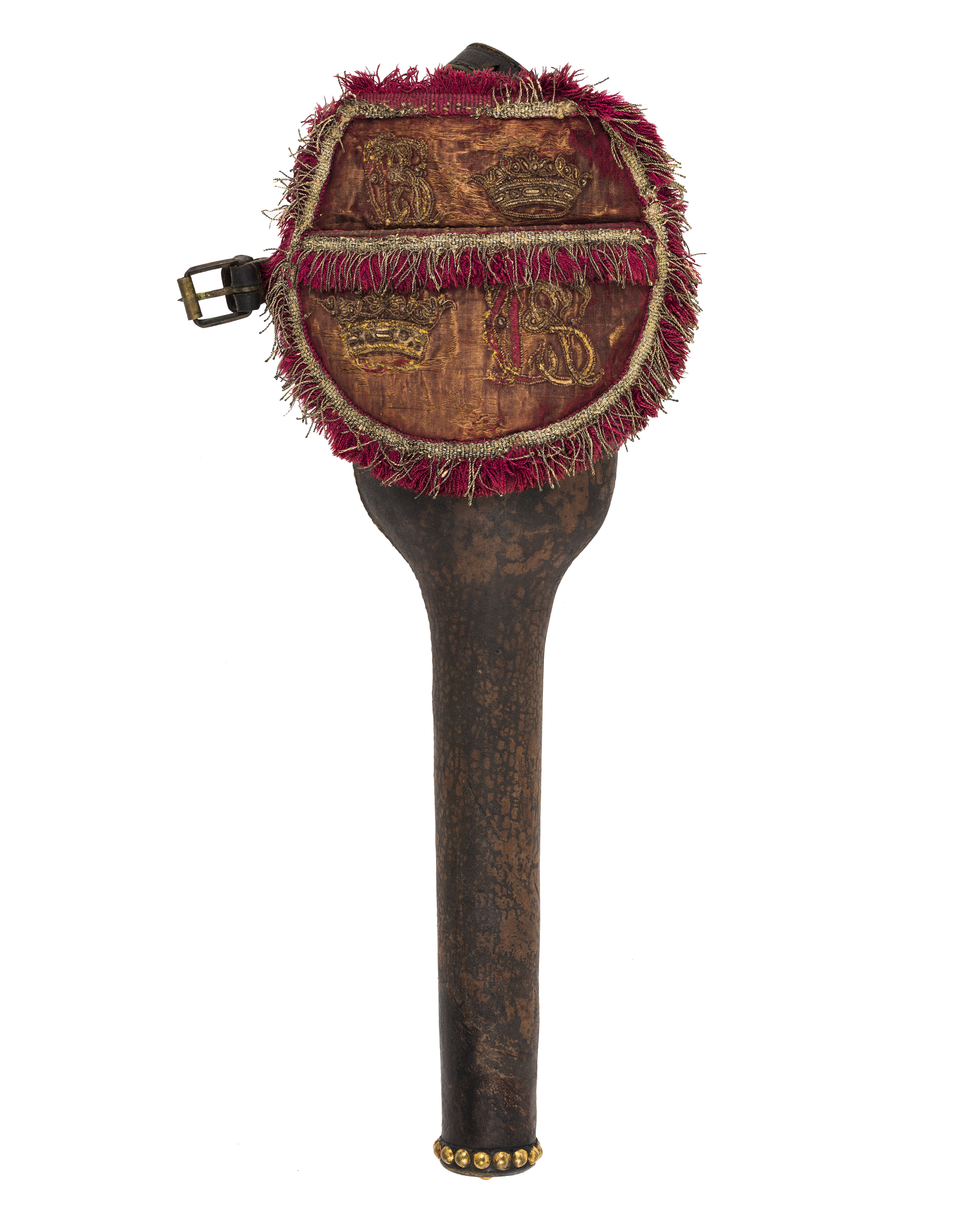 Hölster helt överklätt med brunt skinn, upptill kantat med svart skinn. Nedtill runt kanten femton förgyllda mässingstännlikor samt på undersidan en i mitten. Upptill på sidorna vertikala hällor för hölsterrem. Tillbehör: Hölsterrem av svart läder fodrad med vitt läder, sölja av mässing. Rundad kappa klädd medröd sammet fodrad med svart skinn och kantad med silvergalon och silkesfrans. På utsidan en ficka kantad med silvergalon samt broderat monogram, två stycken: "CRS" (Karl XI) samt tvåöppna kronor.