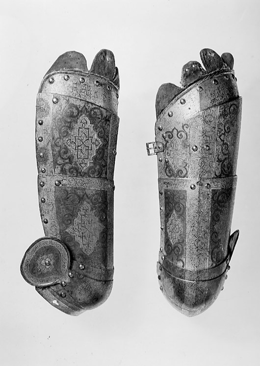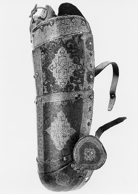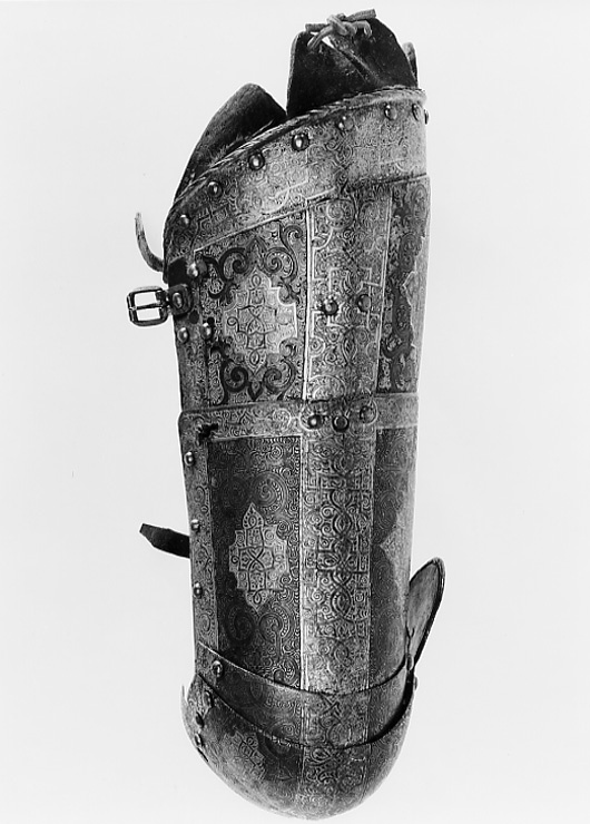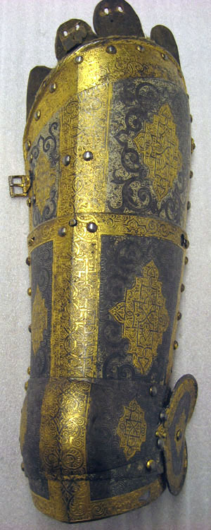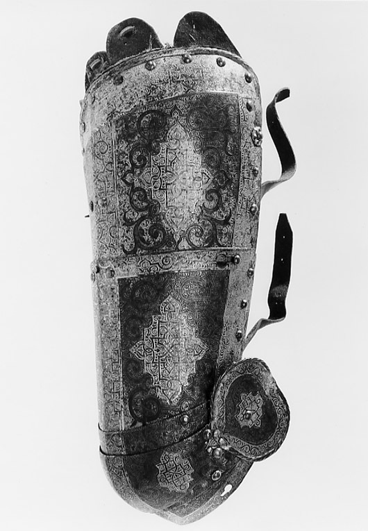 - 1 rustning af jern, helt och hållet etsad i ornamenter, hvilka äro dels förgyllda dels ifyllda med en hvit massa, rustningen, som uppgifves hafva tillhört konung Christian II, består af: hjelm i 5 delar med slutet visir, hakbetäckningen att öpna på midten, kammen hög, starkt bakåtsluttande, för hjelmbusken en hylsa, muttern på ena sidan af visiret jemte knappen till fjedern på öfre visiret borta, hjelmen invändigt fodrad med stoppning, öfverklädd med sidensars,