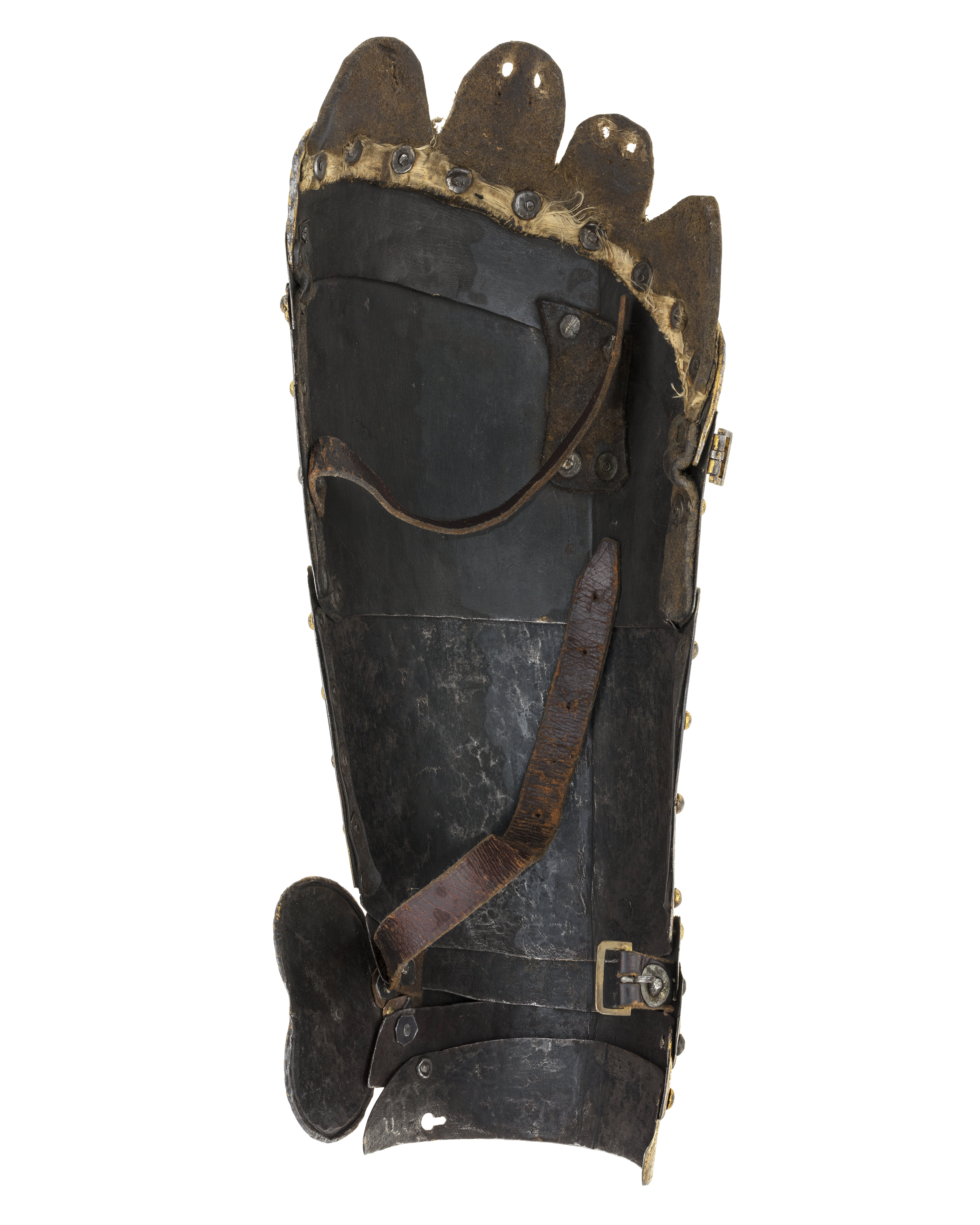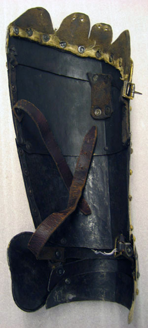 bröstharnesk med rörliga betäckningar för axelvecket, 2:ne slöjor och tornerhake med ledgång, bukbetäckning i 3 delar, fästad vid bröstharnesk, 2 lårlappar, hvardera i 4 delar med 2:ne slöjor, ryggharnesk med höftbeteckning i 2:ne delar och 2:ne rörliga spännskenor,