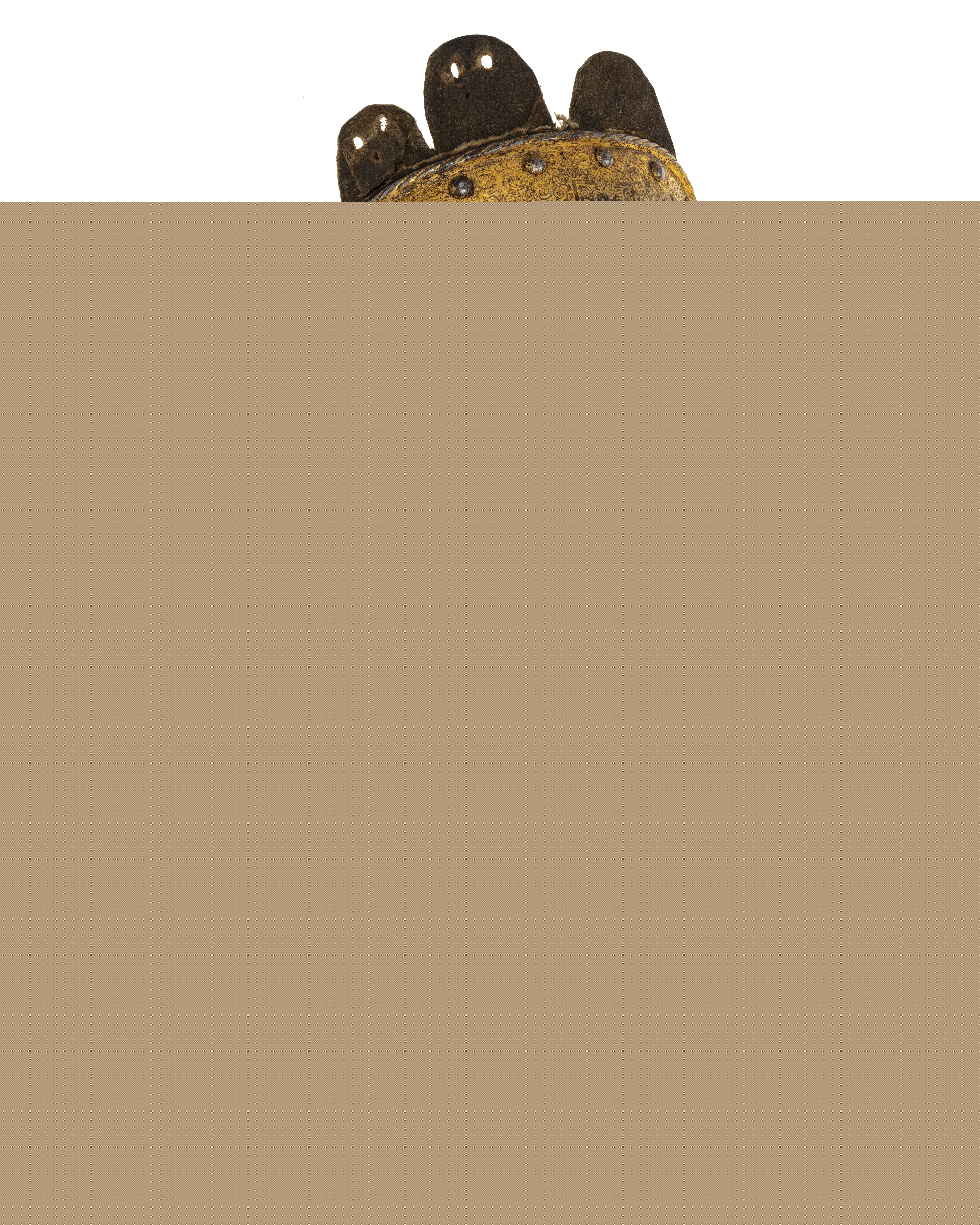 - 1 Sluten Hjelm af drifvit Jern, rikt incrusterad med GUld och Silfver, med en stoppad SIdentygs mössa