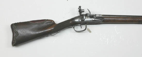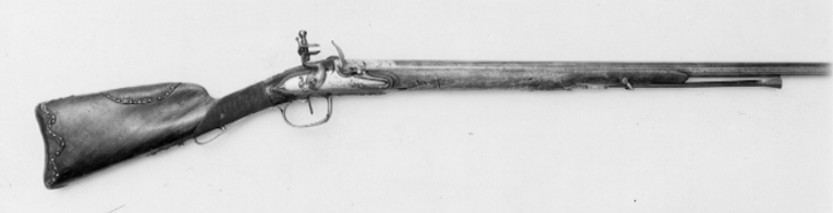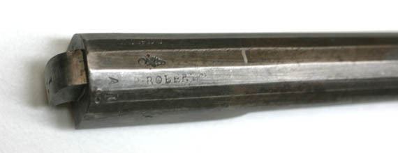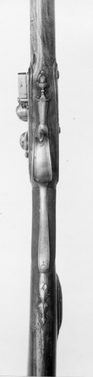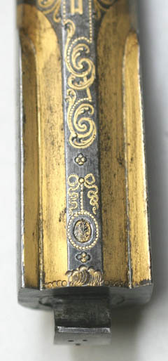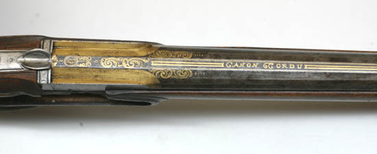 Sextonsidig pipa, canon tordu, med baskyl. På pipans undersida stämplat: "ROBERT // A I" samt stämpel "A C" med korsade palmkvistar (St Etienne). På haken I och två punkter. På kammarens översida en oval stämpel med två korsade palmkvistar omgivna av LC (Stöckel nr 181, Nicolas Le Clerc). Punsad och förgylld dekor, inlagt med guld: "CANON TORDU". Riktmedel: Korn av silver, skålsikte på svansskruvbladet. Fästning: Pipan fäst med krysskruv, ett engelskt pipstift samt rembygelns skruv. Flintlås med välvt 1åsbleck av fransk typ med graverad signatur: "LE SAGE A PARIS". Rundad hane med lös överkäke, "dog-catch" säkring. Sparsam, graverad dekor på hane, fängpanna och eldstål. Rundad fängpanna med fals, fasade kanter till krutskålen, eldskärm med hål, likaså vid eldstålsaxeln. Eldstålsfjäder med kort fjäderlöv. Fästning: Två låsskruvar. Brun, något utskuren halvstock med nätskuren kolvhals, oval tumplåt av silver. Kolvänden och kindläget stoppat och överdraget med röd saffian, inkantning med silvergalon. Profilerad och graverad spetsrörka. Profilerad och graverad varbygel med främre armen utformad som en pokal på piedestal, bakre armen delvis fri, avslutad med bladliknande spets. Separata låsskruvbrickor av silver, liksom tumplåten omramade av i vågor inlagd silvertråd, silvertråden likaså inlagd i låsblecksform. Rektangulär, främre rembygel, den bakre saknas och har ersatts med en ny skruv. Tillbehör: Laddstock av valfiskben med skoning av vitt ben.