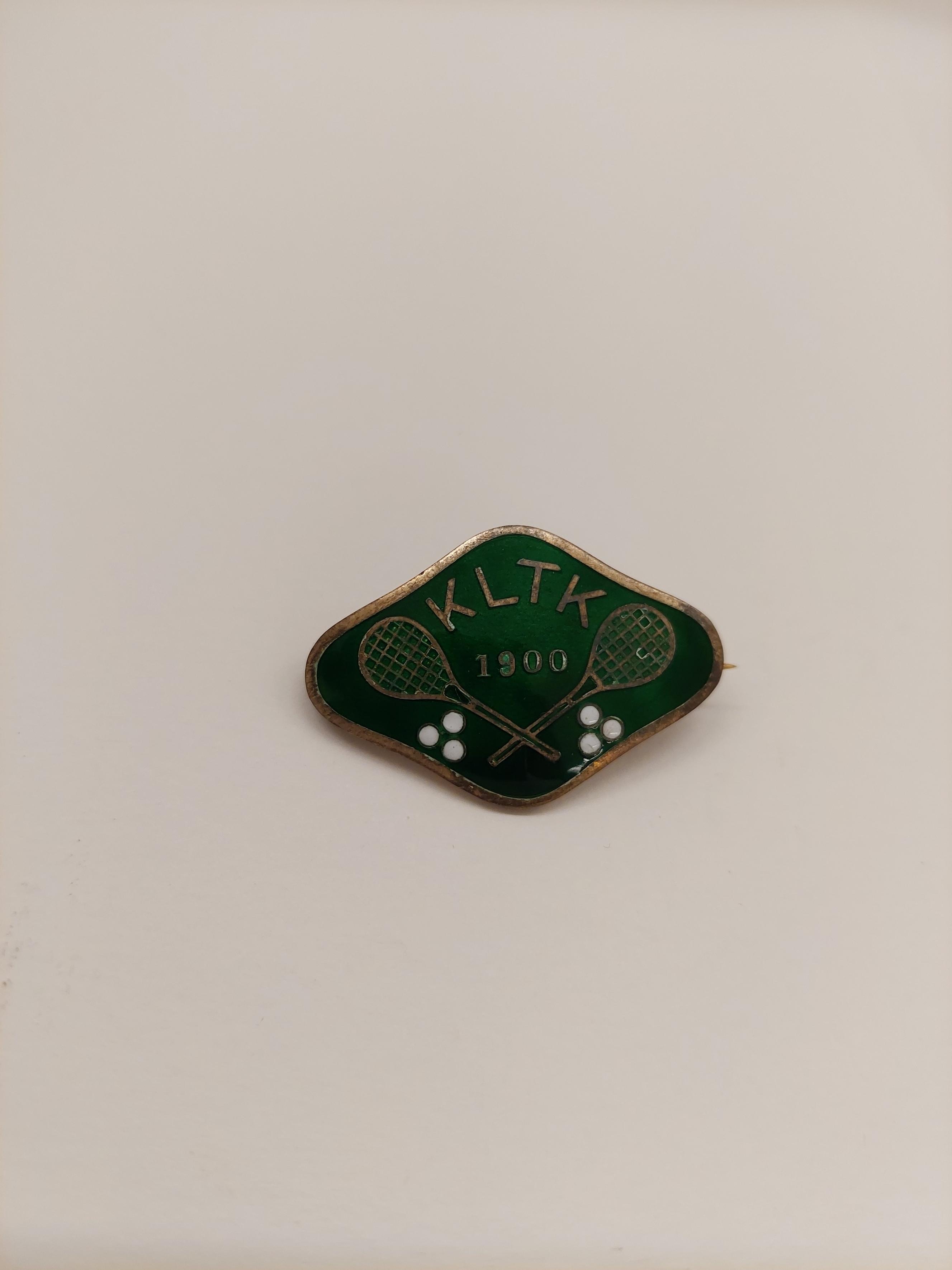 Liggande, rombiskt, svagt välvt märke av gulmetall med rundade hörn och något insvängda sidor. Grön emalj, däri "KLTK (( 1900" samt två korslagda rakettar och 2x3 vita bollar. Frånsida slät, otydlig stämpel, horisontellt placerad säkerhetsnål.