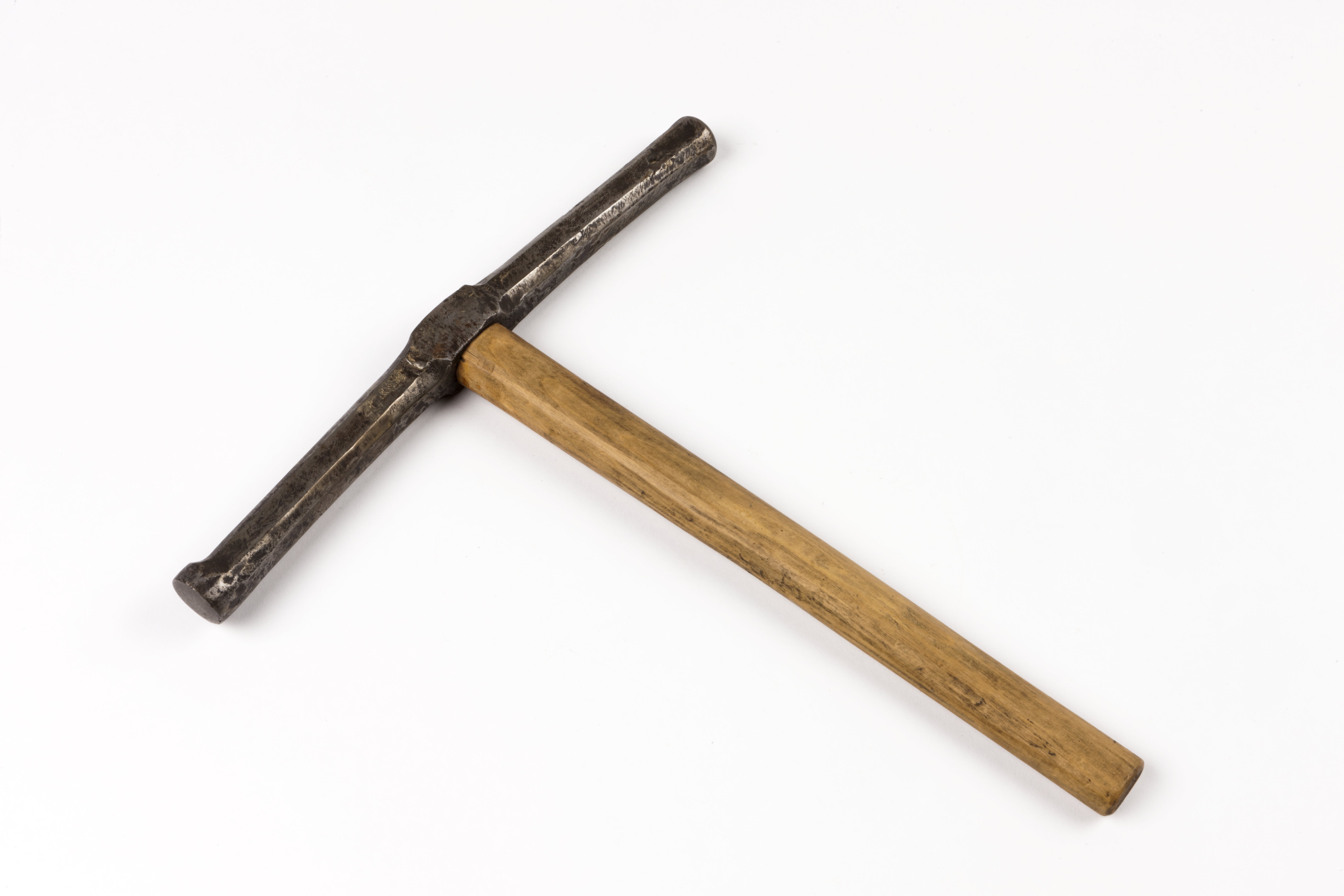 Rund, kupig bana i ena änden och rund, plan i den andra. Åttkantigt huvud. Träskaft av lövträ. Huvudet stämplat "SH" två gånger.