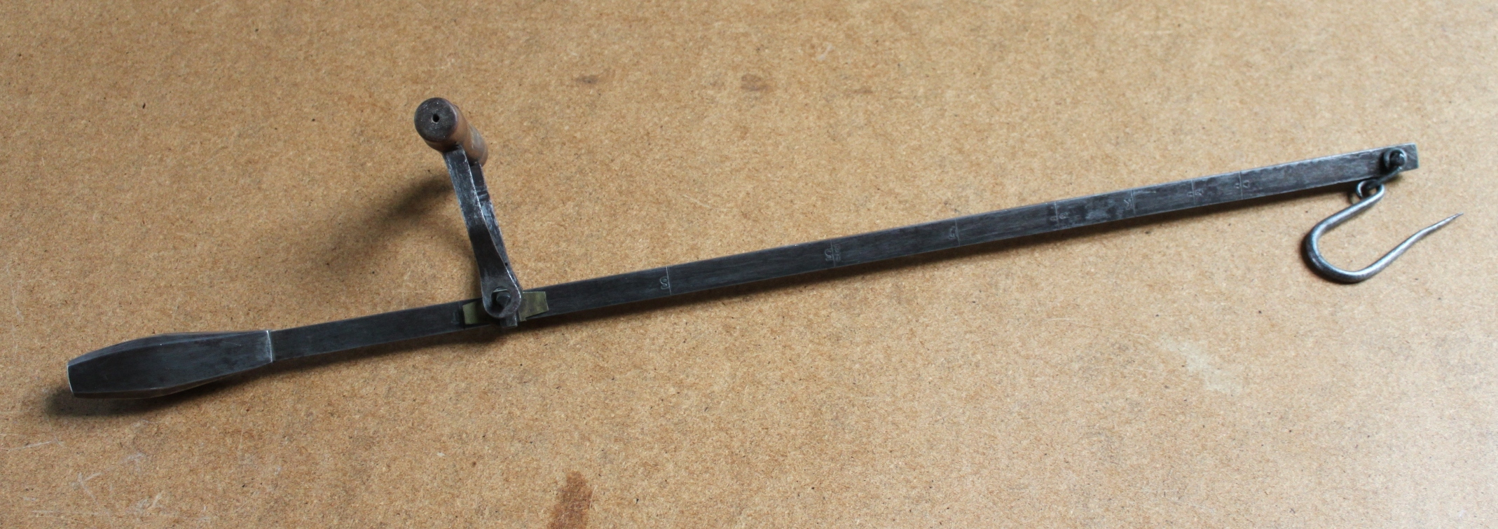 Handtag av björk på två vinkel skänklar. Löpare av mässing, stämplad med en krona. Stämplat på motvikten: Tre kronor samt “ 1846 II 4 FM”.