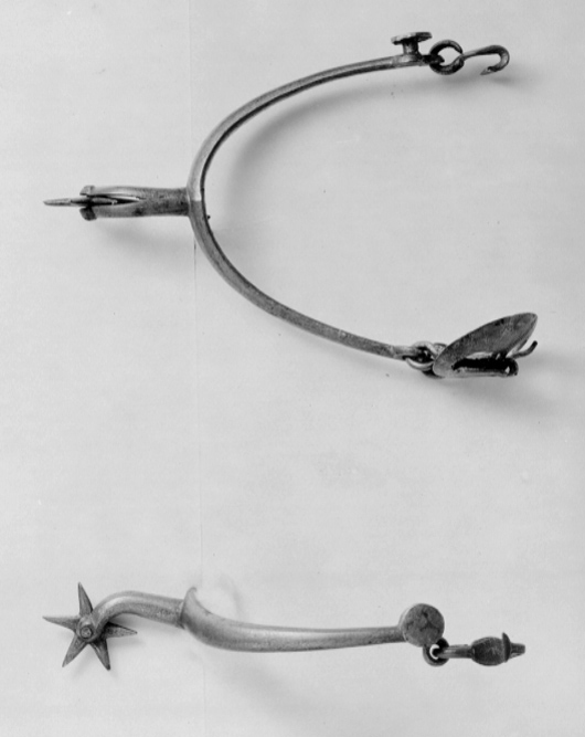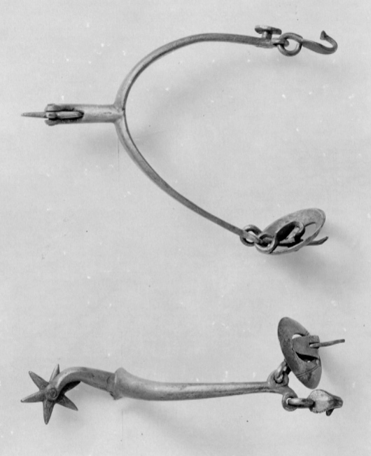Sporre av förtent stål med u-formade skänklar och ca 38 mm lång, i en båge nedåtböjd hals. Sexuddig klinga. Vid ena skänkelns ände en rund slät knapp på hals samt en ringformig hållare med hake (för hålfotsremmen). I den andra skänkelns ände rund,stor remsölja med breda kanter samt hake (för hålfotsrem).