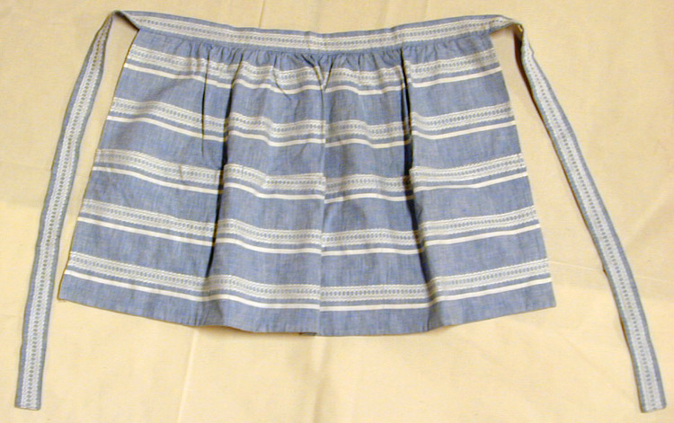 Blått midjeförkläde med vita ränder och vid rosengång, maskinvävd. Ett 19 cm bretttygstycke fastsytt med blått bomullstyg.