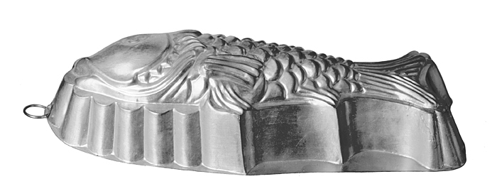 ALADÅBFORM (fiskform) av bleckplåt Pressad, med något snett uppstående tvärvågig kant med rakt utstående bräddkant; bottnen kupig, i form av en fisk; i främre änden en rundstavig ring, rörlig i en omvikt plåtflik, fäst med en nit. Höjd: omkring 6,3 cm.; längd: 32 cm.; bredd: 13,5 cm.