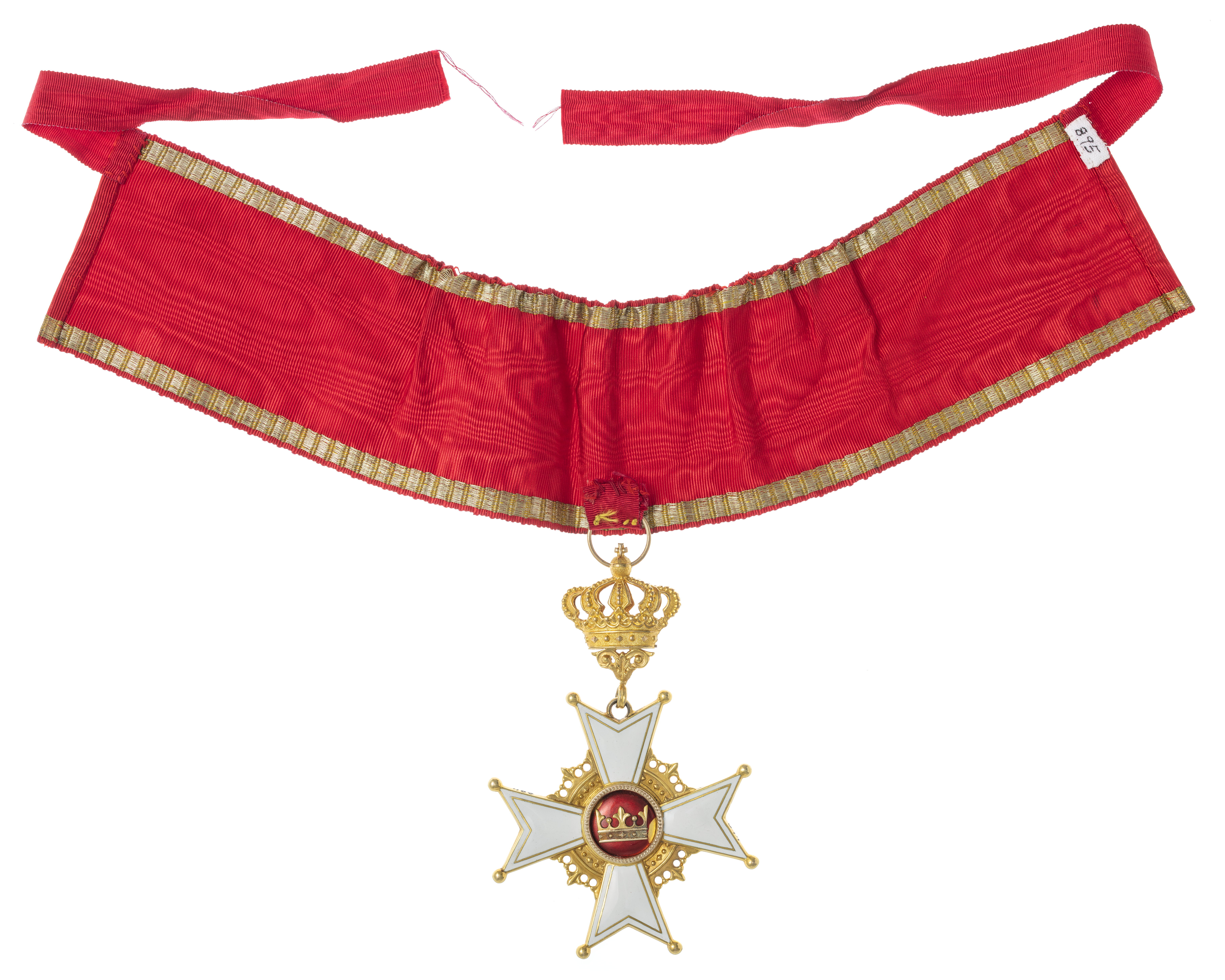 Halsband av röd sidenmoaré med kantränder av invävd guldtråd, bandet rynkat i överkanten. Två knytband av röd sidenmoare. Tecknet fäst vid bandet med påsydd remsa av knytbandet.