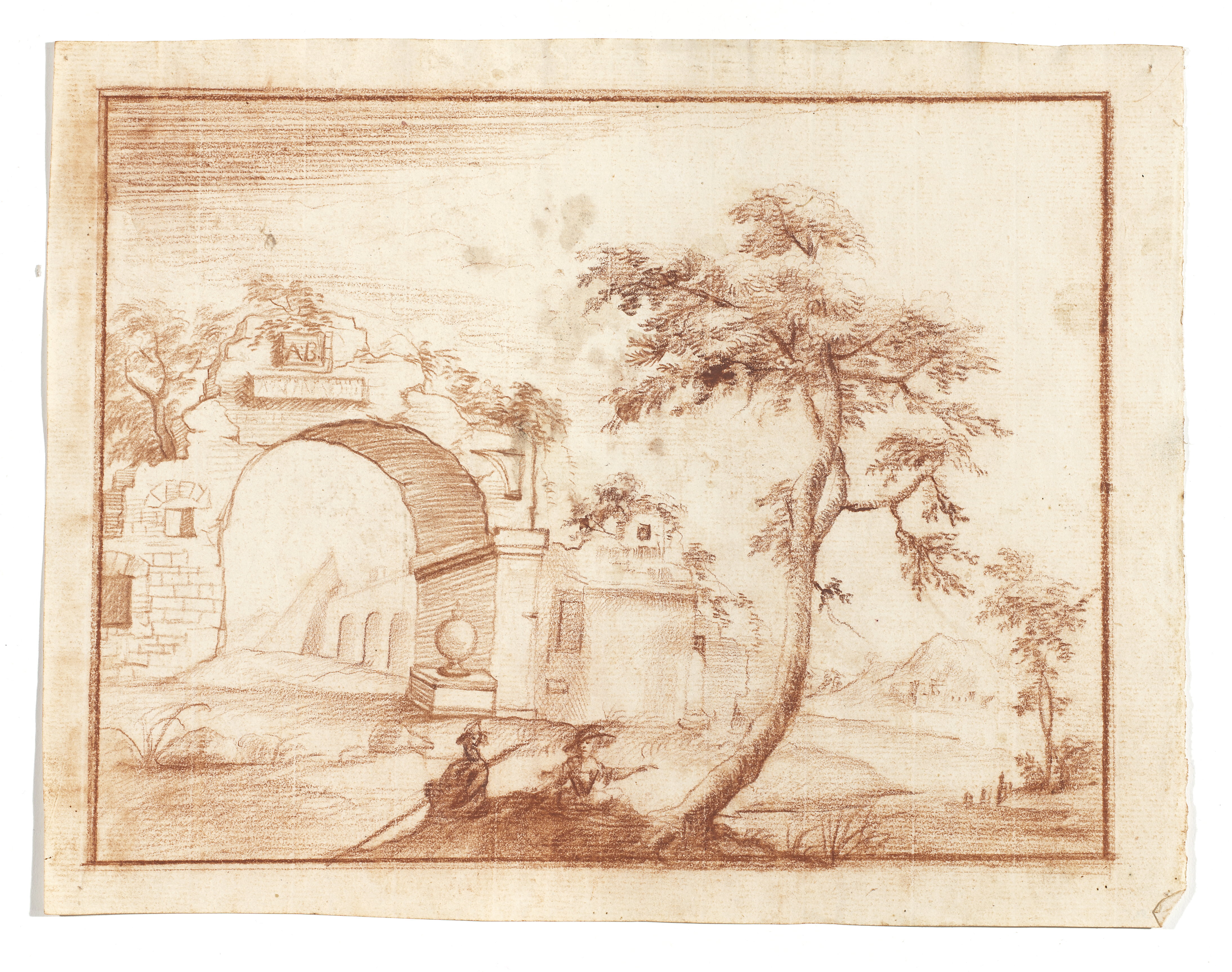 Rödkriteteckning föreställande ruinlandskap med herde och herdinna.