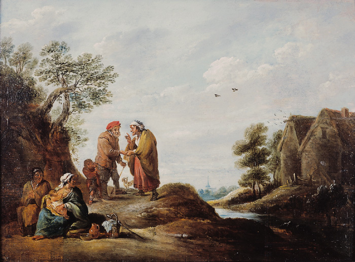 Romen spår i bondens hand medan pojken stjäl ur dennes ficka. Målningen bör vara en kopia från tiden. Originalet, som är signerat med konstnärens initialer och något mindre till formatet, är känt genom en auktion från 1984 (London 1984, nr 49). -*- The gipsy is telling the farmer´s fortune by reading his palm while the boy picks his pocket. This painting is probably a contemporary copy. The orginal, signed with the artist´s initials and somewhat smaller in format, is known from an auction in 1984 (London 1984, no. 49).