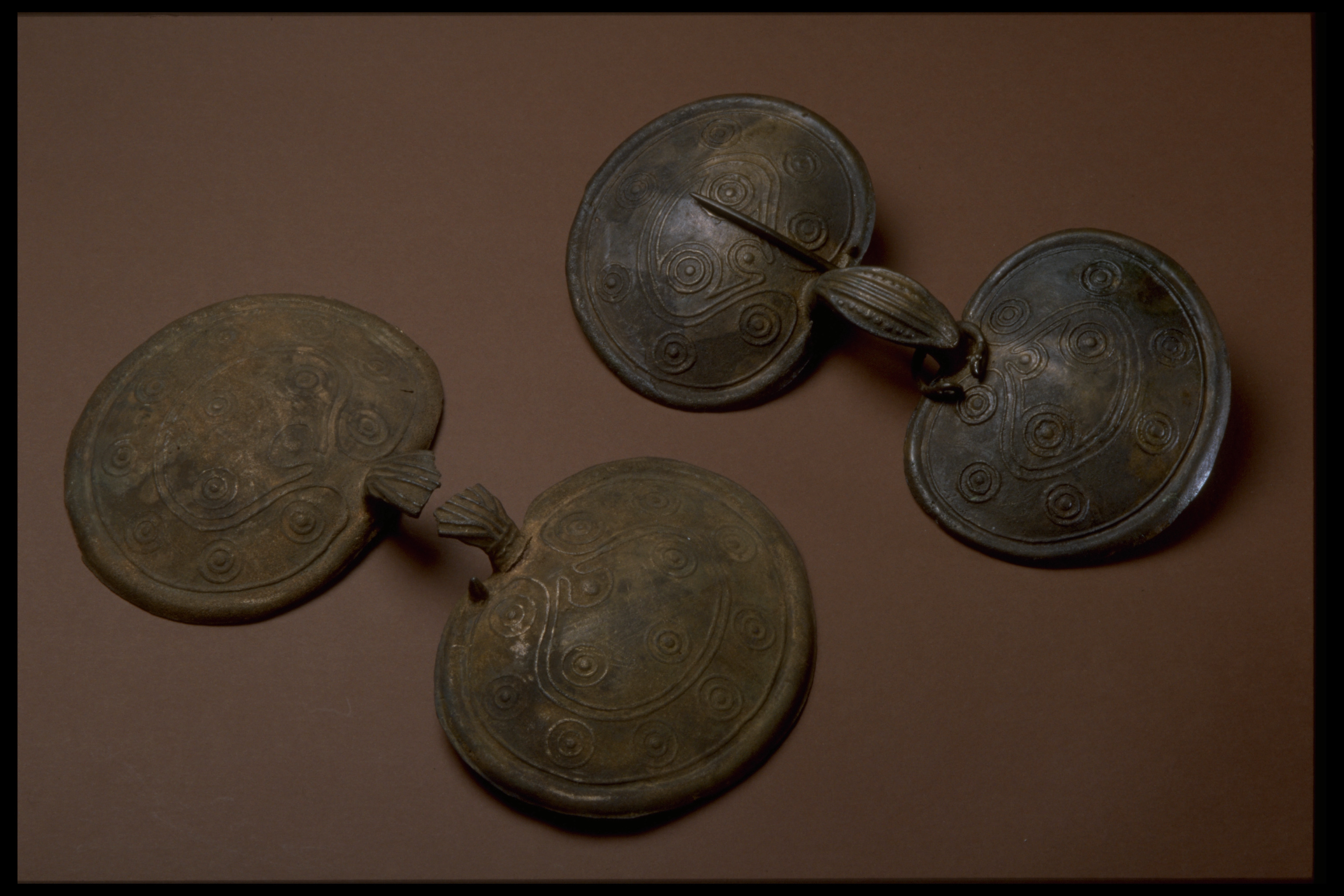 Glasögonspänne av brons, ornerad på både över- och undersida. Är ornerad med händer på undersidan.