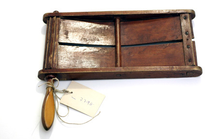 En rektangulär harskramla av rödbetsat trä, bestående av en ram på vars kortsida är fäst två tunna rektangulära trästavar vilka ligger an mot ett långt kugghjul vars axel är förlängd till ett spolformigt handtag.