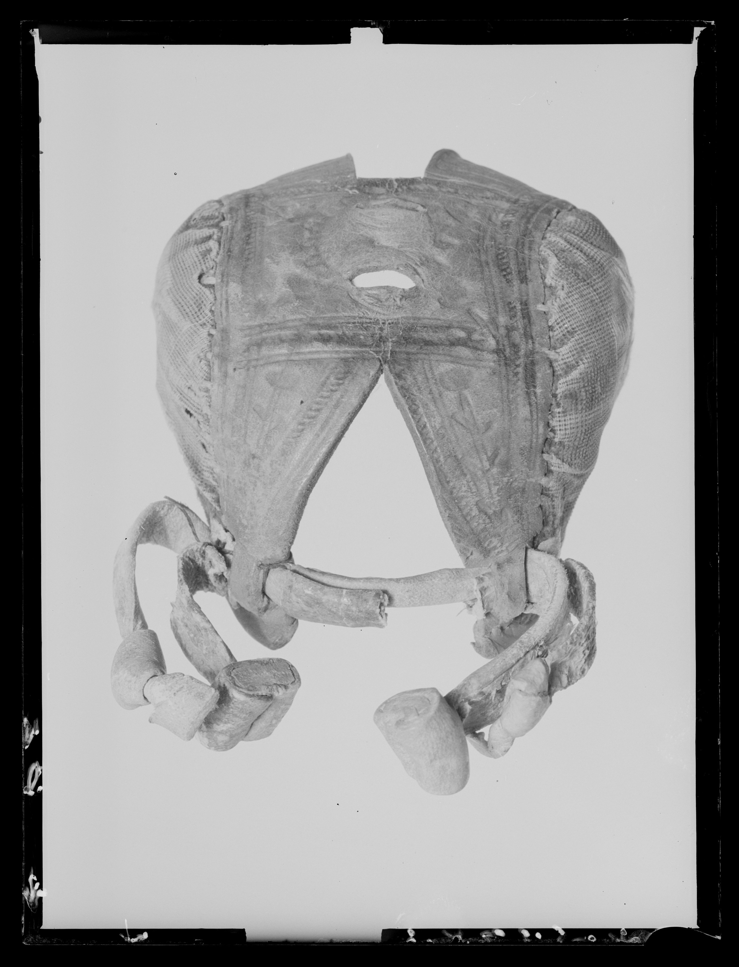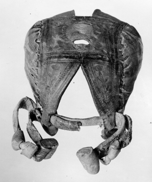 Huva av ljusbrunt läder, på mittpartiet pressad dekor, på sidorna klädd med röd sammet. På hjässan två skåror för plym eller dylikt. Nedtill bak prydd med vita läderremmar, slutande i knutar och knoppar.