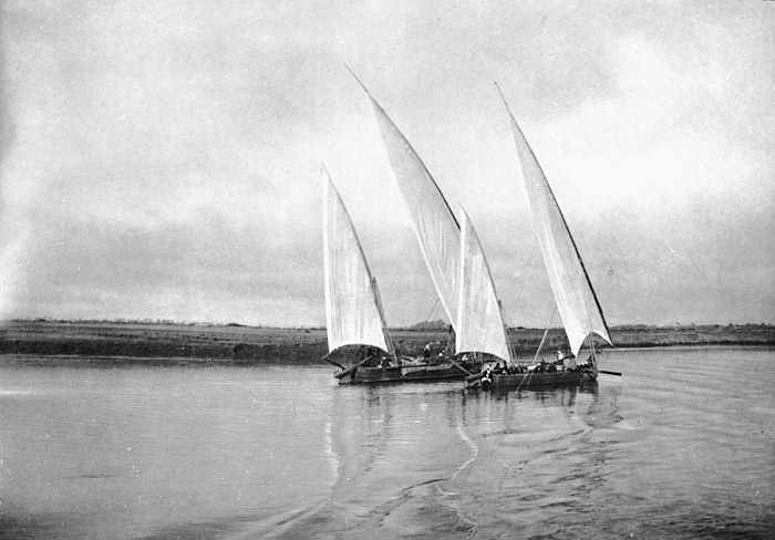 Felucker på Nilen, Egypten. Text på fotografiet: Des falûkes sur le Nil. Fotografierna LXVI:M.01.- 201. kommer från resan till Egypten och Sudan som Wilhelmina och Walther von Hallwyl gjorde vintern 1900-1901. De lämnade Sverige den 5 november 1900 och fortsatte från Egypten till Palestina den 28 mars 1901. Med på resan var döttrarna Ellen med maken Henric de Maré och Irma med maken Wilhelm von Geijer. Wilhelminas sällskapsdam, fröken Ida Uhse reste också med. Under en del av resan anslöt sig ledamoten av Internationella domstolen i Kairo, assessorn Otto Conrad Waldemar Cedercrantz med makan Anna Elisabeth. Vid resan uppför Nilen hade Walther von Hallwyl hyrt ångfartyget Columbia med besättning. Båtresan startade i Kairo 27 december 1900, gick ända till Wadi Halfa varifrån man reste vidare med tåg till Khartum och tillbaka till Wadi Halfa. Båten vände åter i riktning mot Kairo, men det verkar som att sällskapet tog tåg sista biten, från Luxor. Henric och Ellen de Maré samt fru Cedercrantz lämnade båten redan då de passerade Luxor första gången. Resten av sällskapet återvände till Kairo den 1 mars. Fotografierna LXVI:M.01.-120. togs av resenärerna själva, de största av Ellen de Maré, de mellersta av Wilhelmina von Hallwyl och de minsta av Wilhelm von Geijer. Resten köptes av professionella fotografer i Kairo, de flesta från Studio Photogr. Artistique G. Lekegian & Cie. Alla uppgifter kommer från Ida Uhses reseanteckningar.