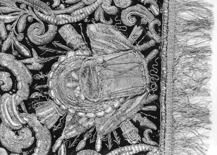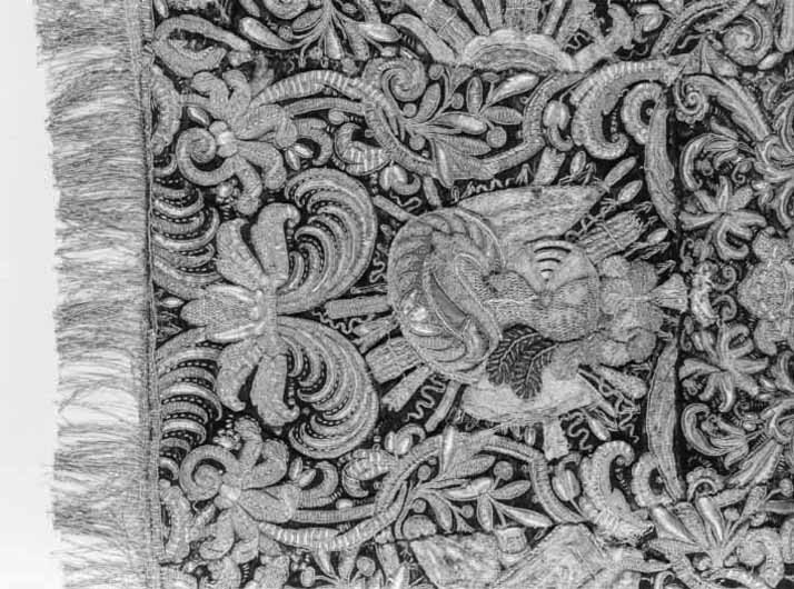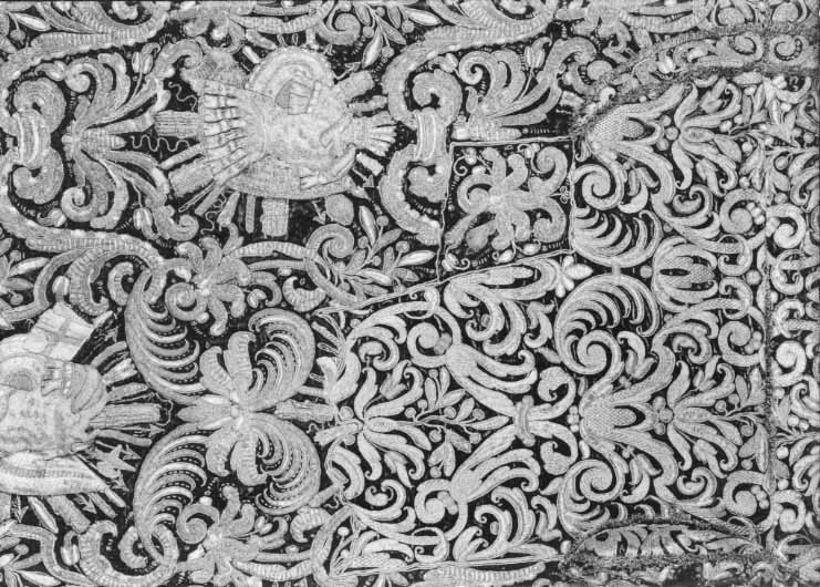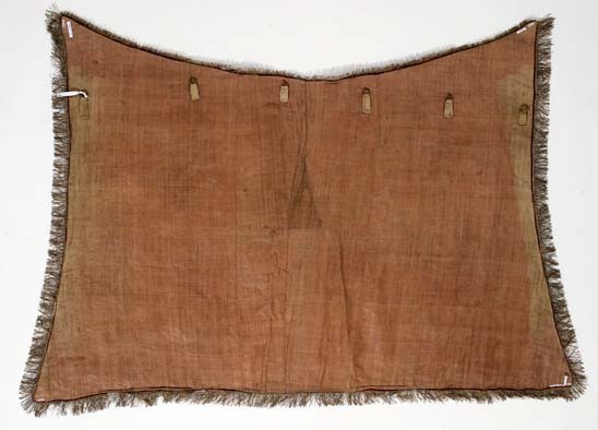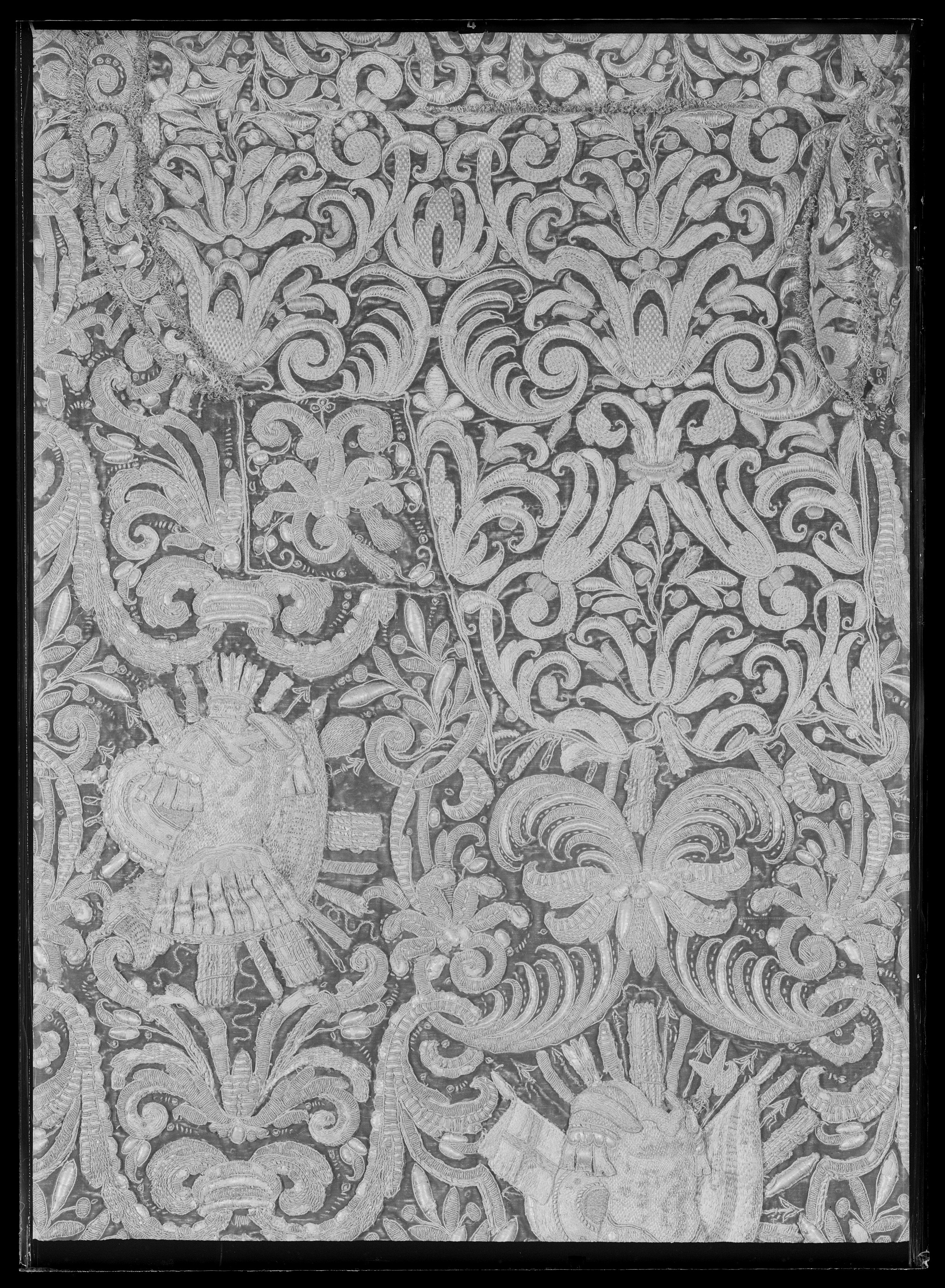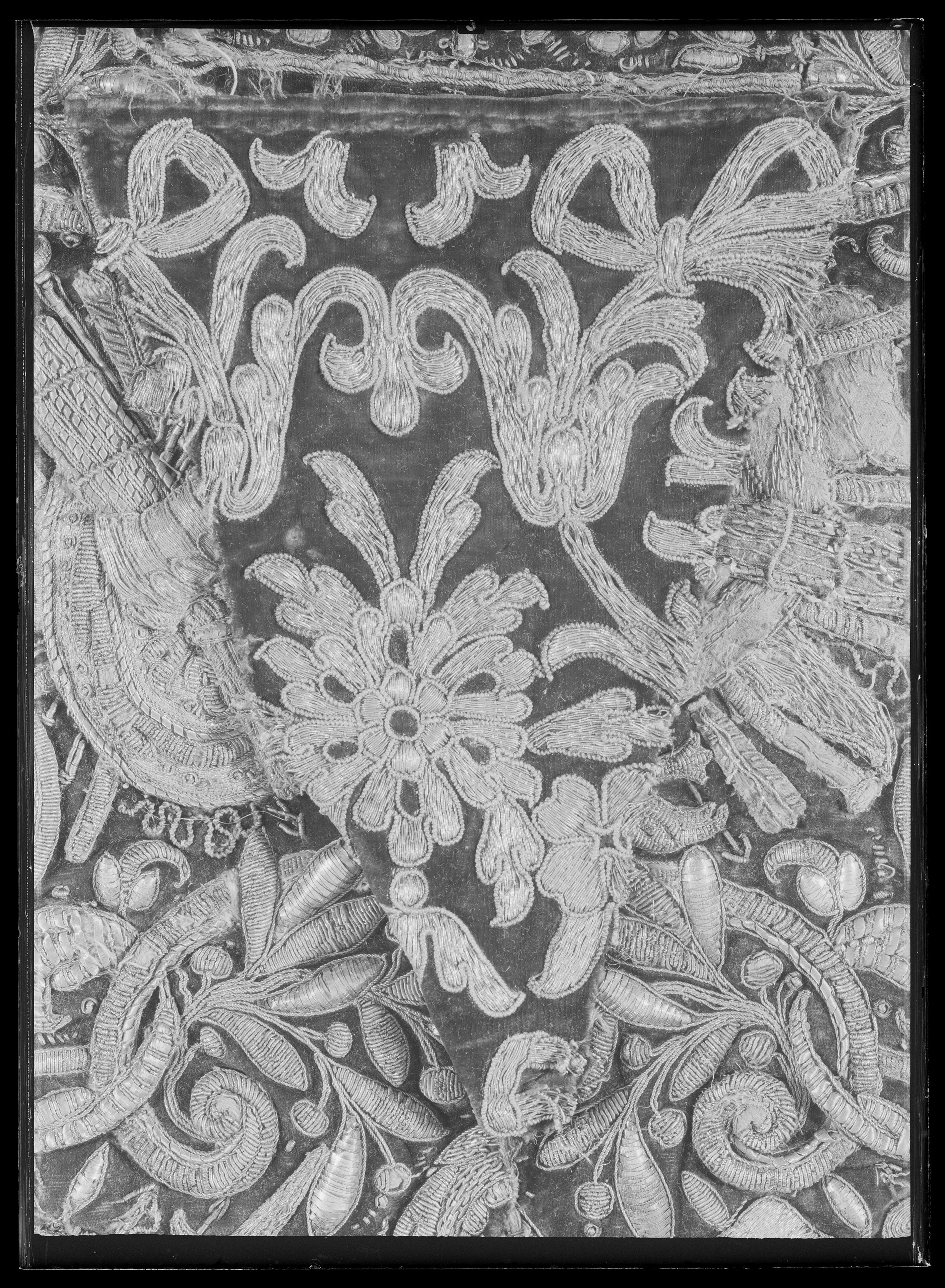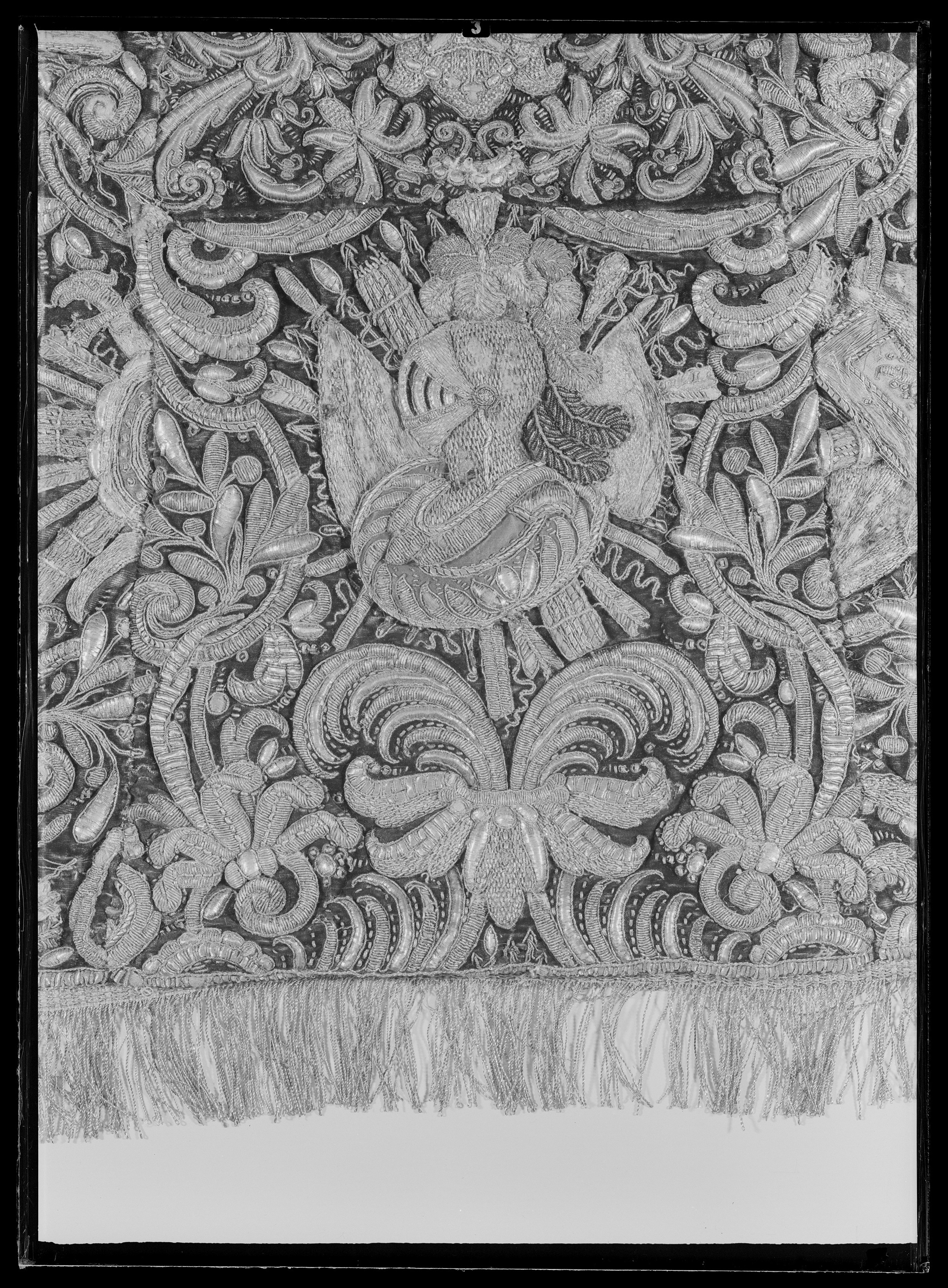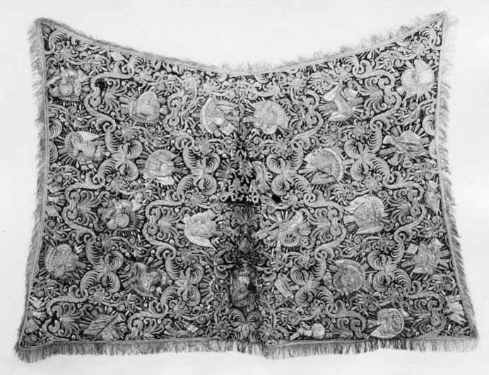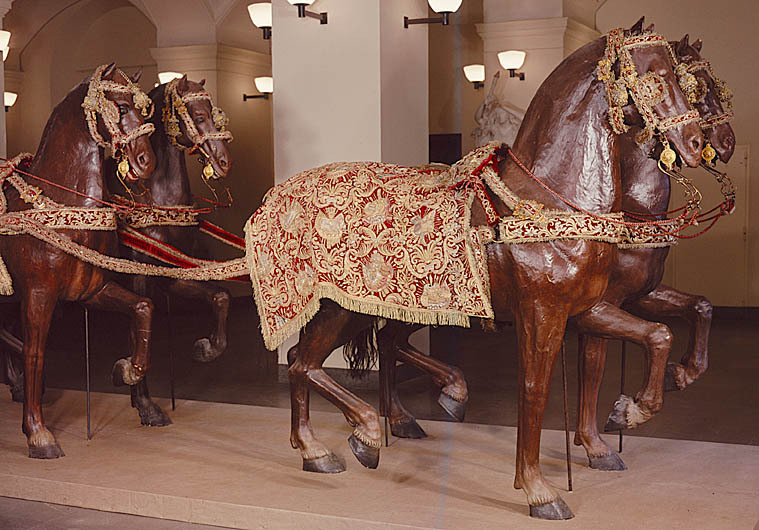 Bottentyg av röd sammet. Yttäckande applikationsbroderi i relief. Mönster av trofégrupper omramde av palmetter och olivkvistar. Längs kanterna en broderad snodd av plattare och rundare guldkantiljer. Broderi med tråd, lan och kantiljer av guld och silver. I trofémotiven även silke i gult, grönt, blått, rött, rosa, vitt och beige, några trofémotiv på sidenbotten. Läggsöm och plattsöm. Lagerkvistarna ej i applikation. Kavelfrans av guld och silver längs kanterna, 60 mm bred varav 10 mm stad. Foder av blekt ursprungligen rött linne i tub skaft. I samband med Karl XIII:s kröning 1809 har hästtäcket uppklippts längs mitten vari tillskarvats trapetsformiga kilar, från bakkanten l. bit från karosstakets kappa 310 mmlång och 300 mm bred vid basen. 2. bit från drottning Kristinas röda kaross med motiv av lejon och örnar 230 mm lång och 250 mm bred. 3. triangulär bit av guirlandbroderi från Karl XI:s kaross 250 mm lång och 180 mm bred löst fäst. Vid framkanten har 140 mm vänster om mittsömmen infällts en kil 260 mm lång och 100 mm bred, 90 mm till vänster om denna en 160 mm lång intagning. 160 mm till höger om mittsömmen en kil 260 mm lång och 105 mm bred, 100 mm till höger om denna en 180 mm lång intagning. 160 mm till höger om mittsömmen en kil 260 mm lång och 105 mm bred, 100 mm till höger om denna en 180 mm lång intagning.