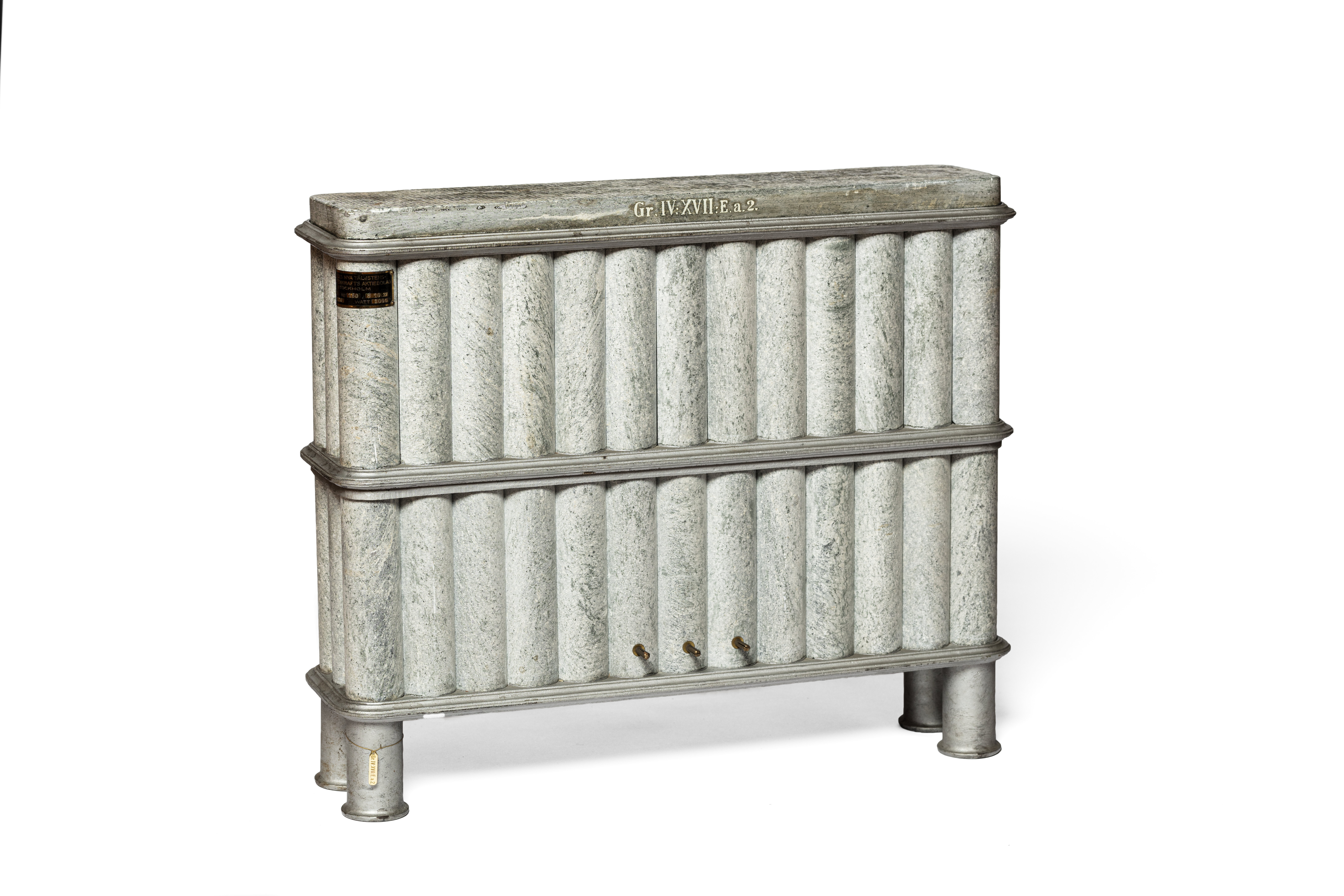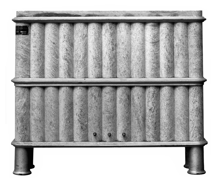 KAMIN elektrisk (2 000 watt). Täljsten med järn. Liggande rektangulär på fyra fötter. I form av tätt intill varandra ställda kolonner, upptill och nedtill samt på mitten till synes sammanhållna av ett profilerat järnband, bronserat med aluminium. Fötter av aluminiumbronserat järn, cylindriska med utstående nederkant. Höjd: 53,3 cm, längd: 63,5, bredd: 17,4 cm. Gåva till Wilhelmina von Hallwyl julafton 1927 från dottern Ebba Johanna Cecilia von Eckermann. Inköpta hos Handöls Nya Täljstens- och Vattenkrafts-Aktiebolag. Aldrig använd.