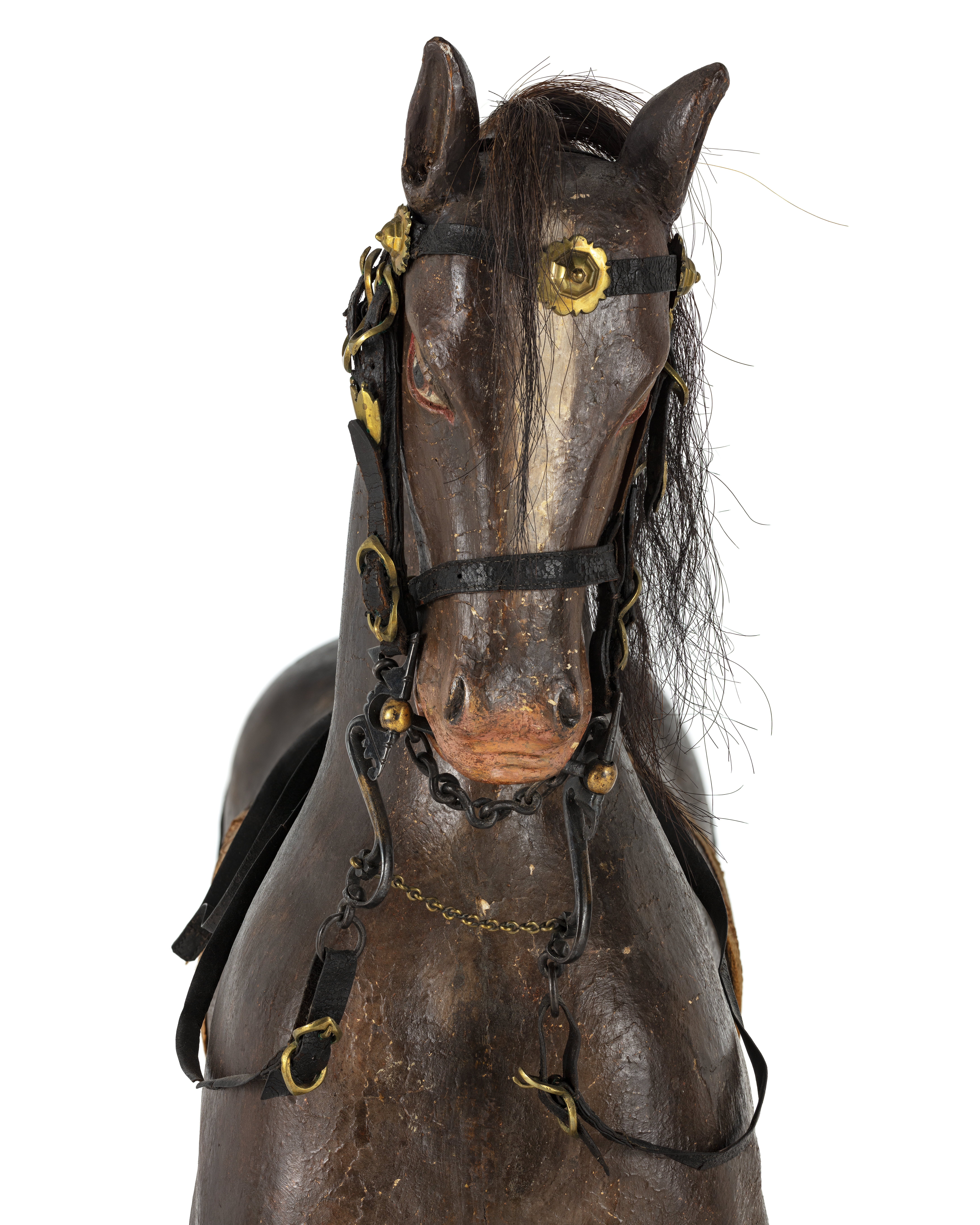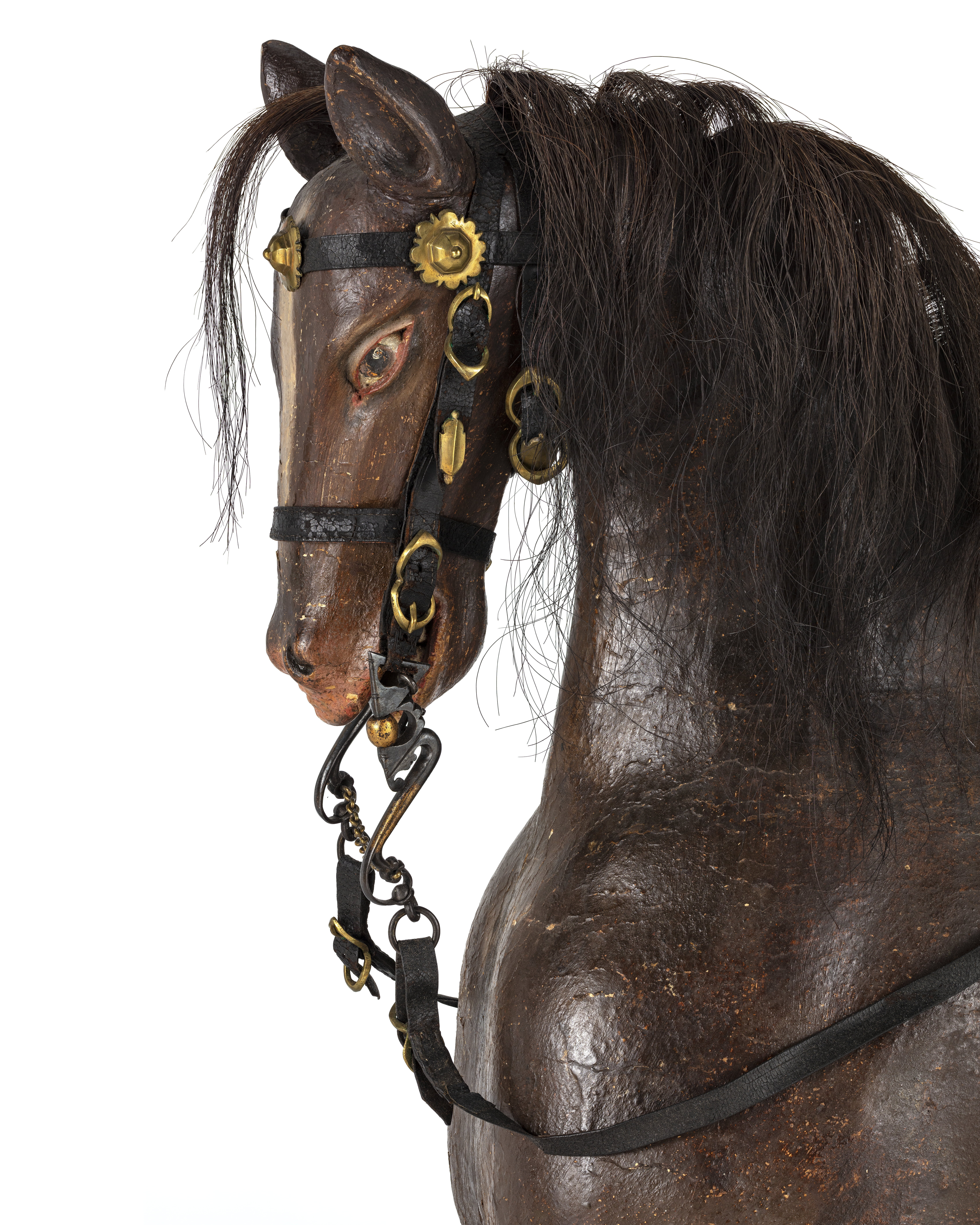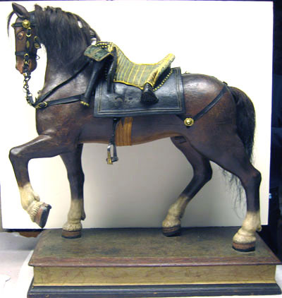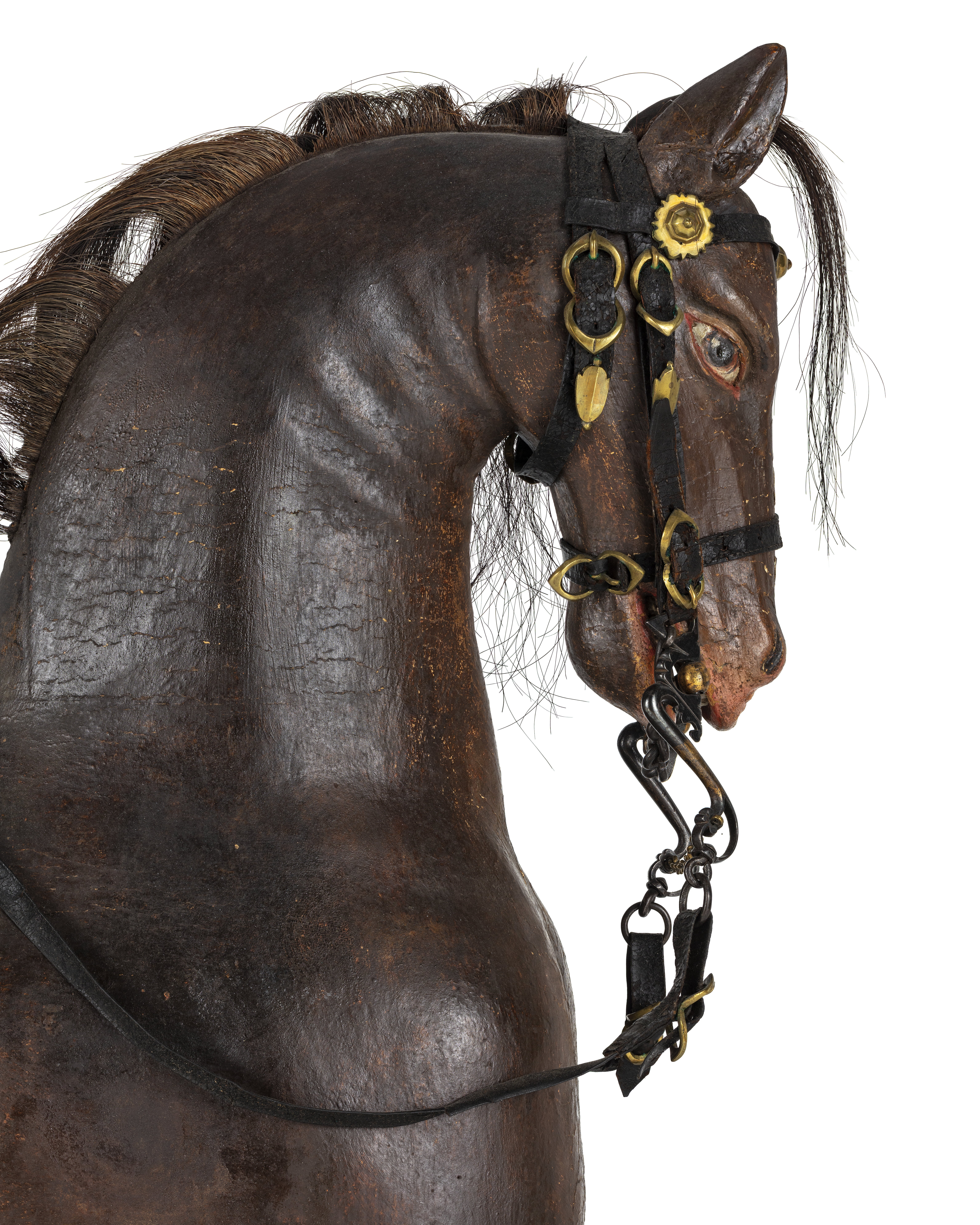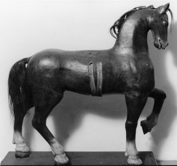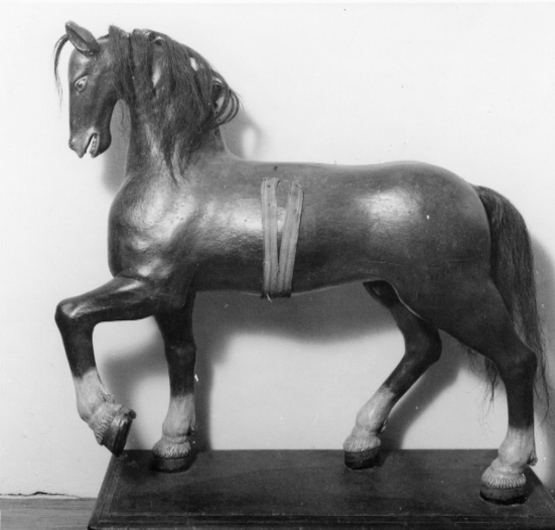 Snidad i trä, mycket detaljrik och naturtrogen. Benen tyckts tillverkade som lösa delar. Hästen återgiven som i rörelse med vänster framben lyft och höger bakben framför det vänstra. På en ljus kredering en brun bemålning i olika nyanser, nertill vit med ljusbrunbeige hovar och svart hästskor. Ljusare magparti. Svans av tagel, upptill brunt nedåt övergående i svart. Detaljrikt skuret huvud med målade ögon, läppar, tänder och mule. Manen brunaktig och av tagel. Hästen fast monterad på ett rektangulärt podium, l 960 b 377 h 148. Av furu med rikt profilerade kanter. Målat i mörkgrönt, gulvit marmorerat och mörkbrunt.