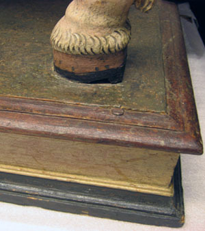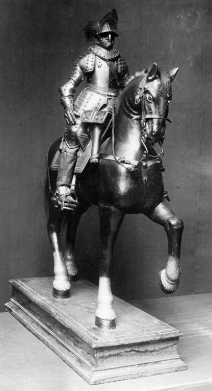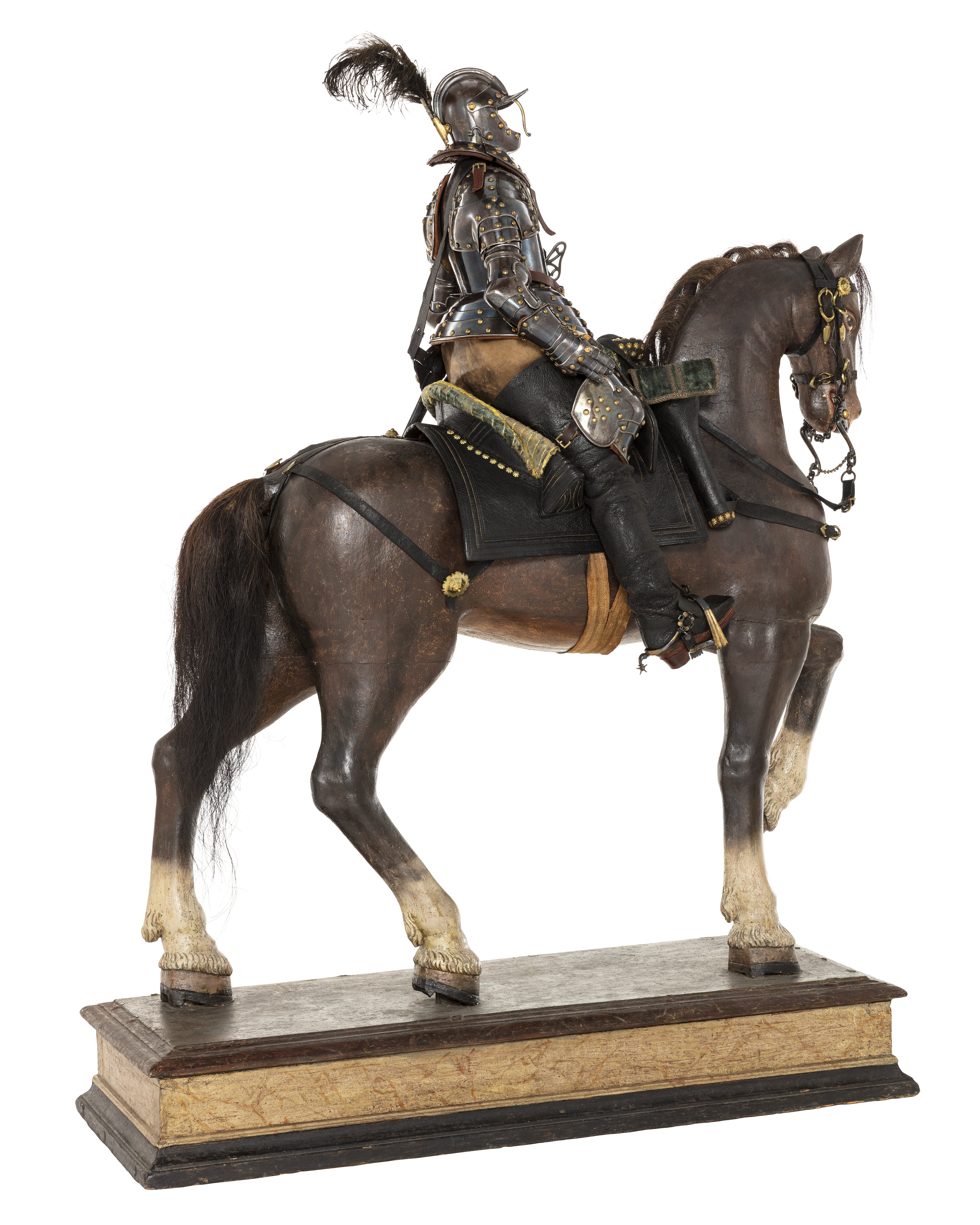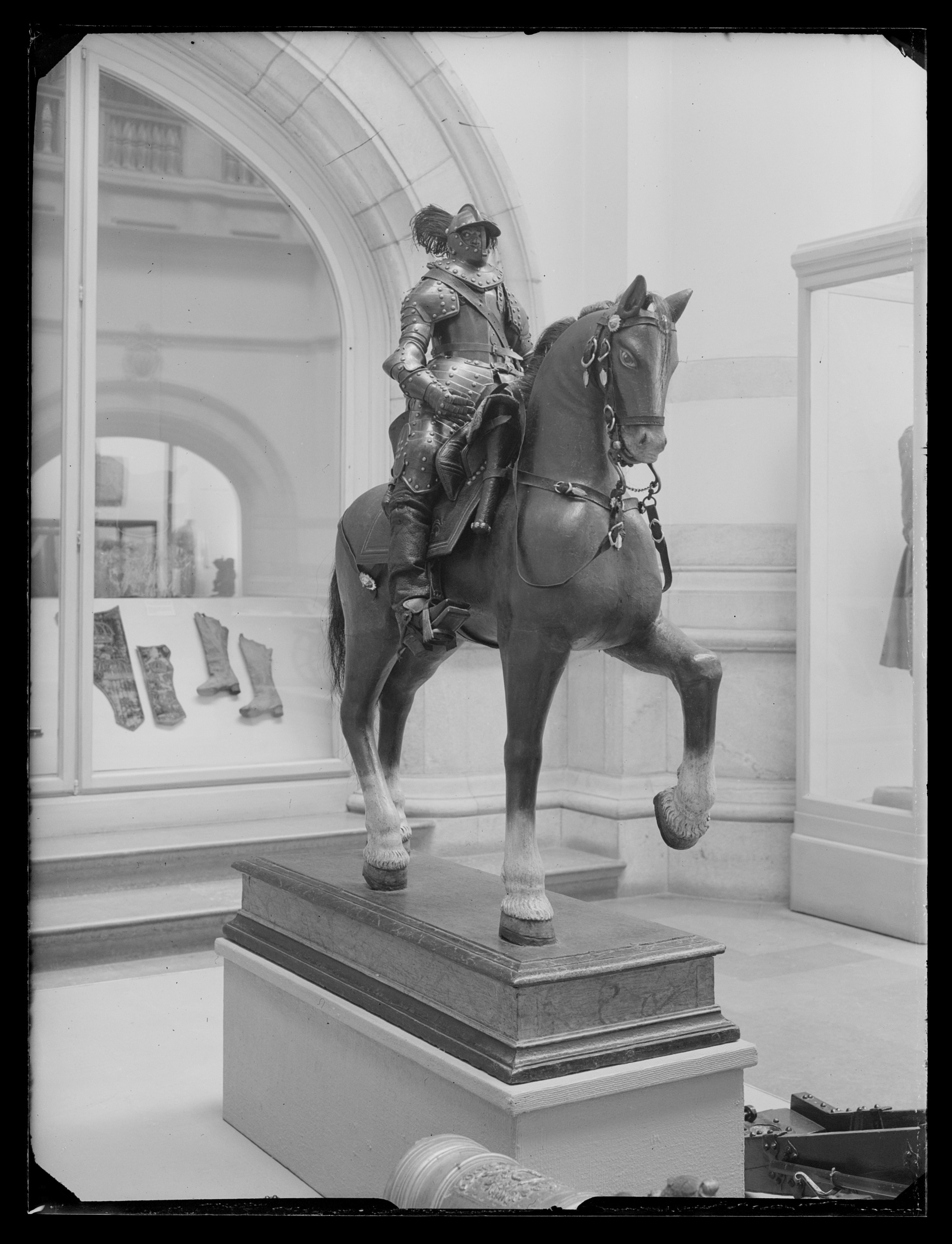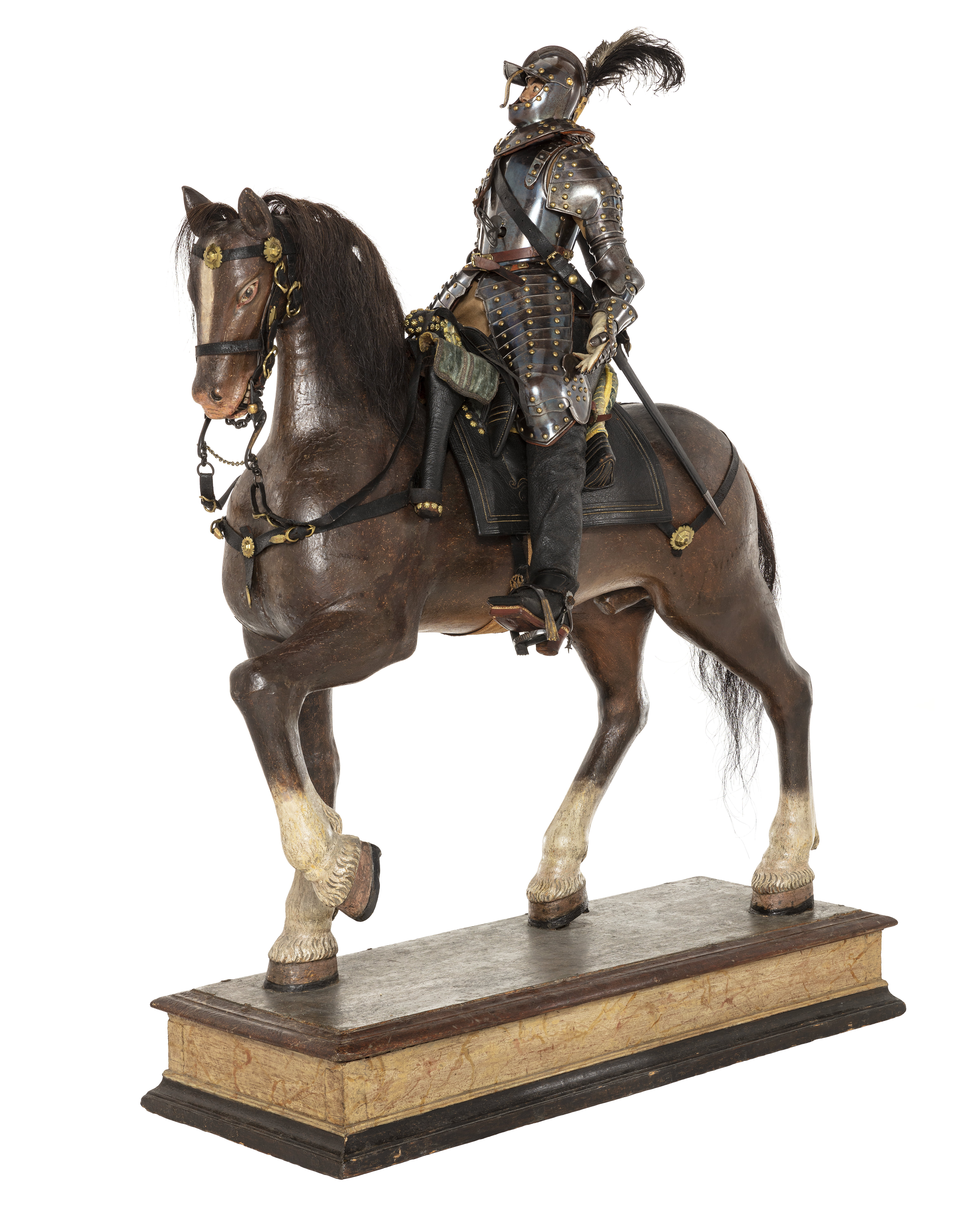 Snidad i trä, mycket detaljrik och naturtrogen. Benen tyckts tillverkade som lösa delar. Hästen återgiven som i rörelse med vänster framben lyft och höger bakben framför det vänstra. På en ljus kredering en brun bemålning i olika nyanser, nertill vit med ljusbrunbeige hovar och svart hästskor. Ljusare magparti. Svans av tagel, upptill brunt nedåt övergående i svart. Detaljrikt skuret huvud med målade ögon, läppar, tänder och mule. Manen brunaktig och av tagel. Hästen fast monterad på ett rektangulärt podium, l 960 b 377 h 148. Av furu med rikt profilerade kanter. Målat i mörkgrönt, gulvit marmorerat och mörkbrunt.