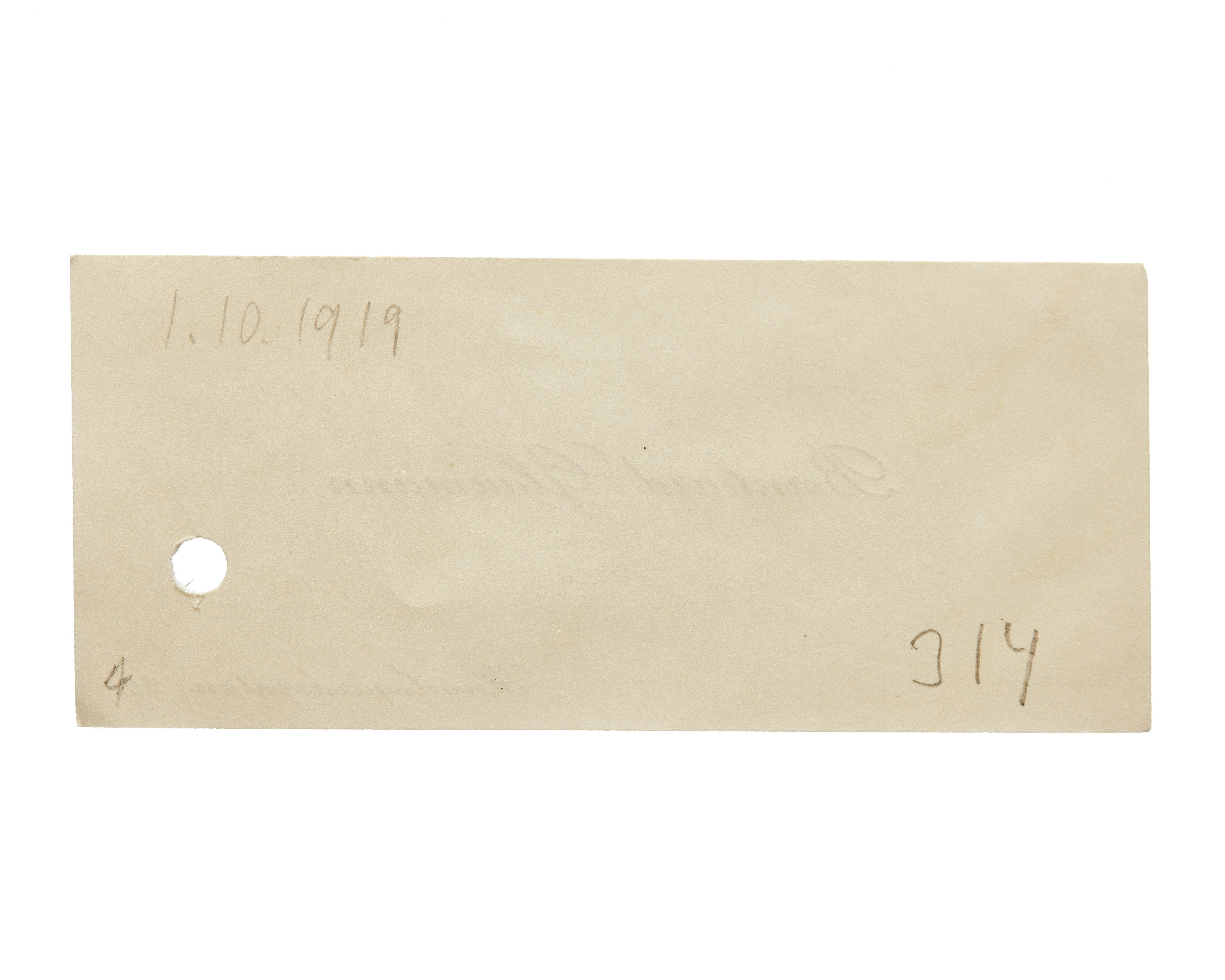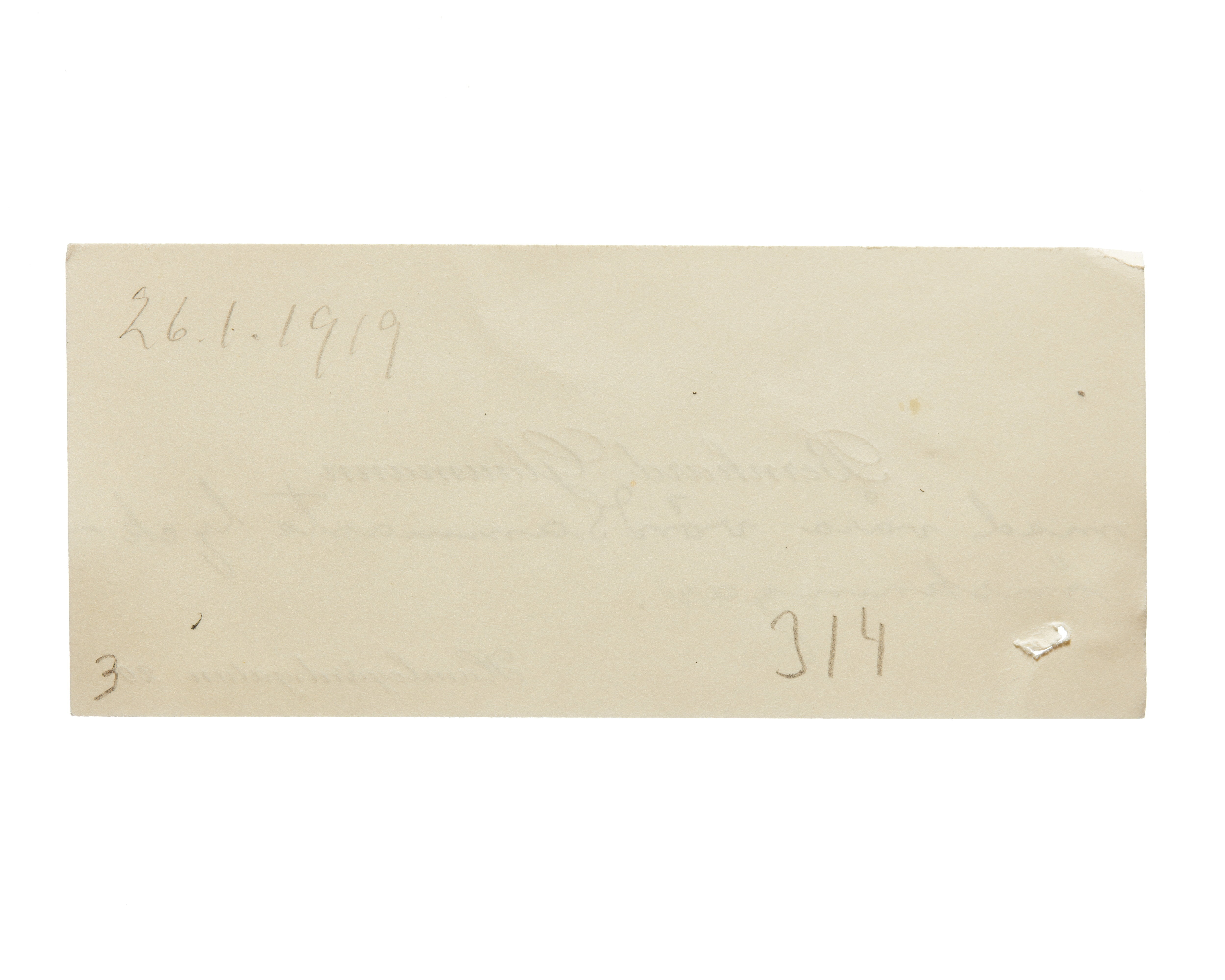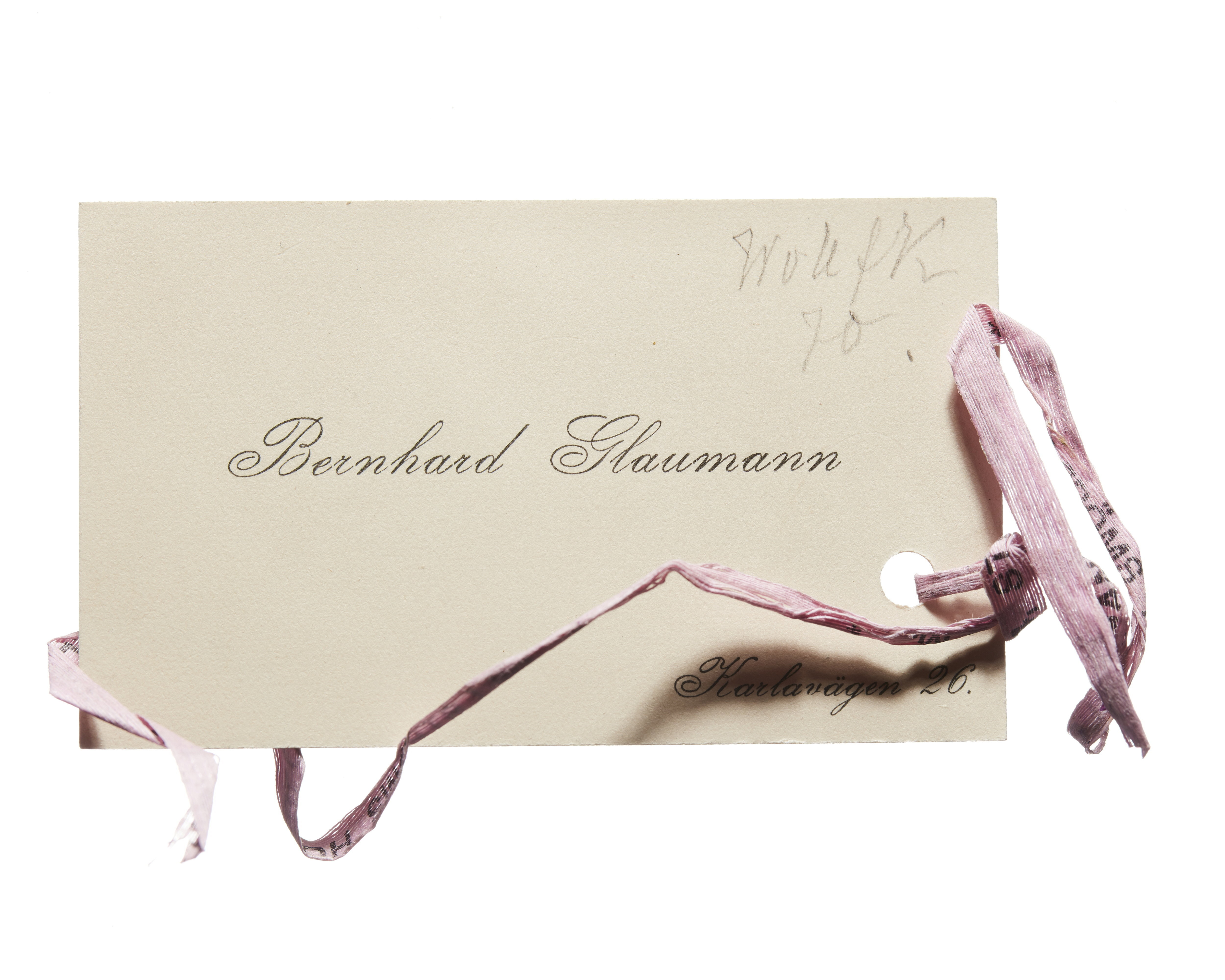 Fem visitkort från kamrer Bernhard Glaumann. Första kortet är utan datum, adress (nedre vänstra hörnet) Humlegårdsgatan 20, (nedre högra hörnet) Stockholm. Andra kortet daterat 01.10.1914 samt med rosa band, adress (nedre högra hörnet) Karlavägen 26. Tredje kortet daterat 26.01.1919, handskrift (nedanför namnet) "Med våra vördsammaste lyckönskning". Fjärde kortet daterat 01.10.1919. Femte kortet är utan datum, handskrift (baksidan) ".....".