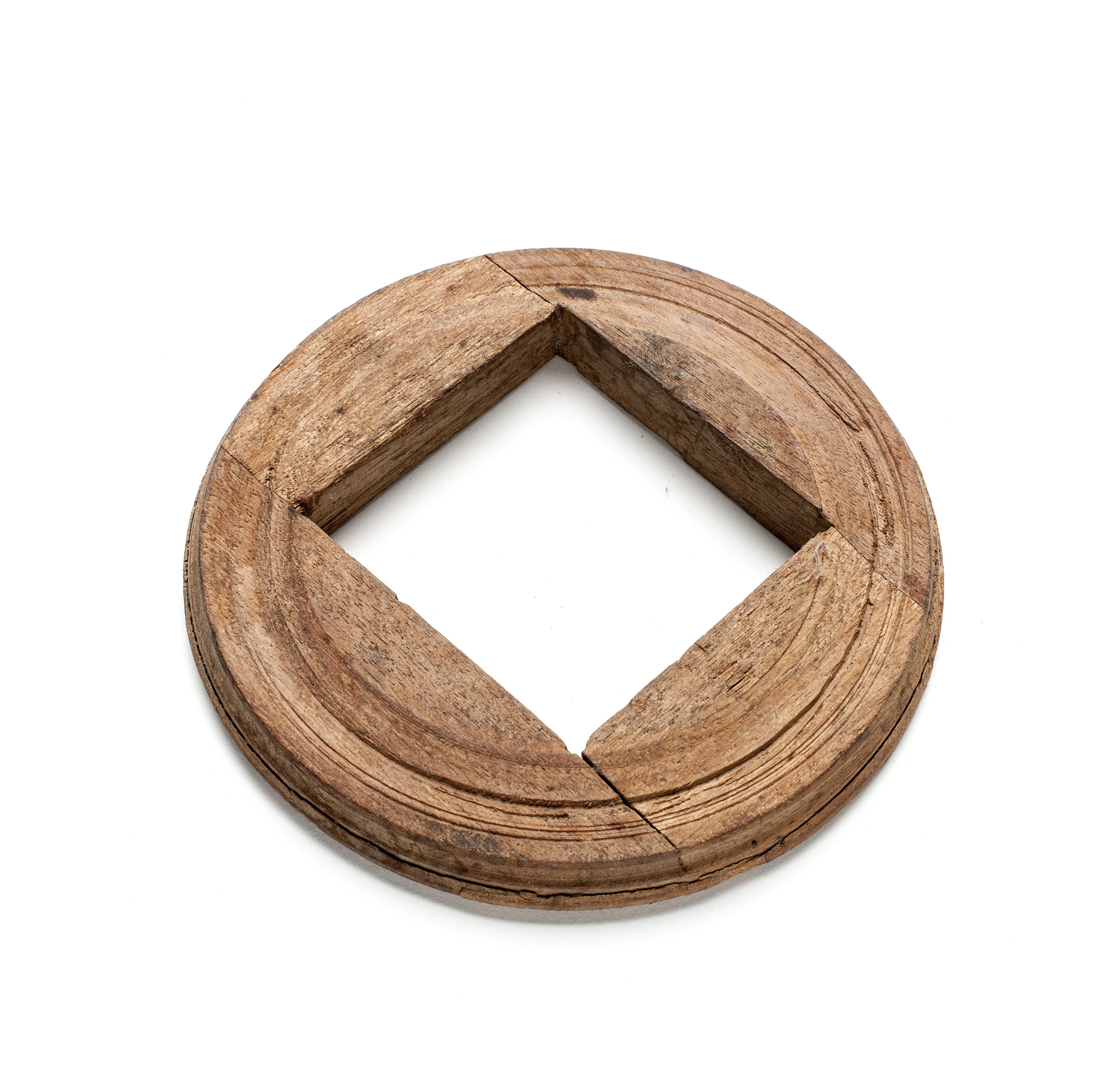 Något kupig med profilerad kant. Stort hål i mitten, 60,5 * 66 mm.