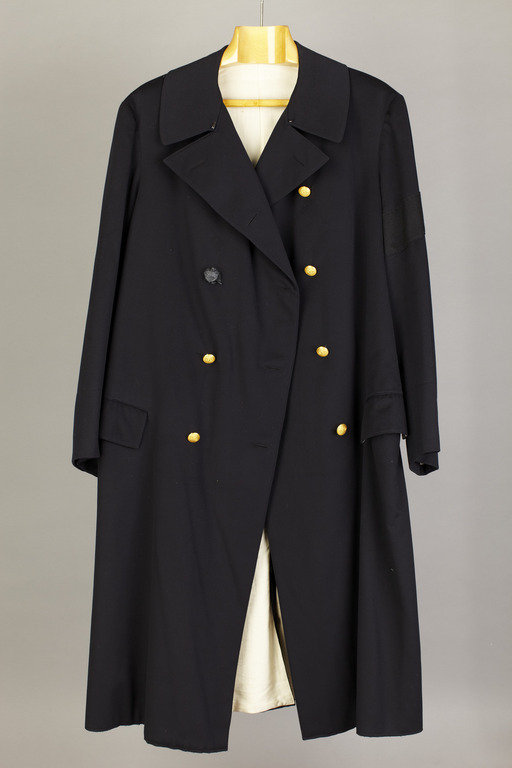Kappa av mörkblått kläde, tillskuren utan livsöm, fällkrage, dubbelknäppning, 2x4 knappar, förgyllda med krona, d:22 mm, firmamärke: "M. PETTERSON // STOCKHOLM". Stolpfickor med ficklock. Ärmen utan slag. Skjörtsprund knäpppt med fem tygklädda knappar, d: 14 mm. Tvådelad slejf med två knappar, förgyllda med krona, d: 22 mm. Foder av vit bomull. I bröstgickan vit vaxduksetikett med firmamärke: "J. M: Janson & Wallgren, Stockholm // Atachén E. Hallin // 1899. Upptill utefter foderkanten tryckknappar för foder(?). På v. ärm en svart armbindel. Buren av Eric Adolf Hallin (1870-1965) som tjänstgorde 1897 som attaché vid UD, sänd till Berlin, utnämndes till kammarherre 1912. Gåva av arvingarna, Maria Dyrssen, Hans Eric Hallin, Aina Enhörning och Louise Peyron enligt brev 1965-06-02 från Claes Peyron.