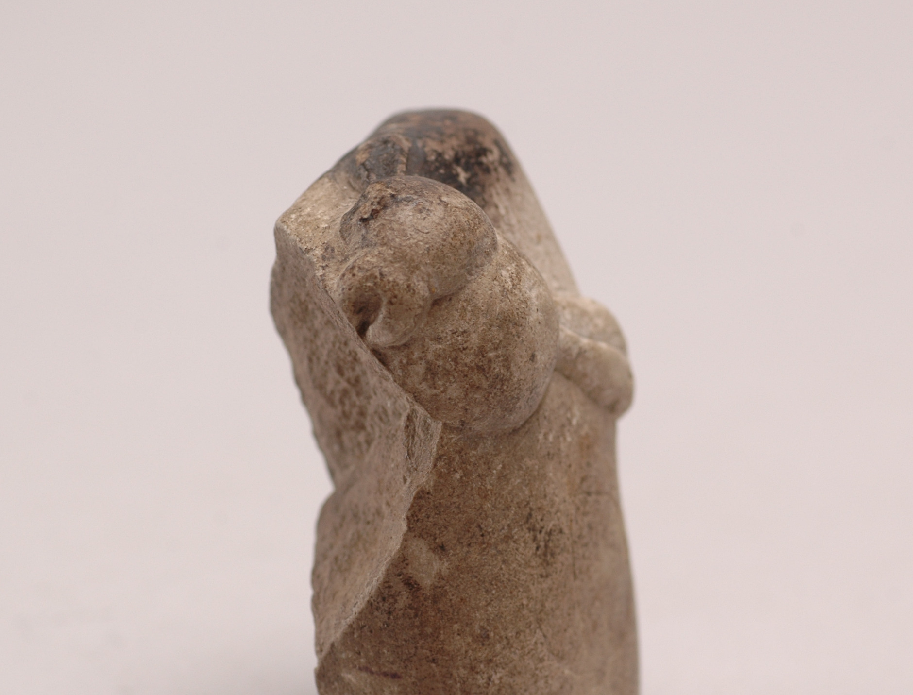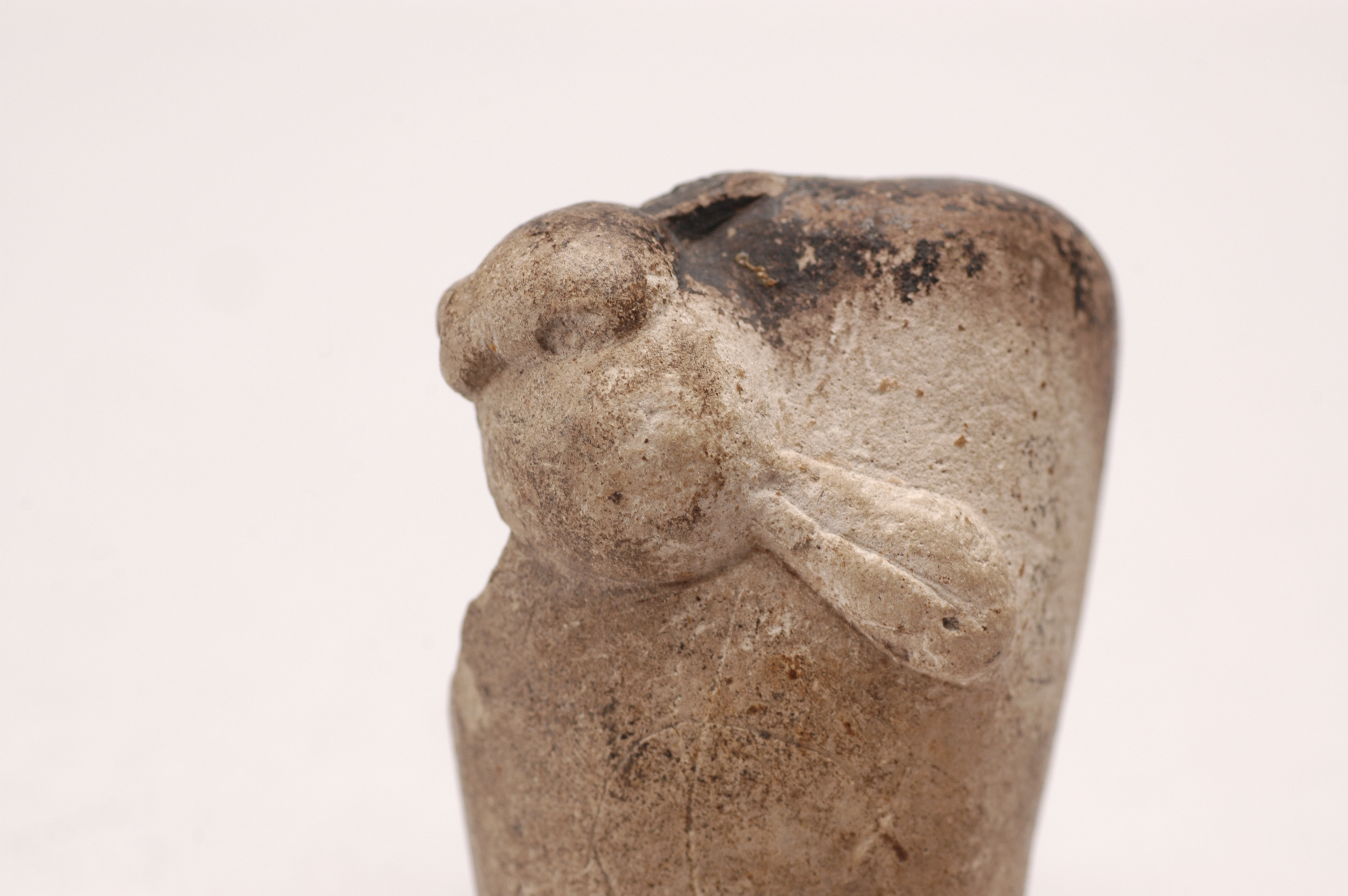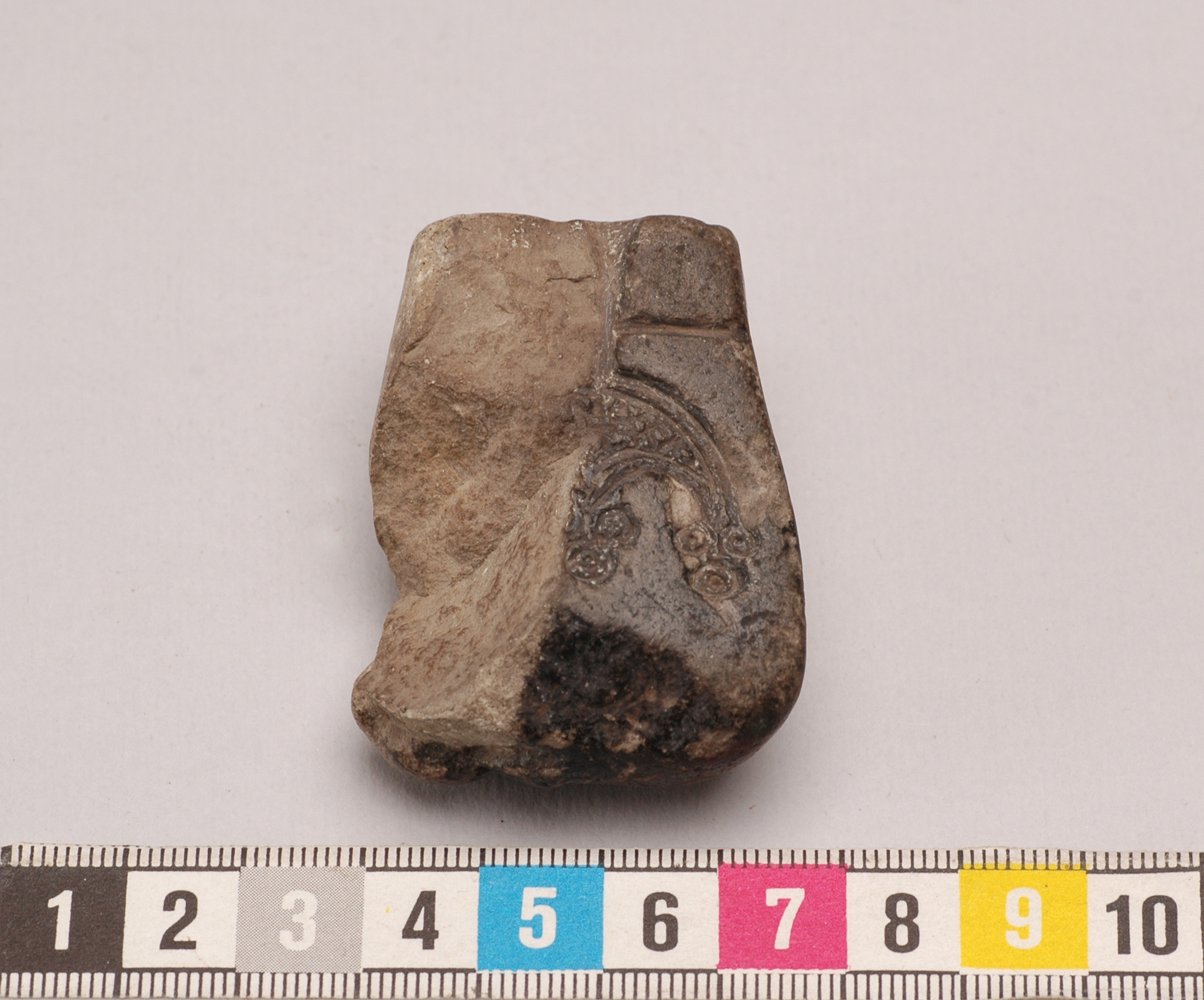 Något skadad gjutformshalva i sten med utvändigt skulpterad djurfigur. Formen avsedd för ett treuddigt hänge