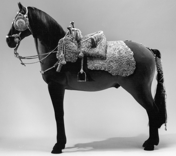 - Sadel af blått sammet med stigbyglar (hvaraf en söndrig) och sadelknapp förgyllda, stickad i sätet med guld- och silfver lisquard; sadelkåpan och schabraket rikt ornerade samt broderade i guld och silfver; förbygeln virkad af guld af guld, silfver och silke; stegläderne af samma arbete; svanskappan lika broderad med sadeln; hölstren af blått saffian med kappor, stickade med guld- och silfvergaloner, remmarne med 2 söljor af jern; husen öfver pistolkapporna af blått turpinette med en guld och silfverspets sydda med guld och silfvergalon med 4 qvastar af guld, silfver columbine och blått silke; ryggstycket af samma arbete som förbygeln med en bukett af af guld, silfver och diverse färgade band; hufvudställ och handtygel lika med förbygeln; betselstängerna förgyllda; handtygel af guld, silfver och blått silke med en tofs och en knapp; 1 par blinder lika med sadeln. Alla beslagen, bestående af pucklor, söljor, tampar och styfter, hvilka i äldre inventarier uptagits såsom varande af 6 lödigt silfver, hafva efter skedd undersökning befunnits bestå af förgylld metall. (Sadeln upgifves vara skänkt från Frankrike.)