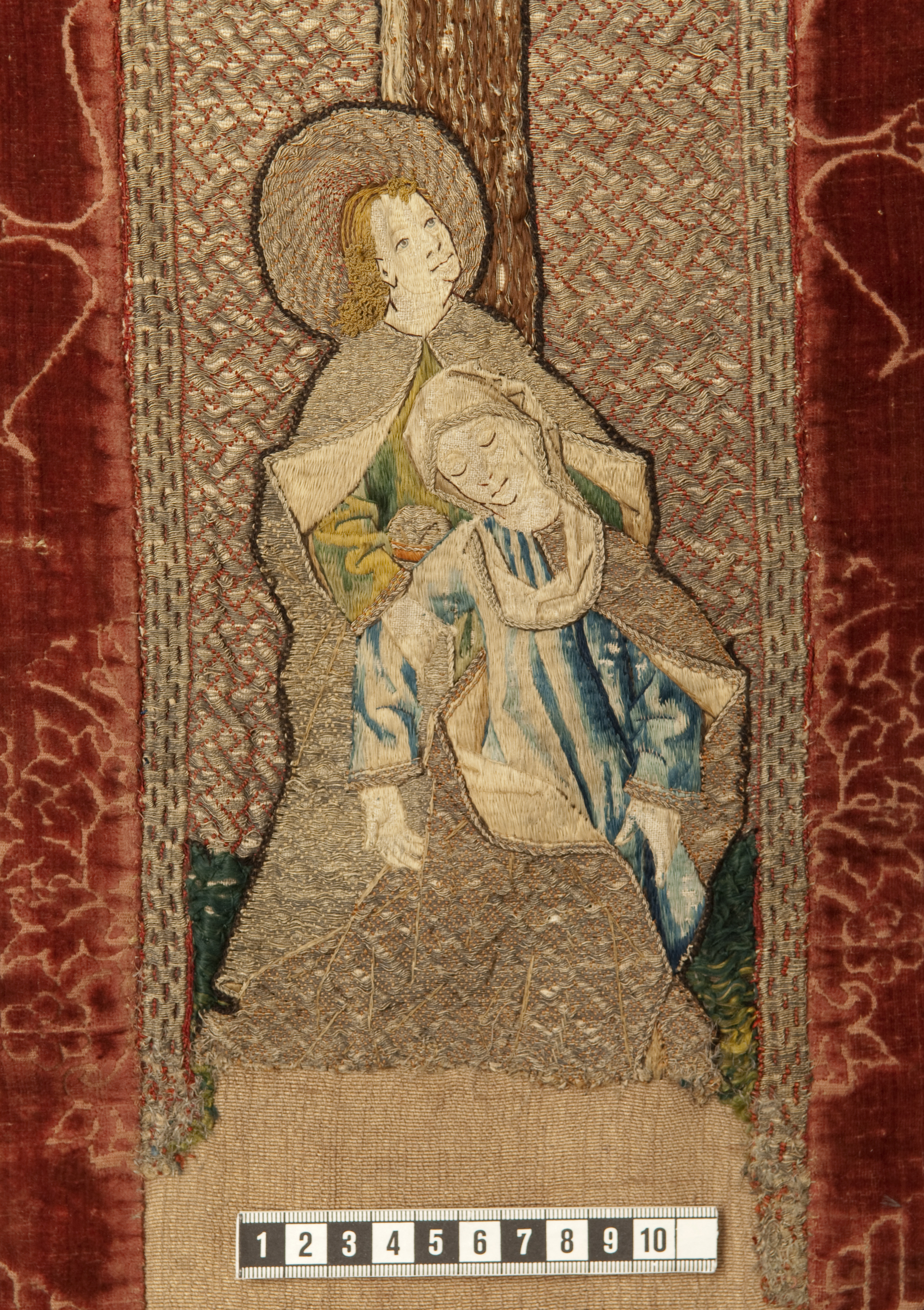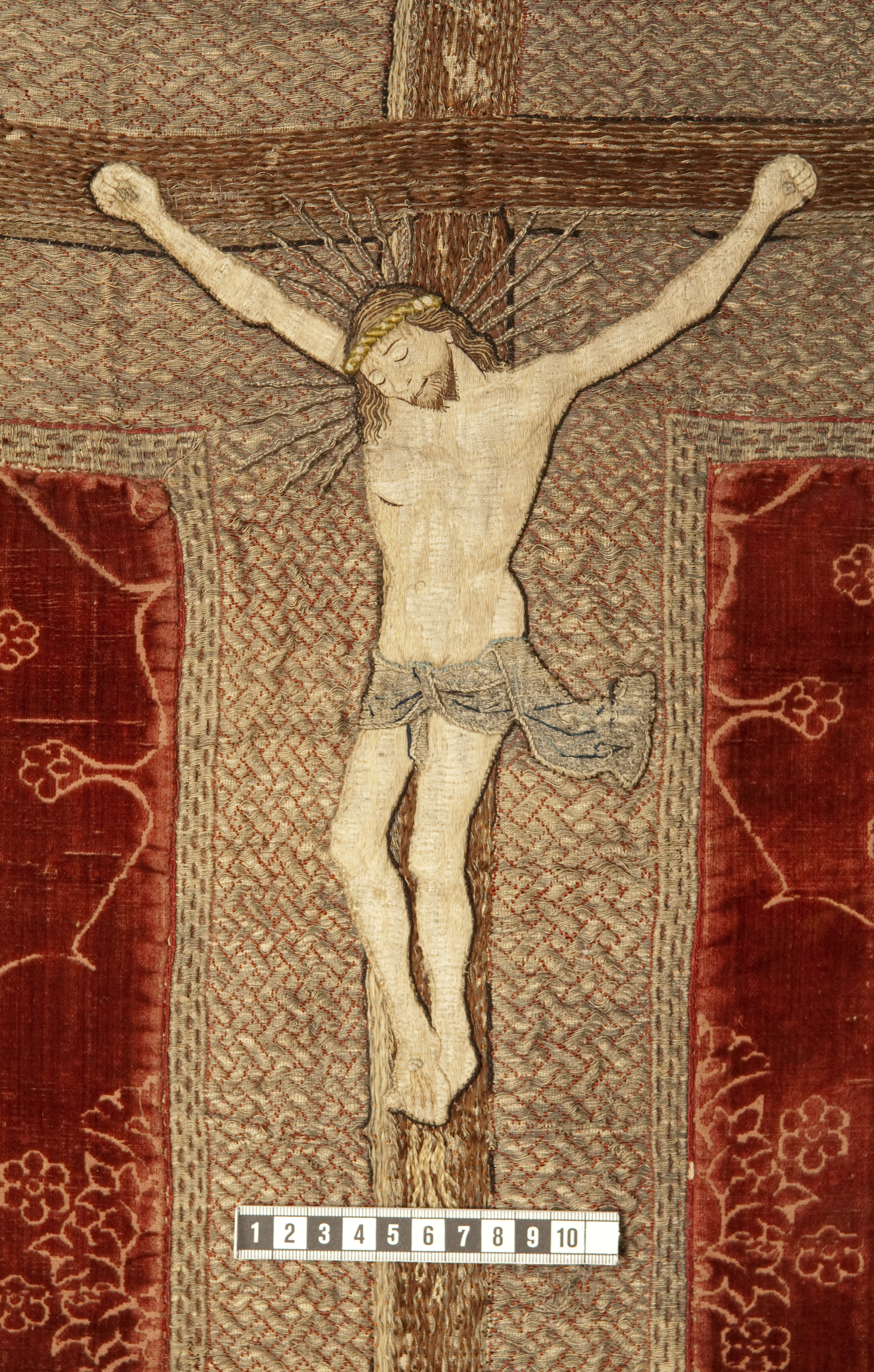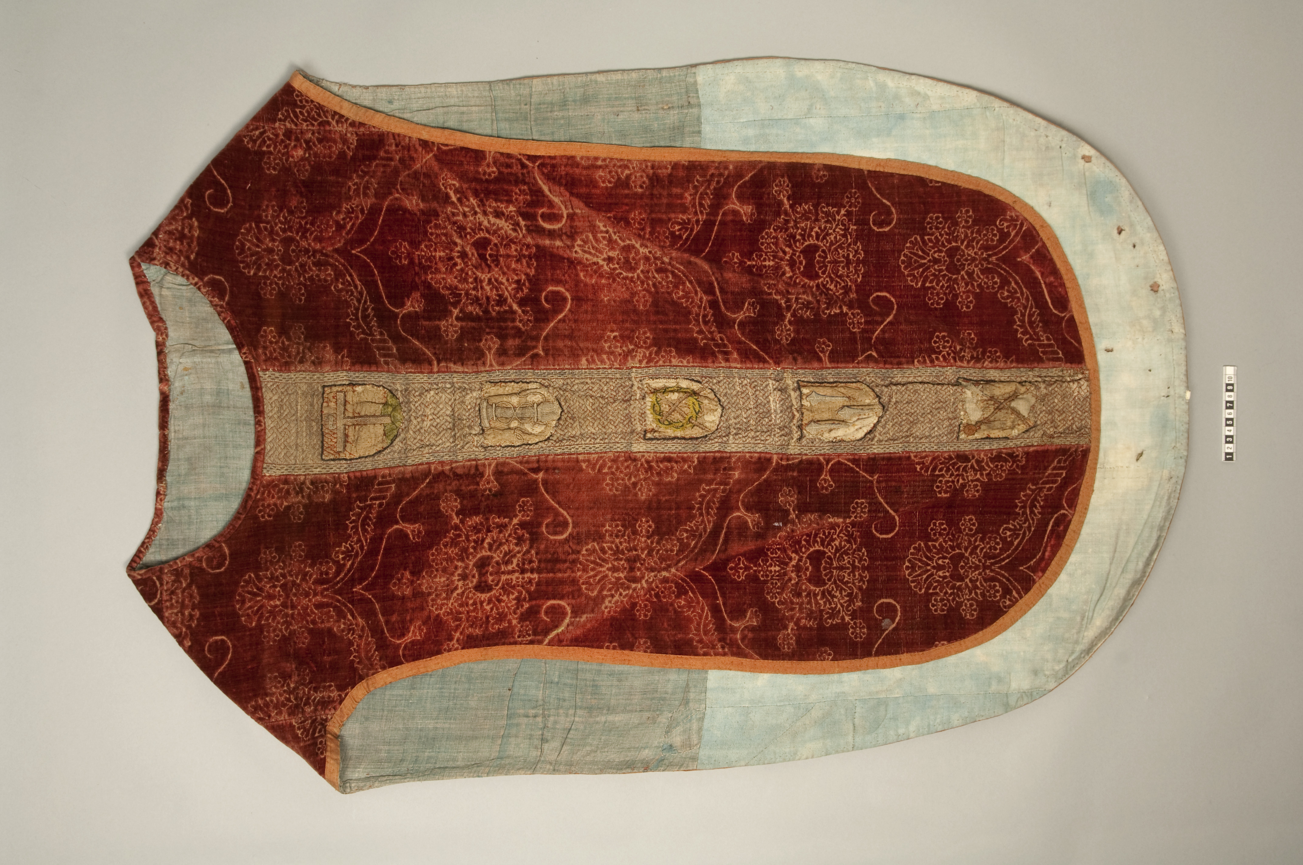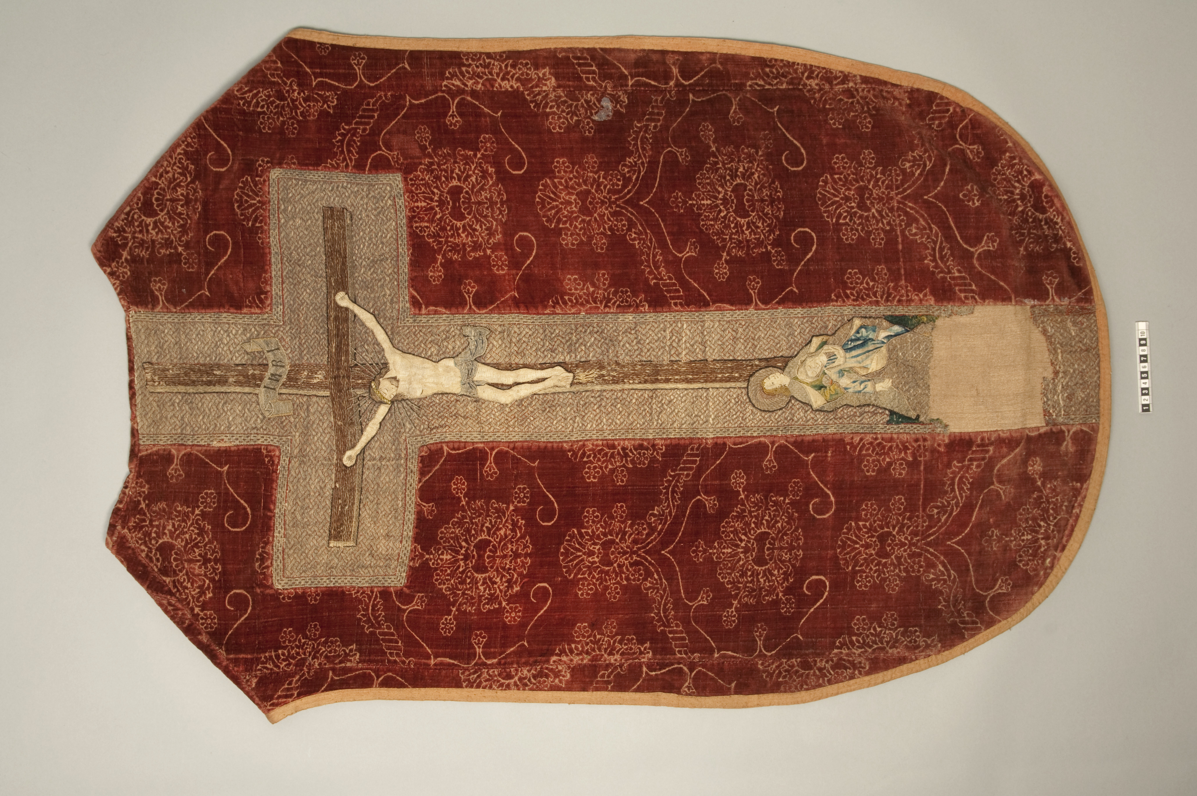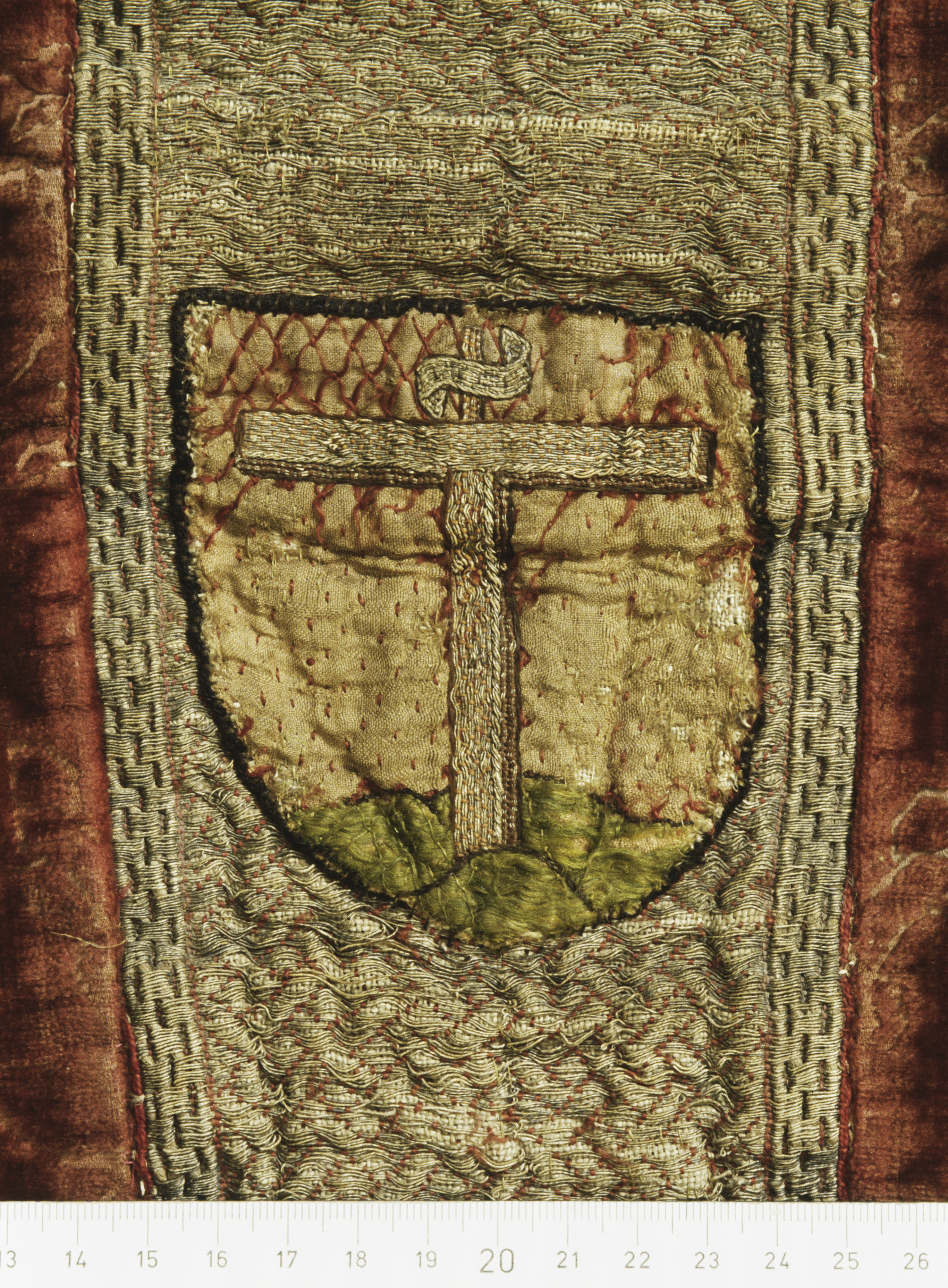 Röd granatäppelsammet, broderad korsformig besättning, Kristi vapen, Lübeck, lärftfoder. Inköpt 1910.