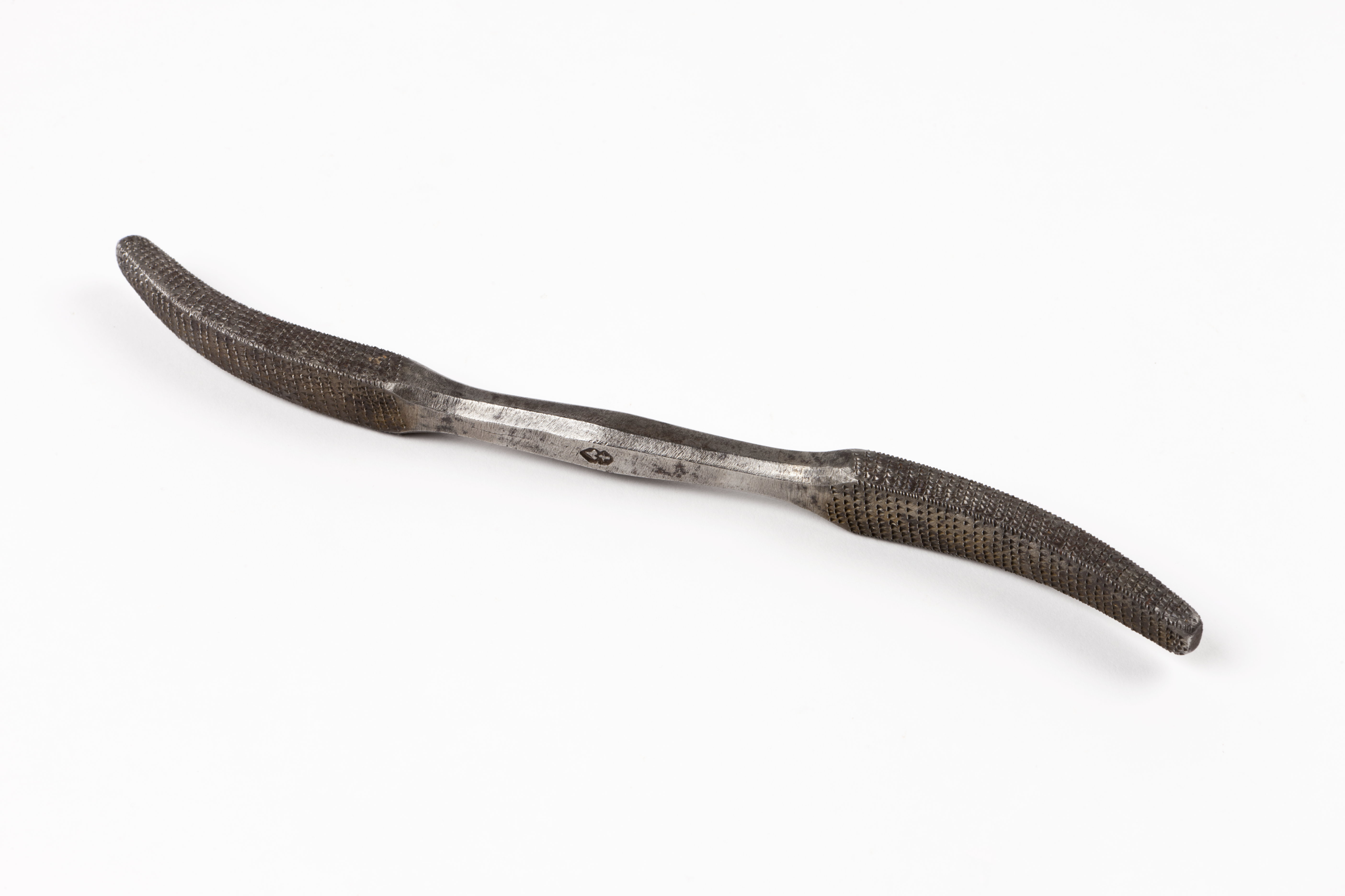 Stämpel: hjärta under likarmat kors. Fyrsidigt skaft med avfasade kanter mellan två raspar, grovt huggna på alla fyra sidorna.