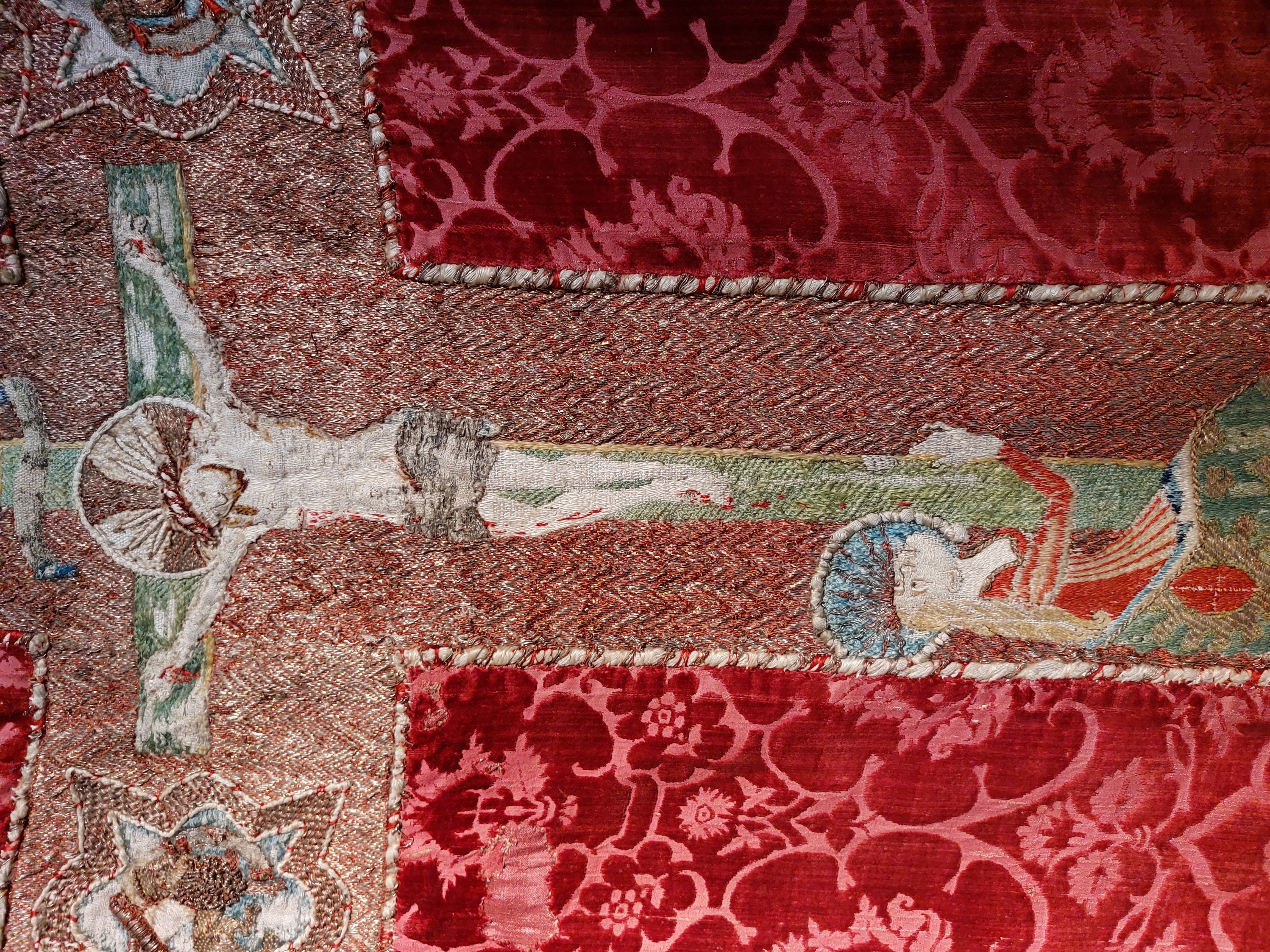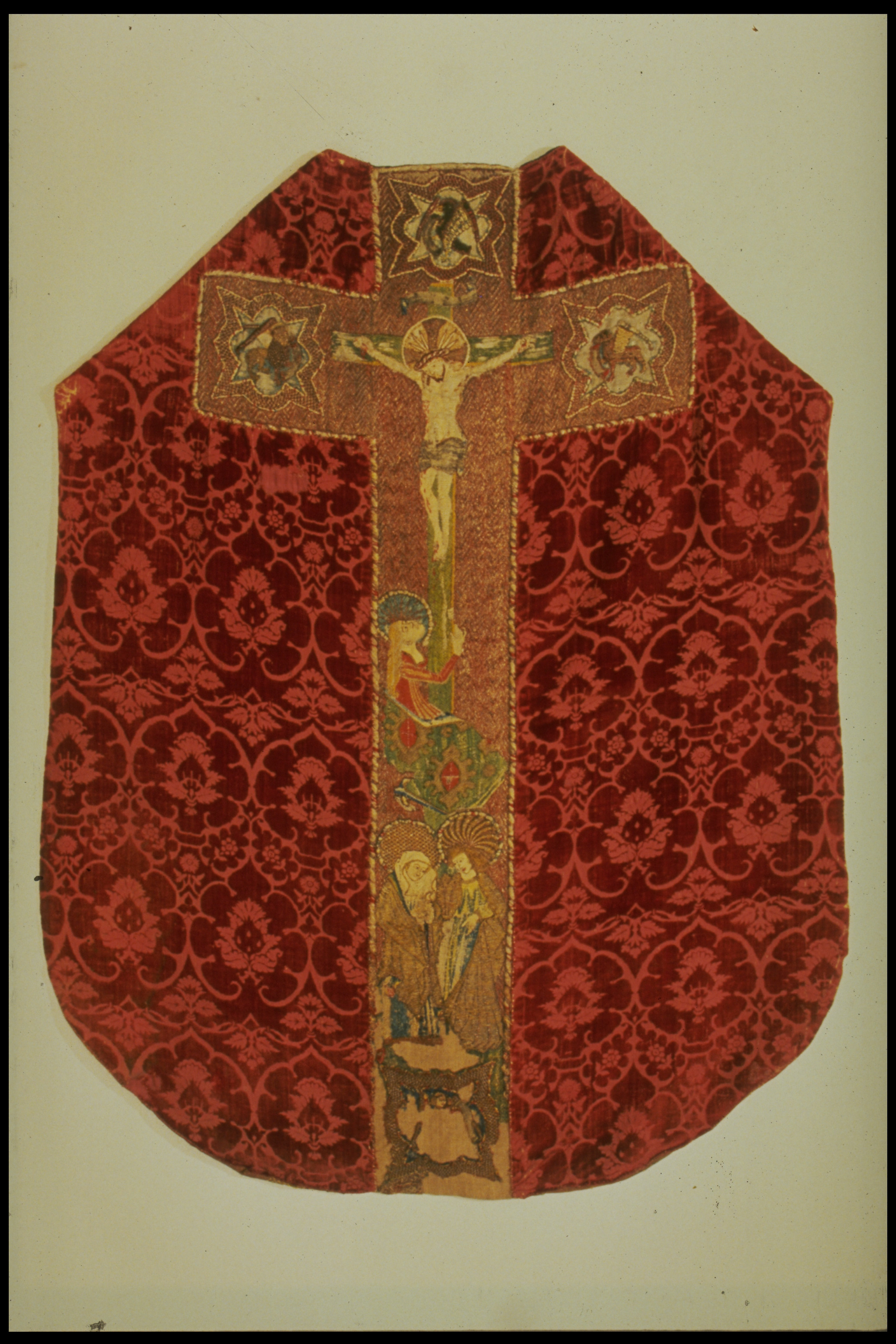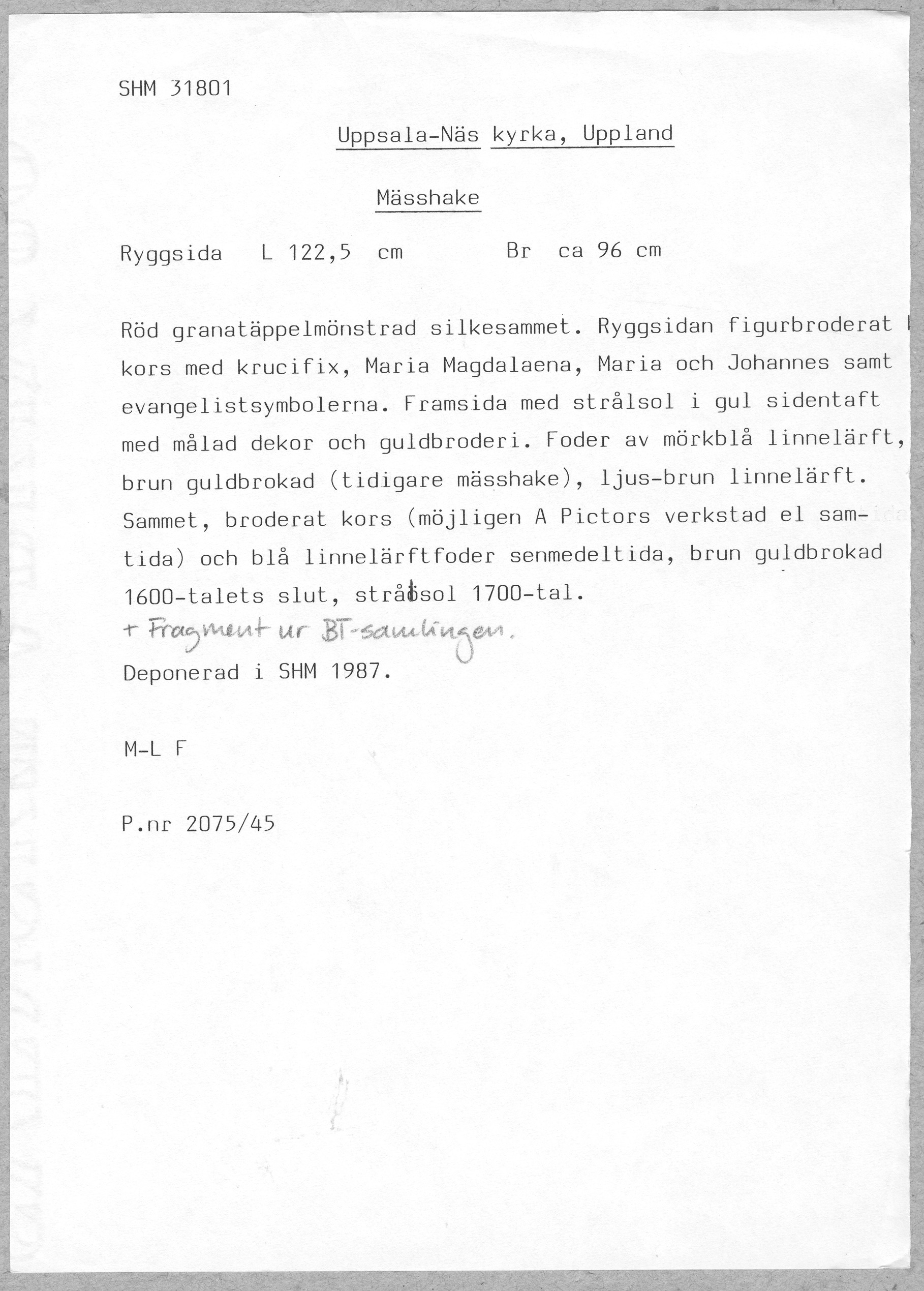 Röd granatäppelsammet, figurbroder, strålsol, brun guldbrokad med rankmönster från tidigare mässhake. Samt fragment ur BT-samlingen. Deponerad i SHM 1987.
