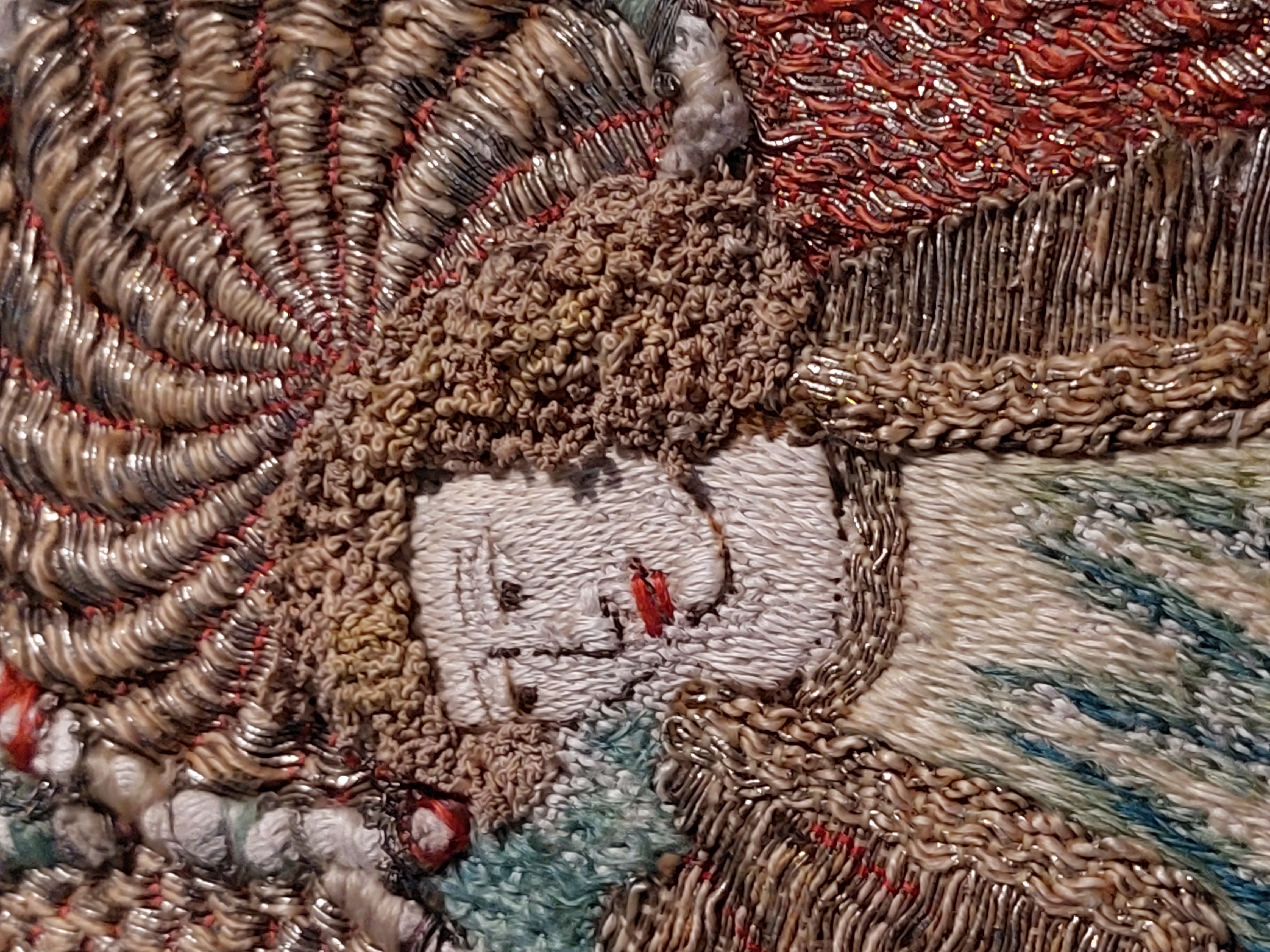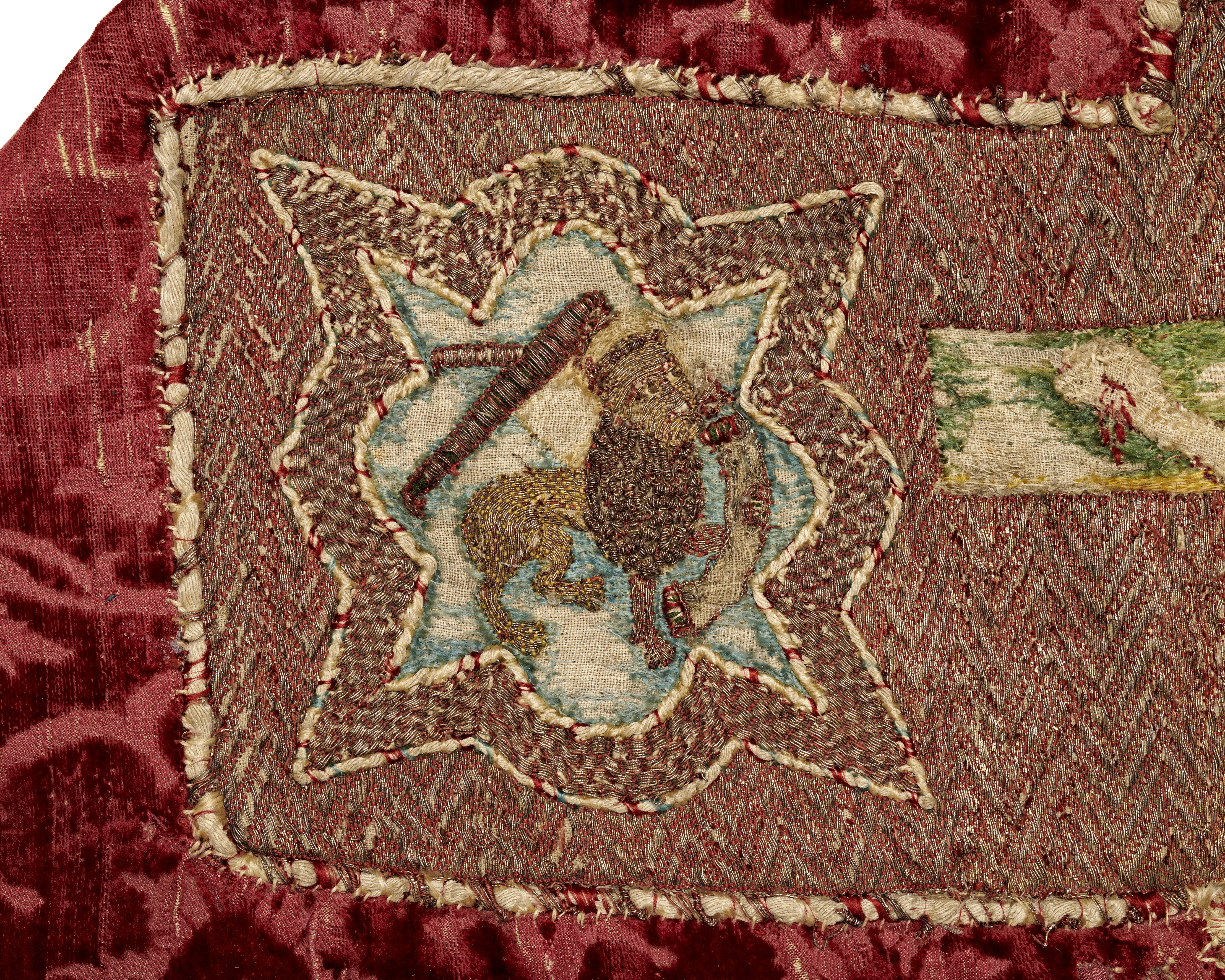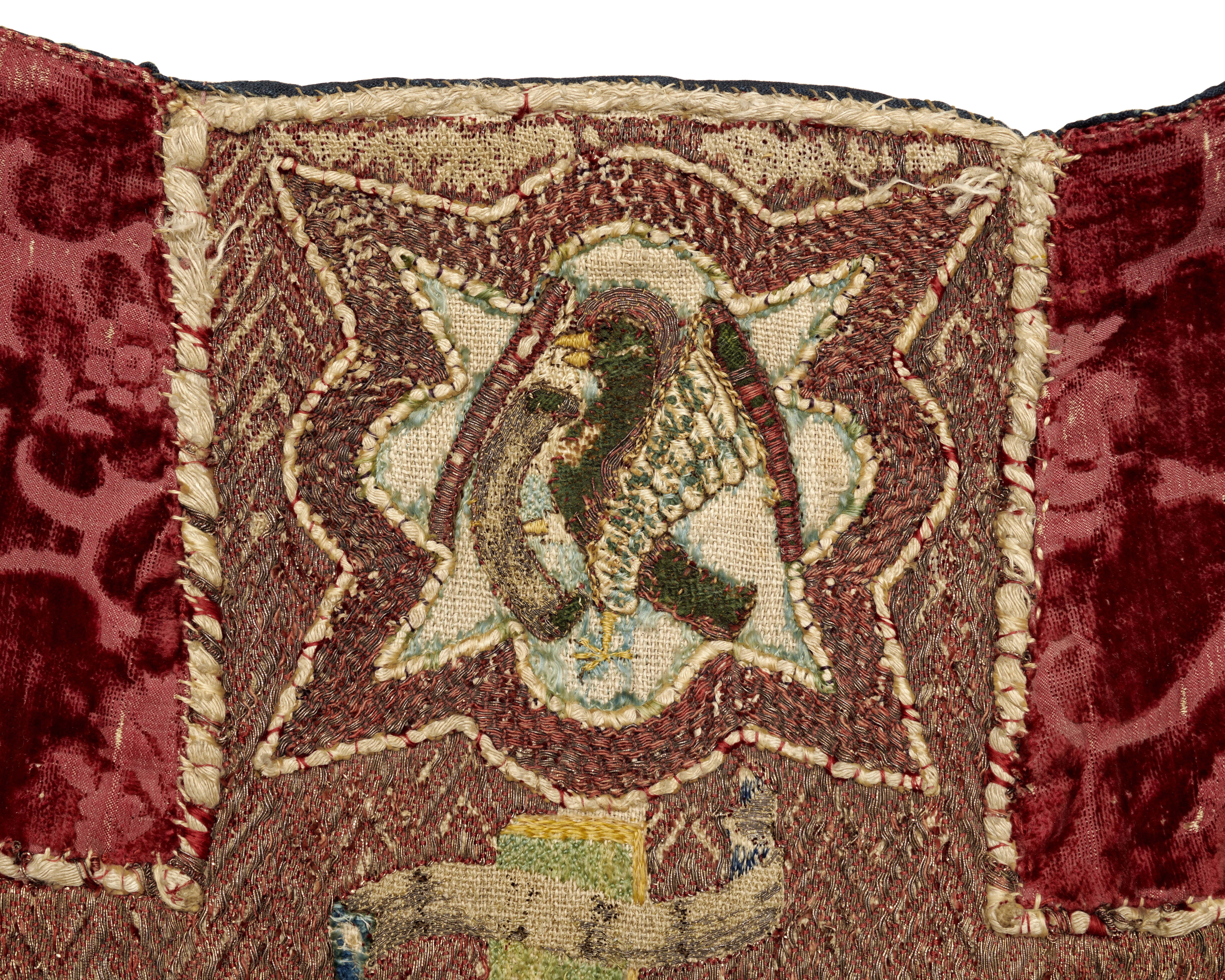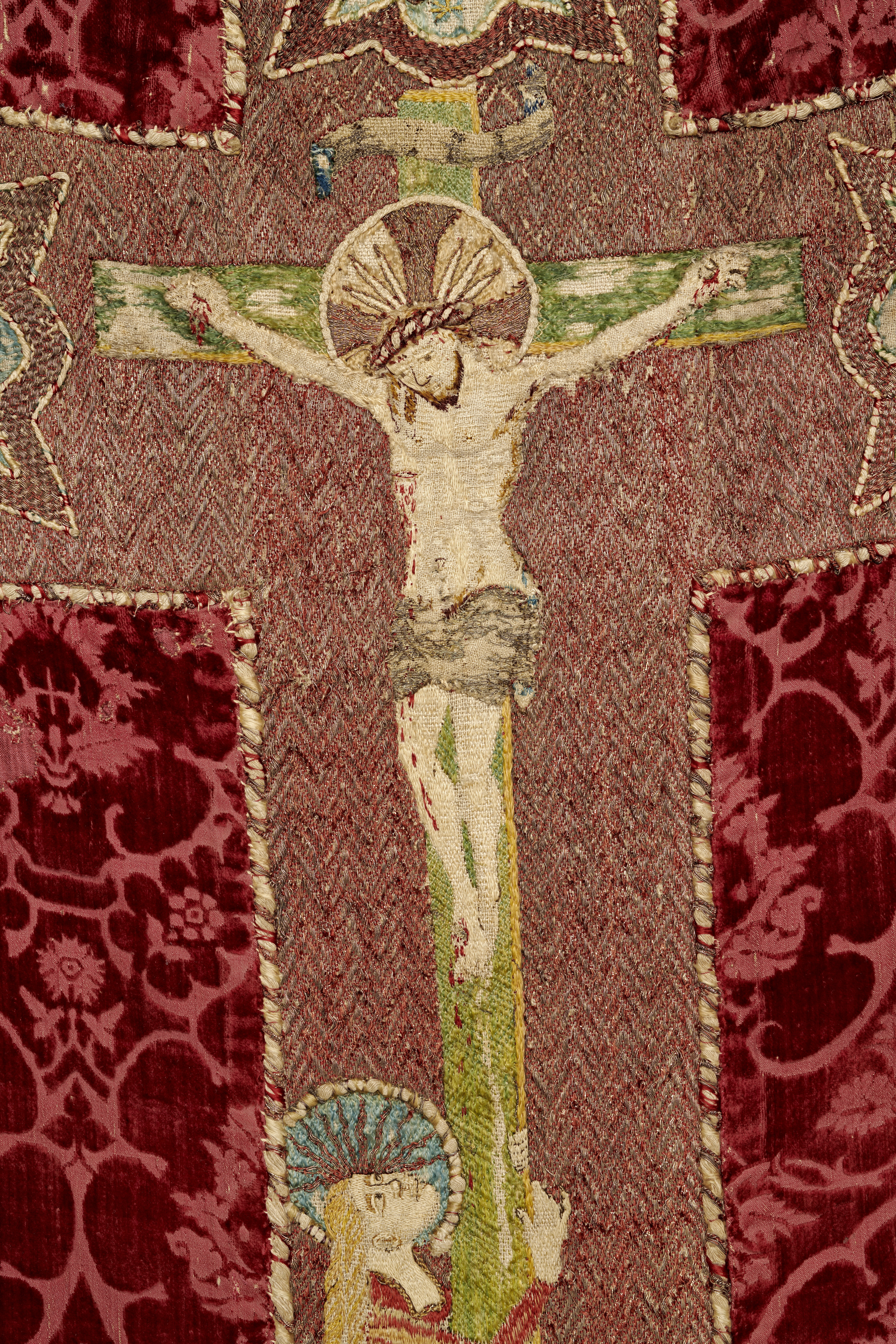 Röd granatäppelsammet, figurbroder, strålsol, brun guldbrokad med rankmönster från tidigare mässhake. Samt fragment ur BT-samlingen. Deponerad i SHM 1987.