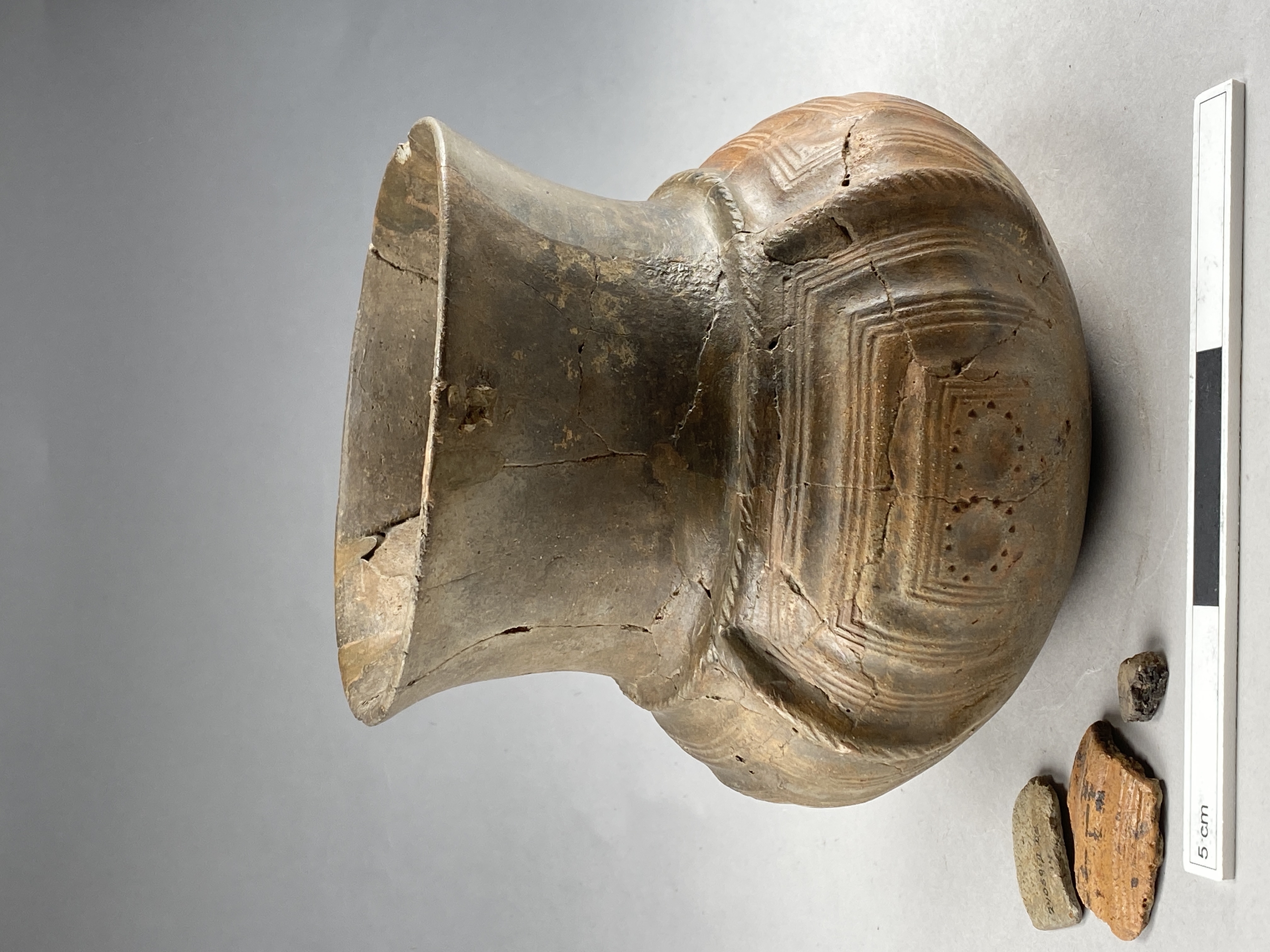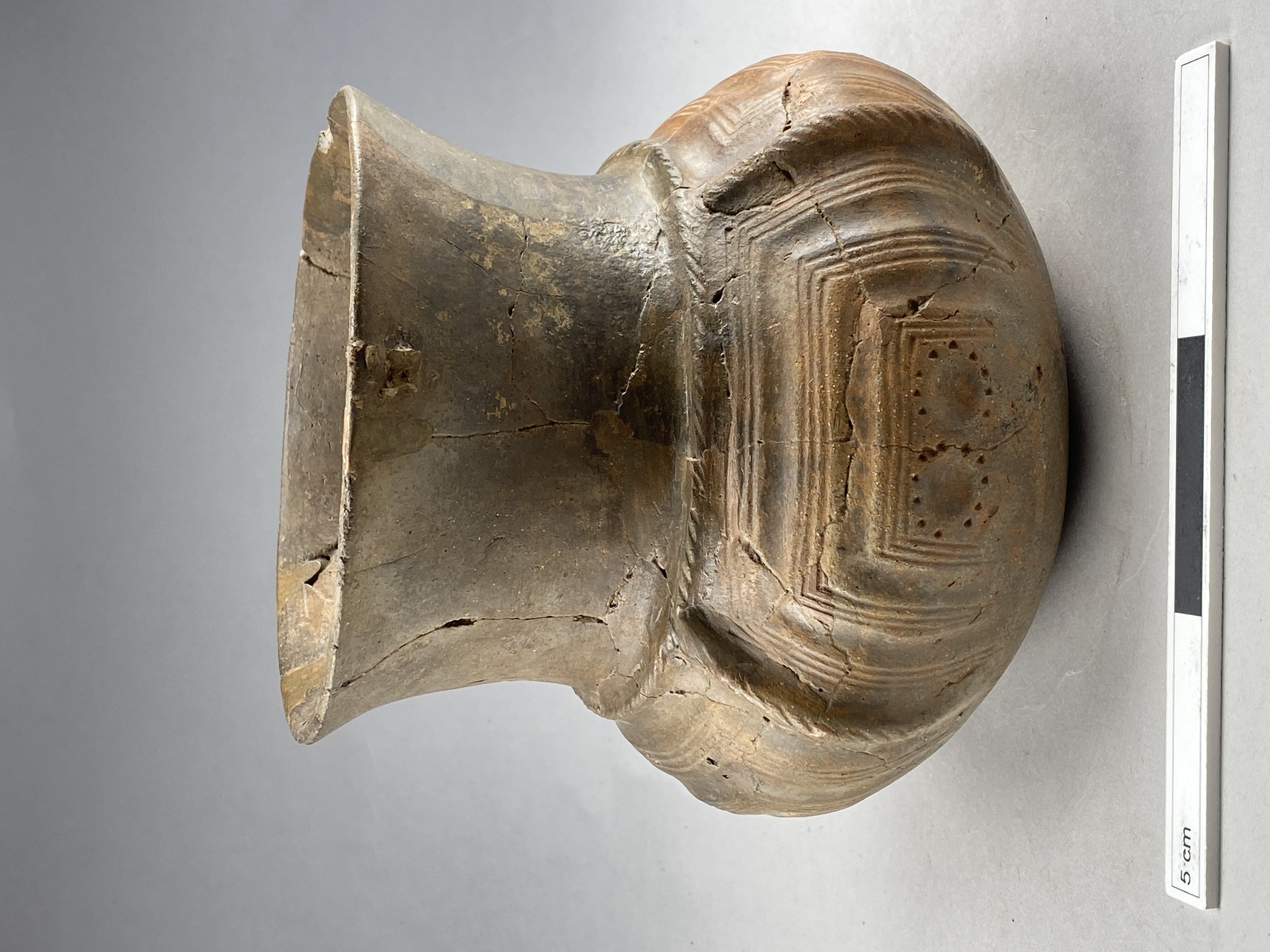 Keramikkärl vars botten är svagt rundad, dekorerat med en horisontell, snedstreckad vulst, från vilken utgår fyra vertikala dylika. Mellan dessa ett mönster av tre breda, grund hålkälar och en rund grop, omgiven av instuckna punkter. De upphöjda partierna mellan hålkälarna och kring mittfältet med gropen är dekorerade med tre parallella linjer.