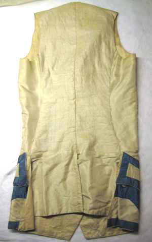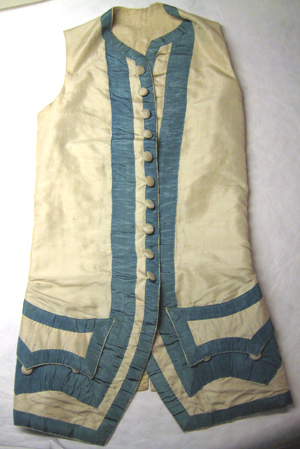 Väst av vitt siden, kantad- och garnerad med blå sidenband. Västen består av två framstycken av vitt siden samt två bakstycken av vitt linne med sprund i rygg- och i sidosömmarna, l. 172-180 mm. Sprunden bildar två skörtkappor av vitt siden. Västen har en knäppning mitt fram bestående av tio knappar, klädda med vitt siden. På vardera framstycke sitter en horisontellt iskuren ficka. Fickorna har breda ficklock, kantade med blå sidenband. De knäpps med hjälp av tre små knappar klädda i vitt siden. Västen är på insidan fodrad med vit linnelärft. På fodret, uppe vid höger axel står en märkning med svart bläck: "B 11". Västen är tillsammans med gnr 17/46-17/192 en gåva av H.M Konungen (Gustaf V) genom chefen för Kungl. Husgerådskammaren 1917.